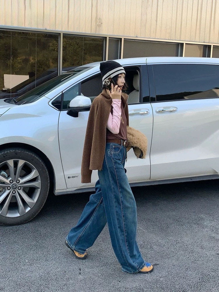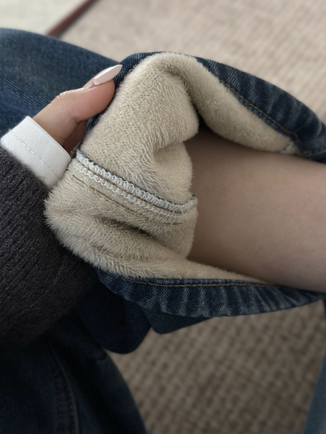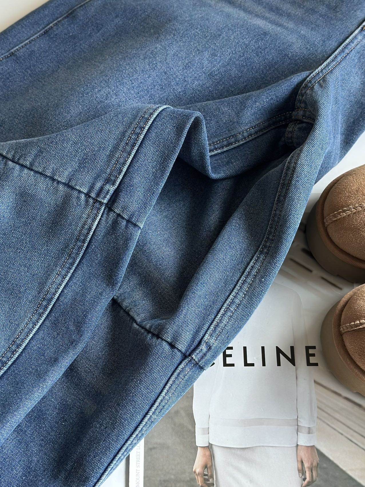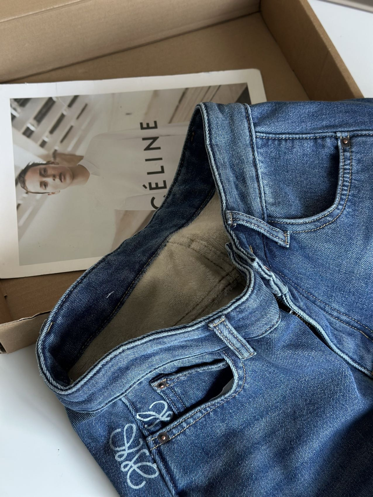 依旧保持着弯刀裤的利落线条,这也是它区别于普通加绒牛仔裤的关键。