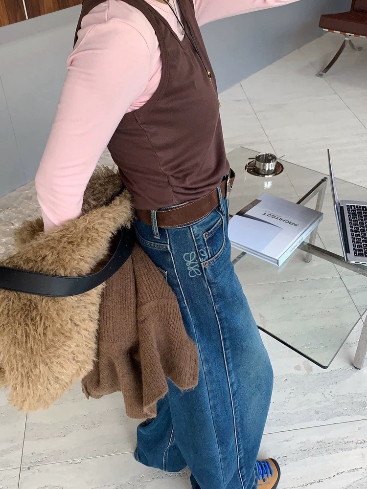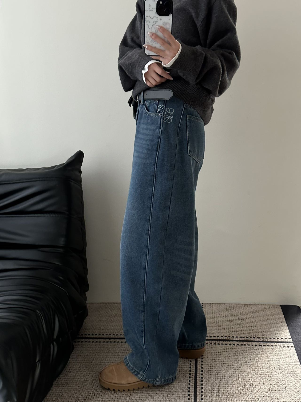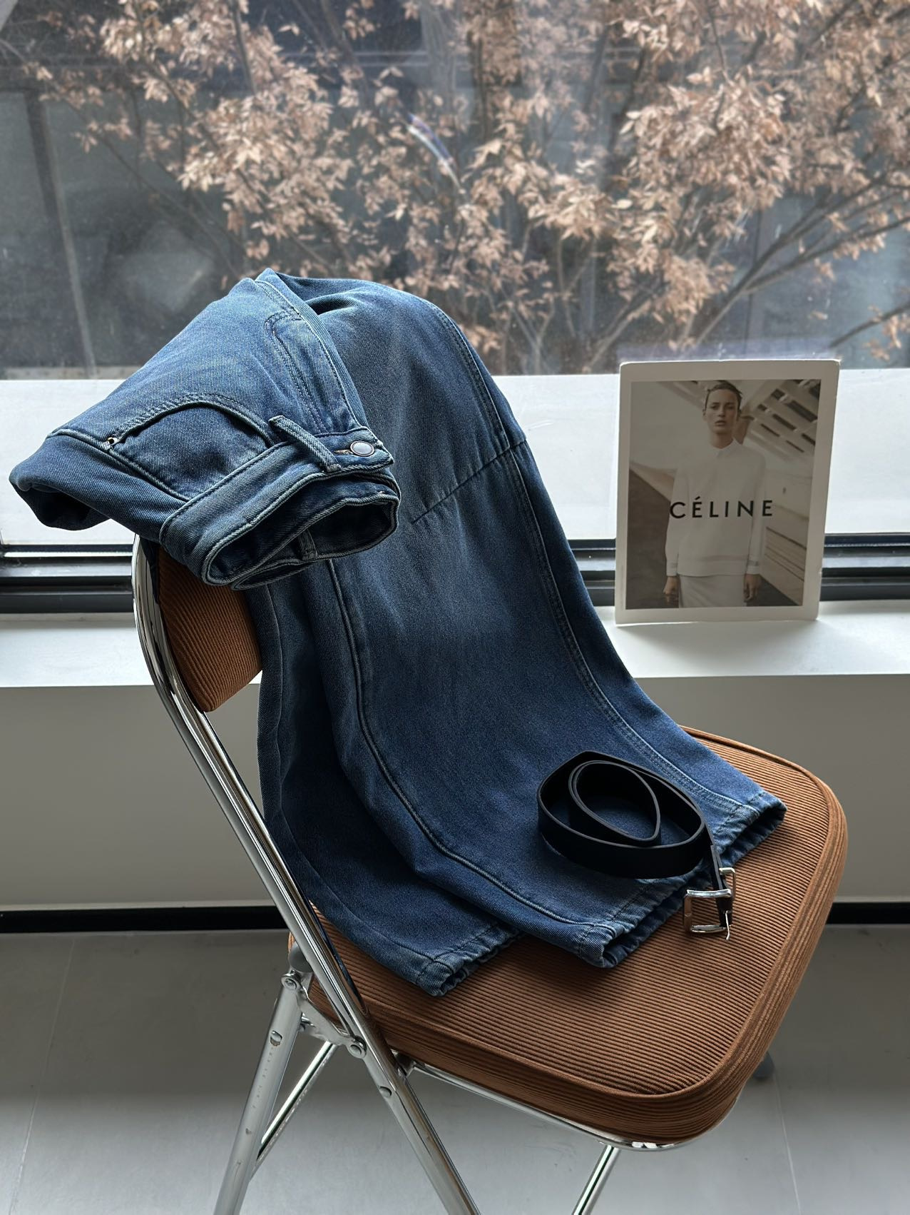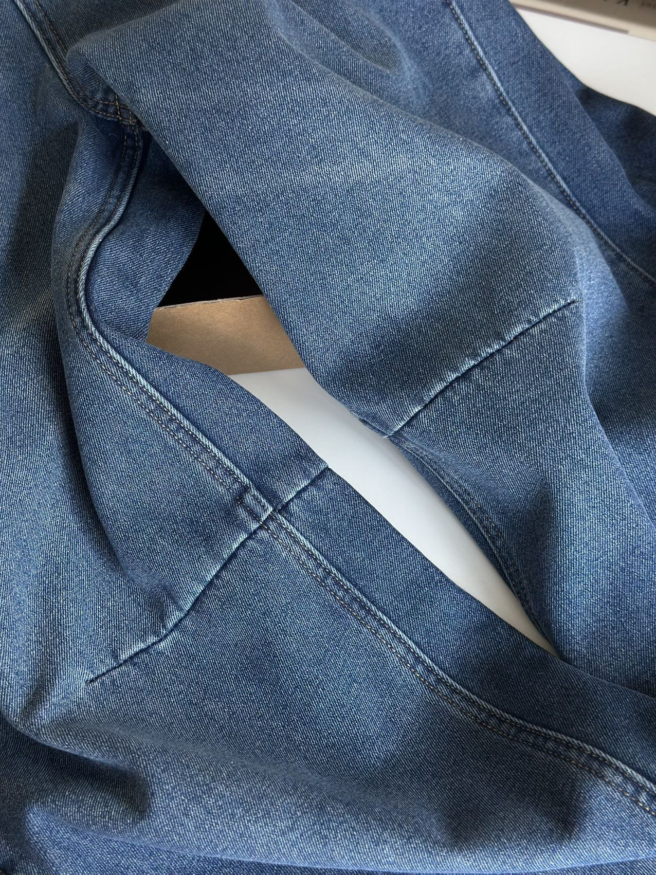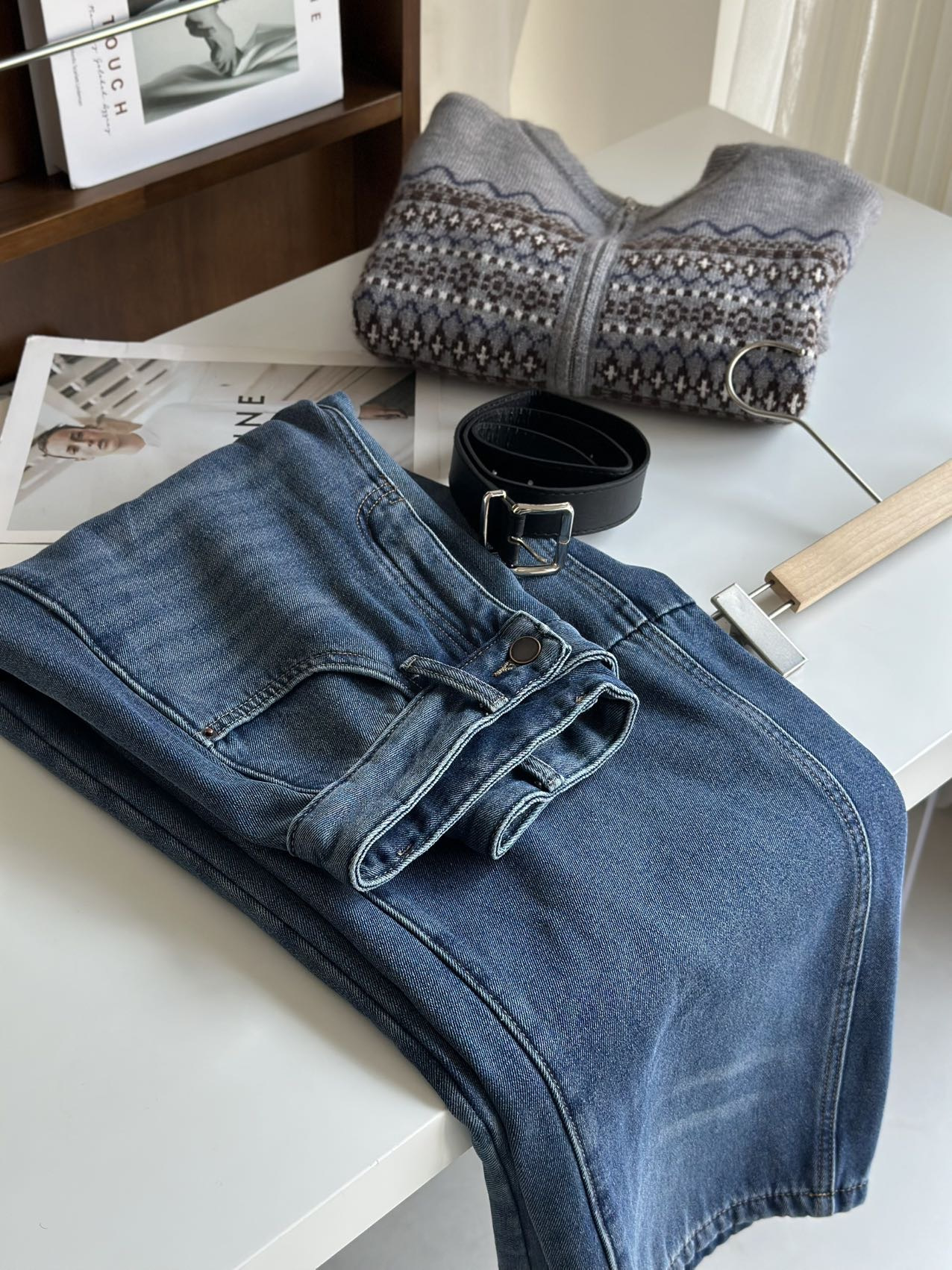 依旧保持着弯刀裤的利落线条,这也是它区别于普通加绒牛仔裤的关键。