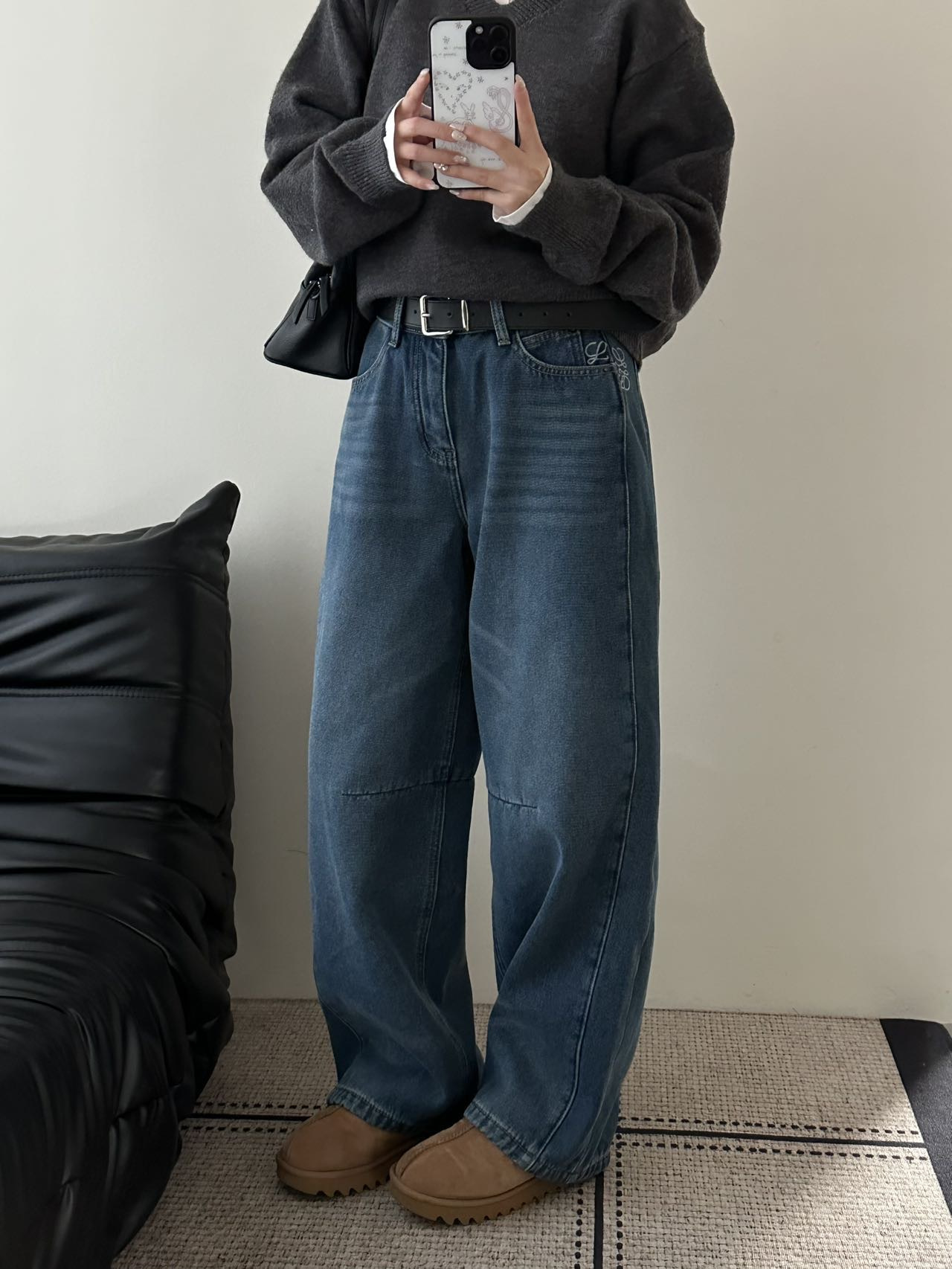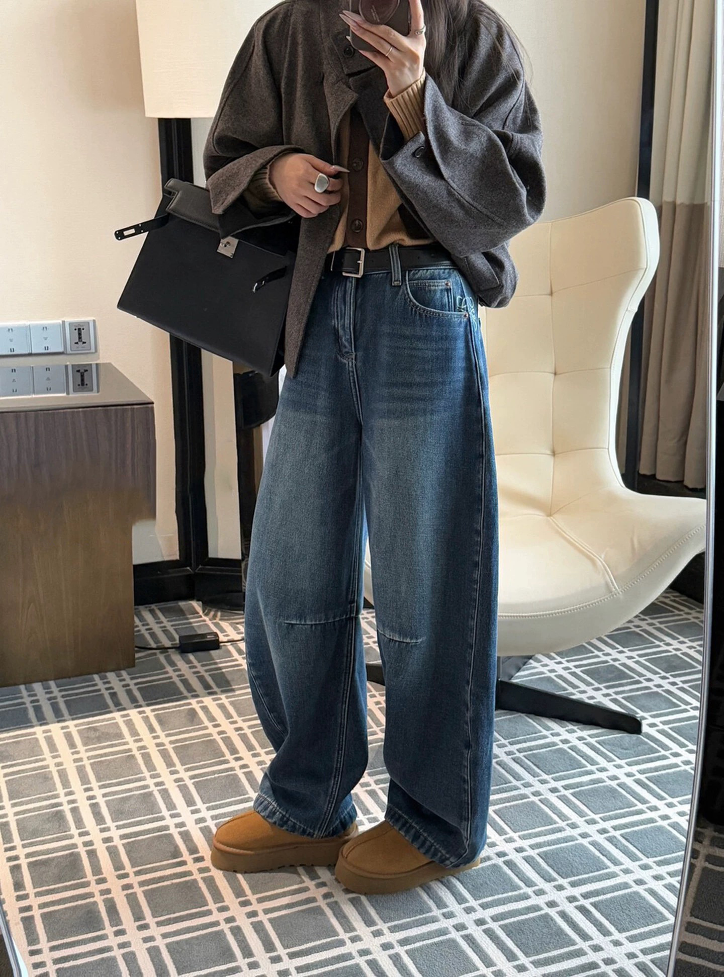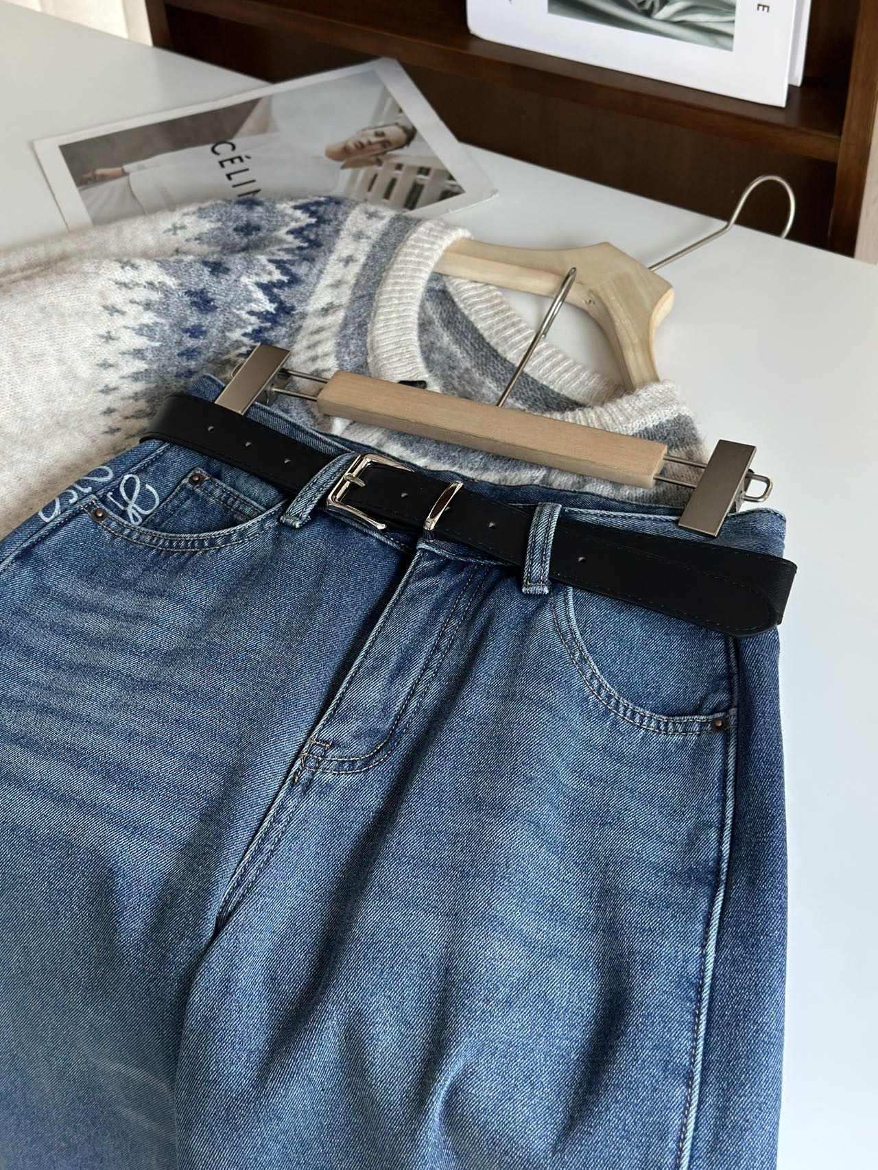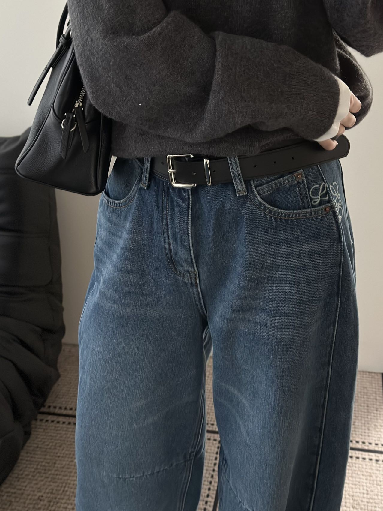 依旧保持着弯刀裤的利落线条,这也是它区别于普通加绒牛仔裤的关键。