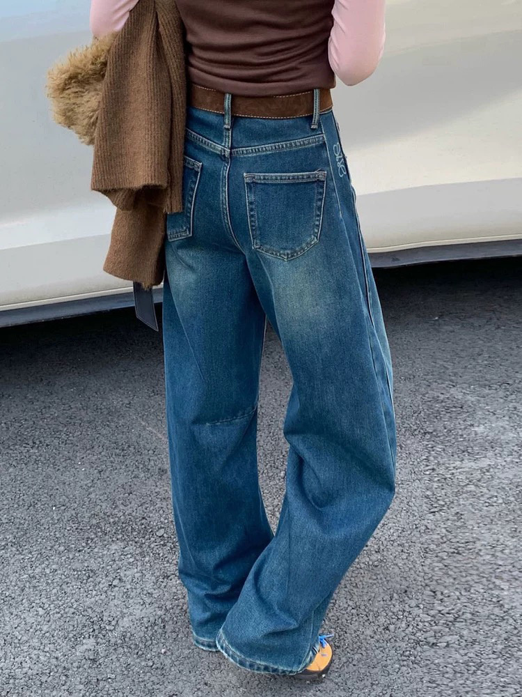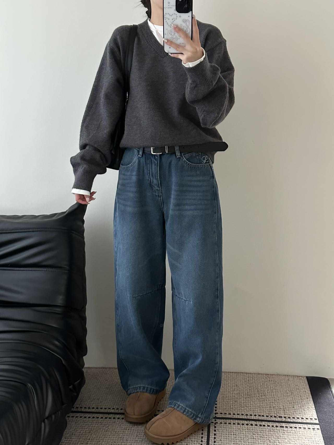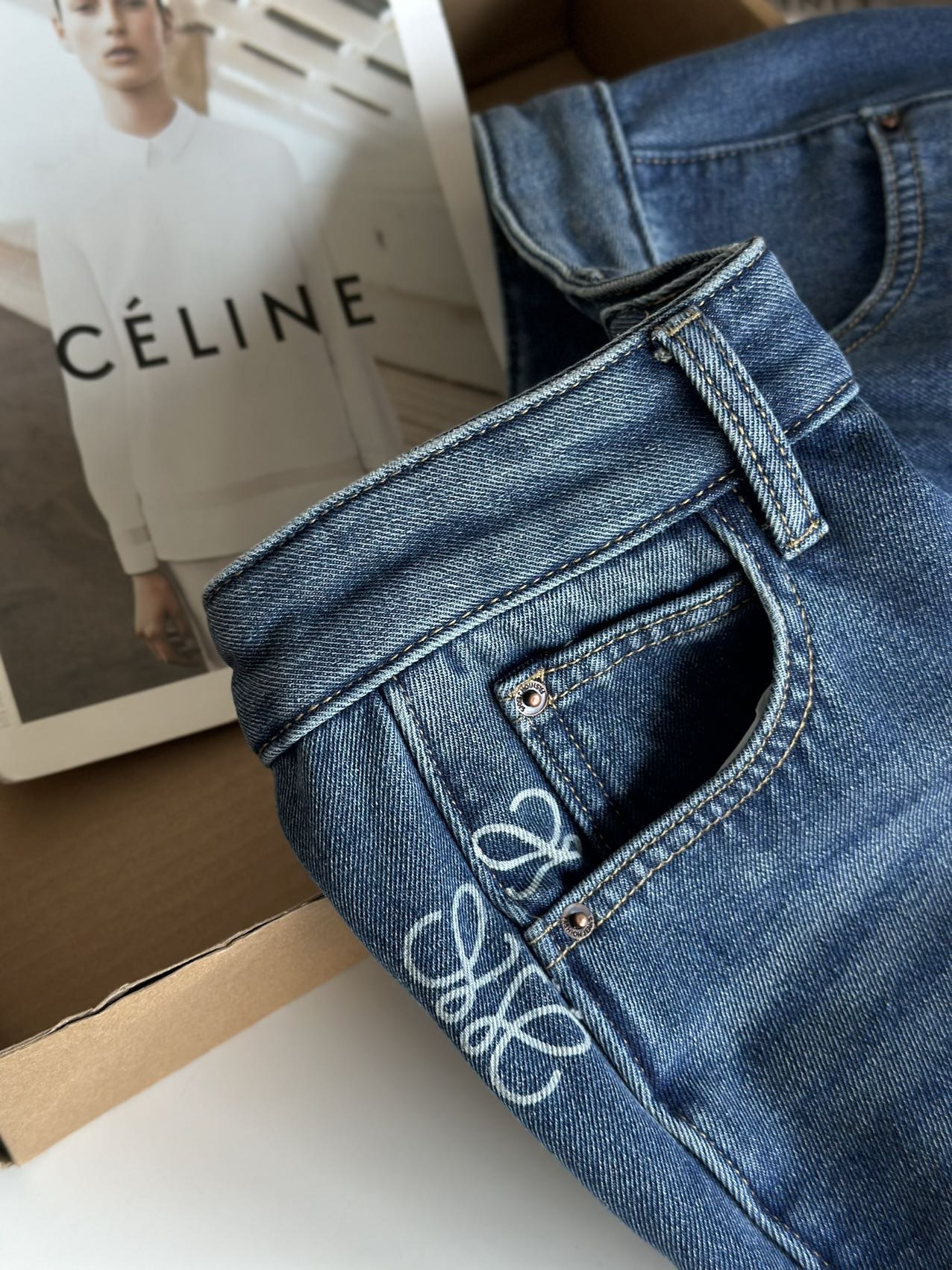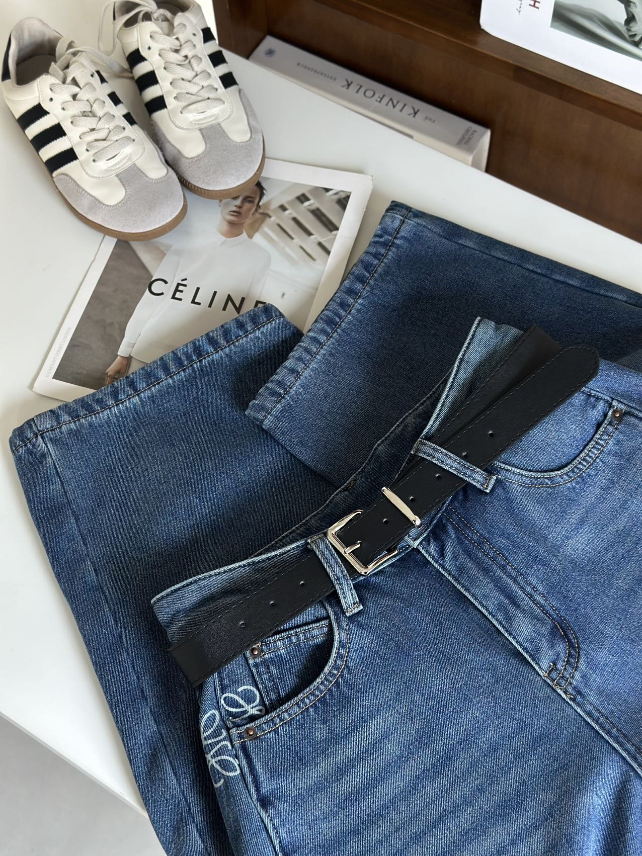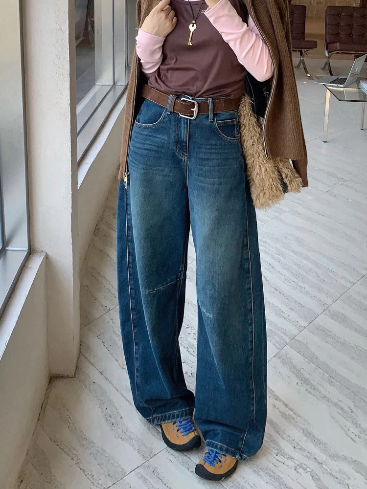 依旧保持着弯刀裤的利落线条,这也是它区别于普通加绒牛仔裤的关键。