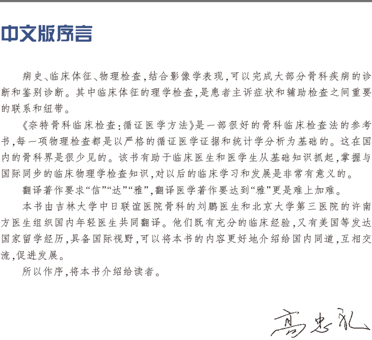 骨科疾病属于运动系统的医疗范畴,随着国内生活水平的提高和各项群众性体育运动的广泛开展,国人对运动系统的健康提出了更高的要求。认真学习研究各种理学检查的方法及其临床表现的意义,对骨科疾病的诊断和鉴别诊断非常重要,既可以指导骨科医生根据合适的指征进行早期干预,同时又有助于避免不必要的有创医疗行为。