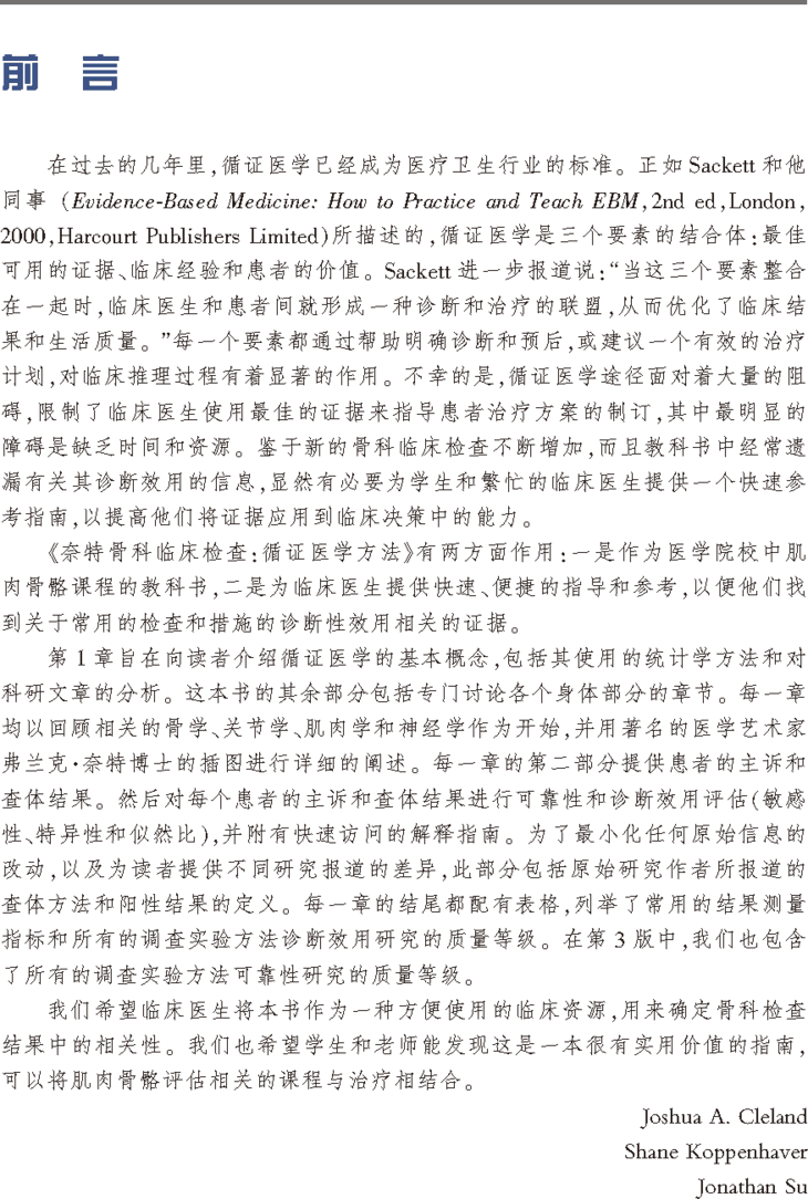 《奈特骨科临床检查:循证医学方法》(第3版)是一本简洁实用的骨科临床检查指导手册,可以帮助医师通过体格检查等方法发现最具特征性的临床指证,以帮助诊断。本书以手绘图、照片图、影像图和各种表格为主,配以简要文字,系统介绍了临床外科各种常规、专项诊断试验的检查方法、操作步骤、操作技巧、注意事项和临床意义等,适合骨科临床医师参考阅读。本书共分11章,第1章向读者介绍循证医学的基本概念,包括其使用的统计学方法和对科研文章的分析。后面10章专门讨论各个身体部分,包括颞下颌关节、颈椎、胸腰椎、骶髂区、髋和骨盆、膝关节、足踝、肩关节、肘关节和前臂、手腕和手等区域。