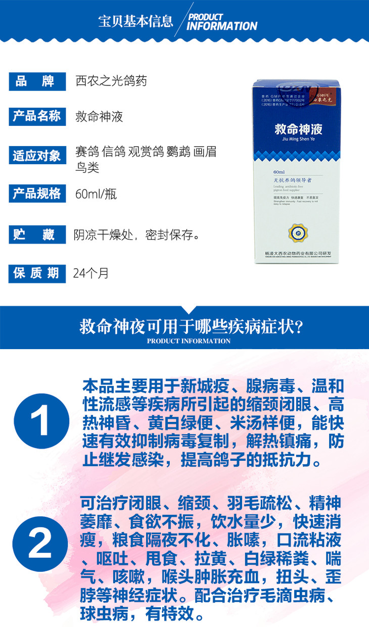 【益快康】原【救命神液】60ml鸟赛信鸽子药腺病毒新城疫嗉囊炎水绿便(西农之光鸽药)