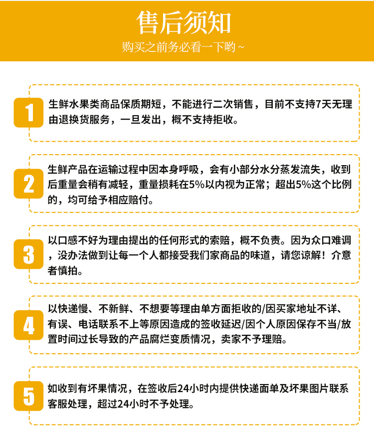 2.收到坏果请于签收后的24小时内联系客服,坏果10颗以内不售后,超过10颗的部分,每颗坏果赔付0.2元