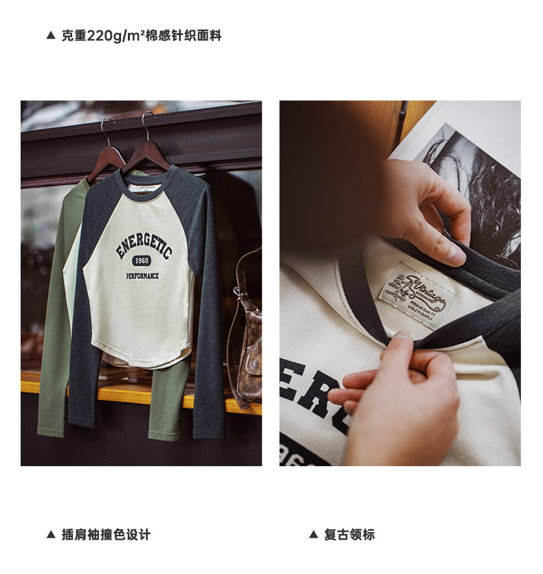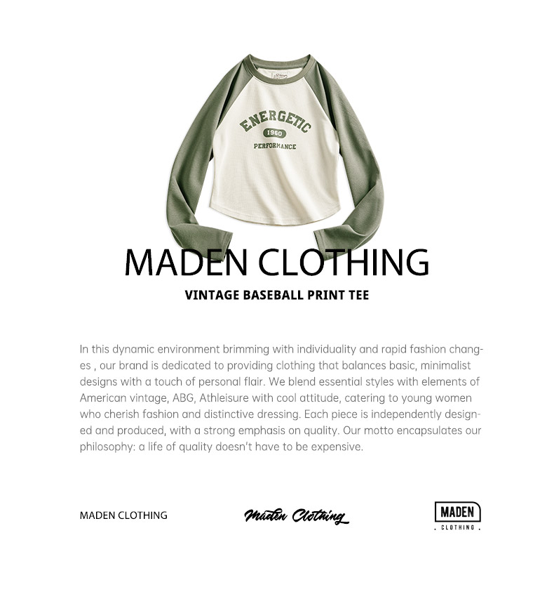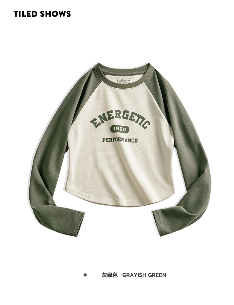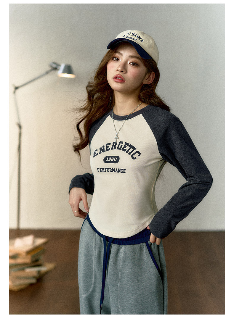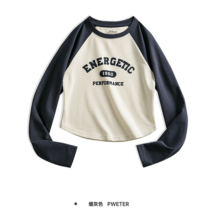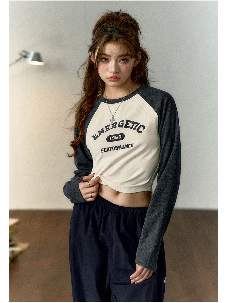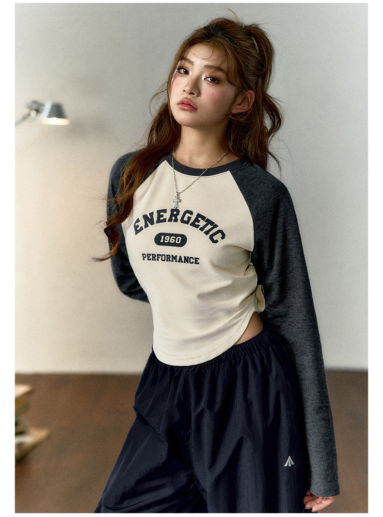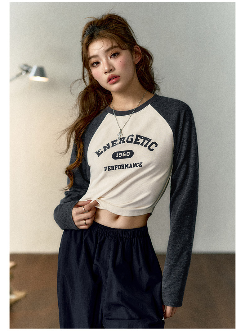 马登女装美式撞色插肩长袖t恤显瘦辣妹短款字母上衣棒球印花T内搭