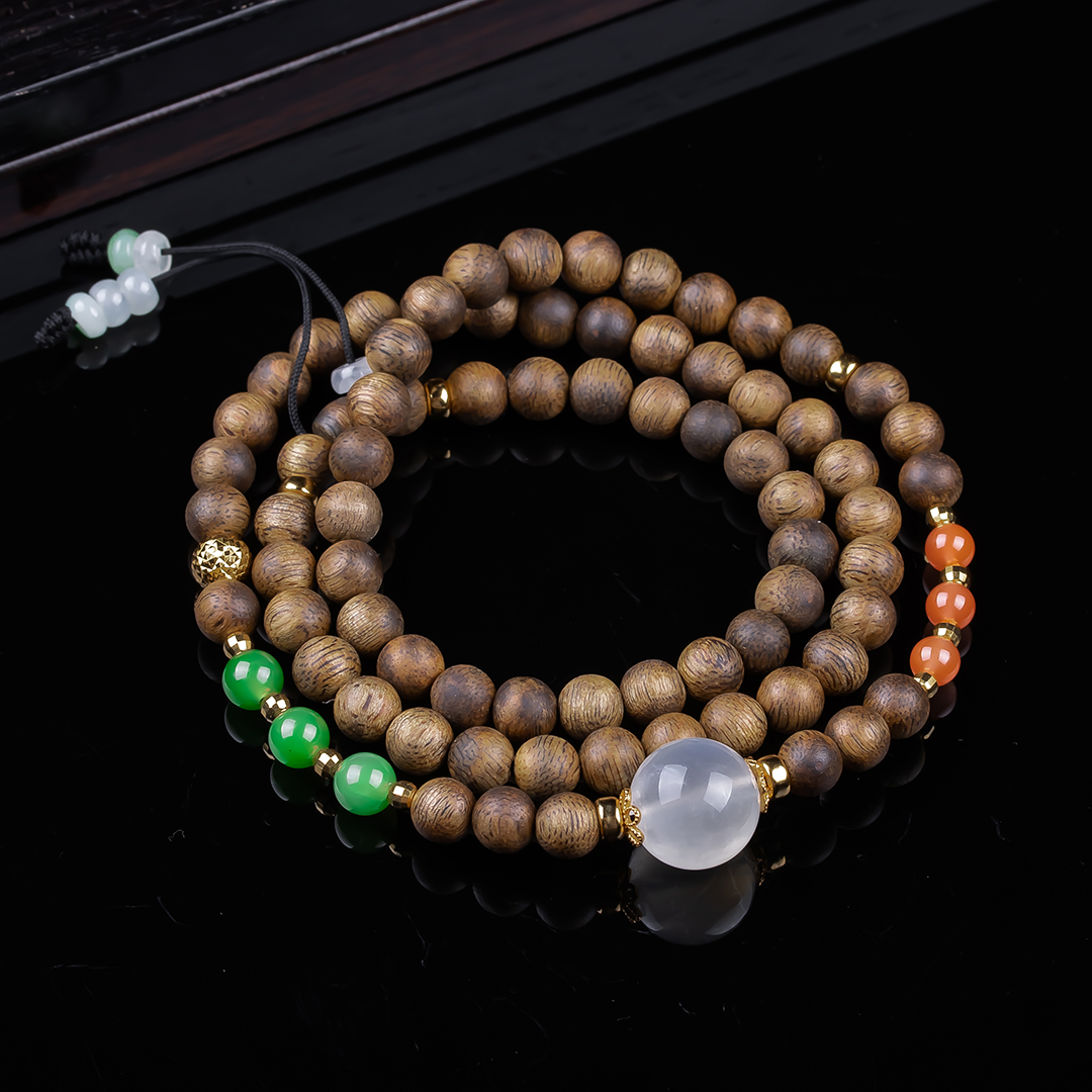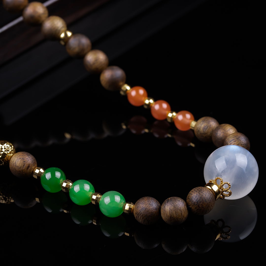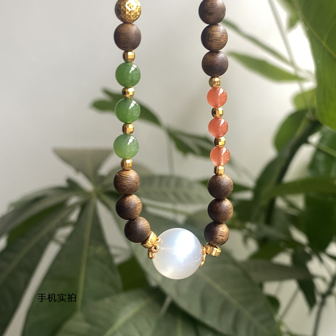XY0357沉香+月光石碧玉南红项链,天然沉香约6.3mm,原色原味,香味自然清甜,12.6mm大的月光石,散发着梦幻般的光彩,静谧幽远,加持力超强。配珠:翡翠、南红、碧玉、925银,款式典雅大方,充满东方美学韵味。(链长可调节)