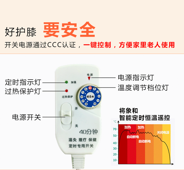 打开护具,佩戴在合适部位,接通电源,打开开关,开始使用。温控开关可调,调至5-6档,20分钟可达50°左右,依个人喜好再调至舒适档位保温即可,40分钟左右自动断电。每天可使用1-3次。