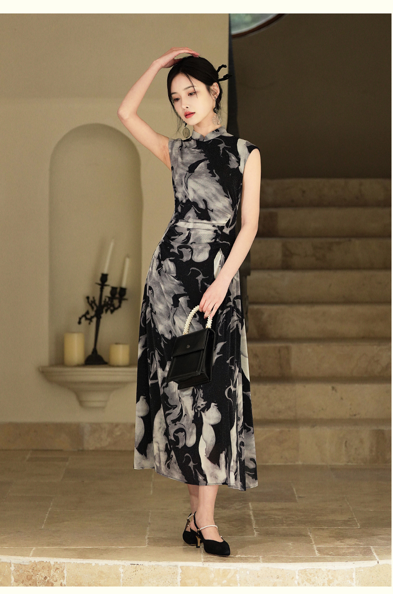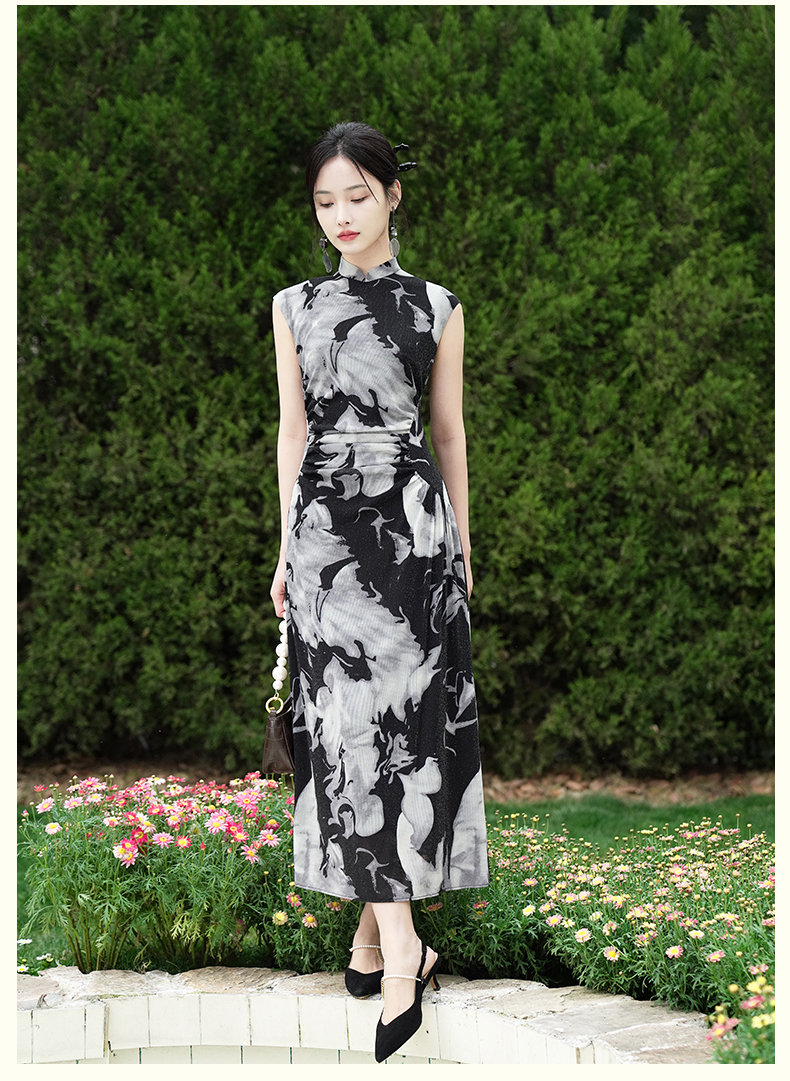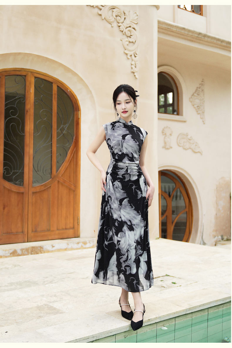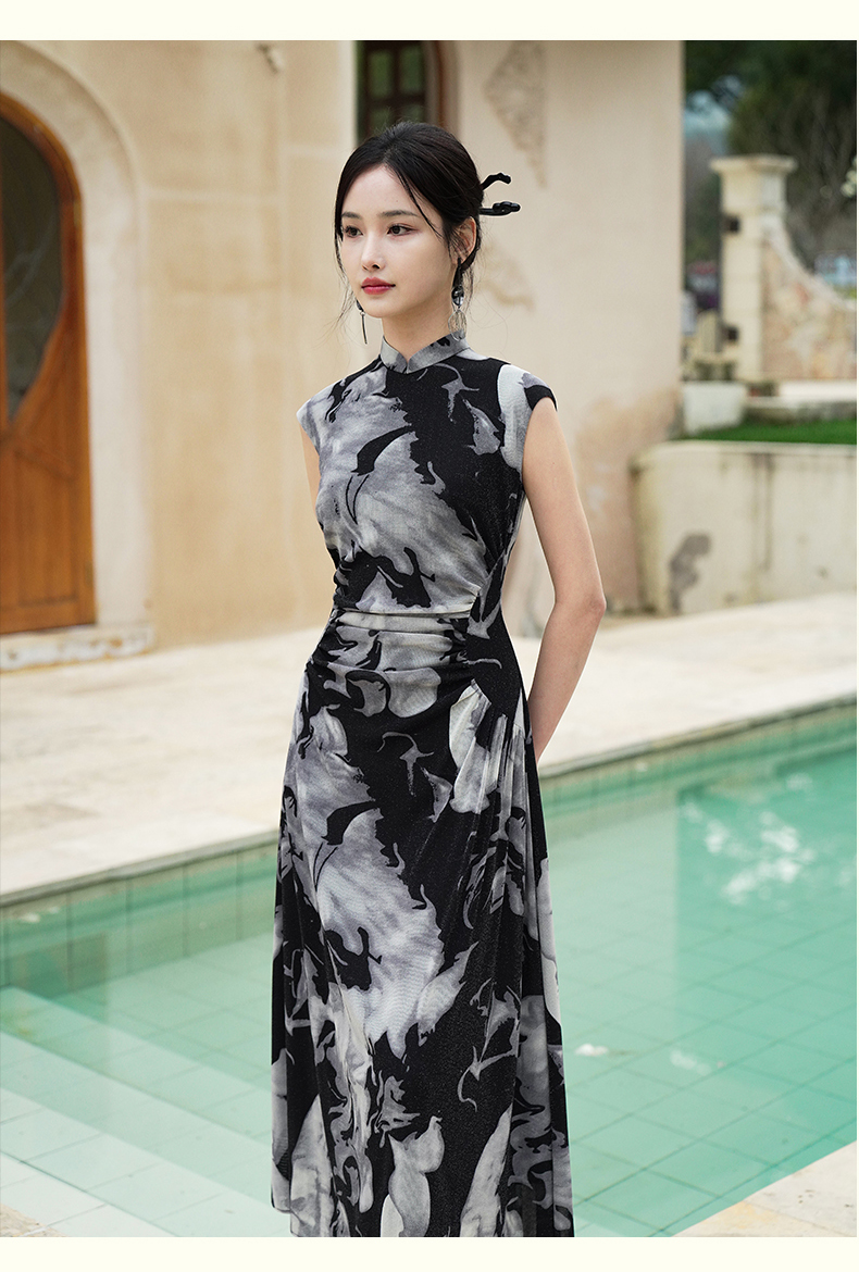 逸红颜墨卿2025夏新款冰凉感高弹银丝针织褶皱新中式大摆长旗袍裙