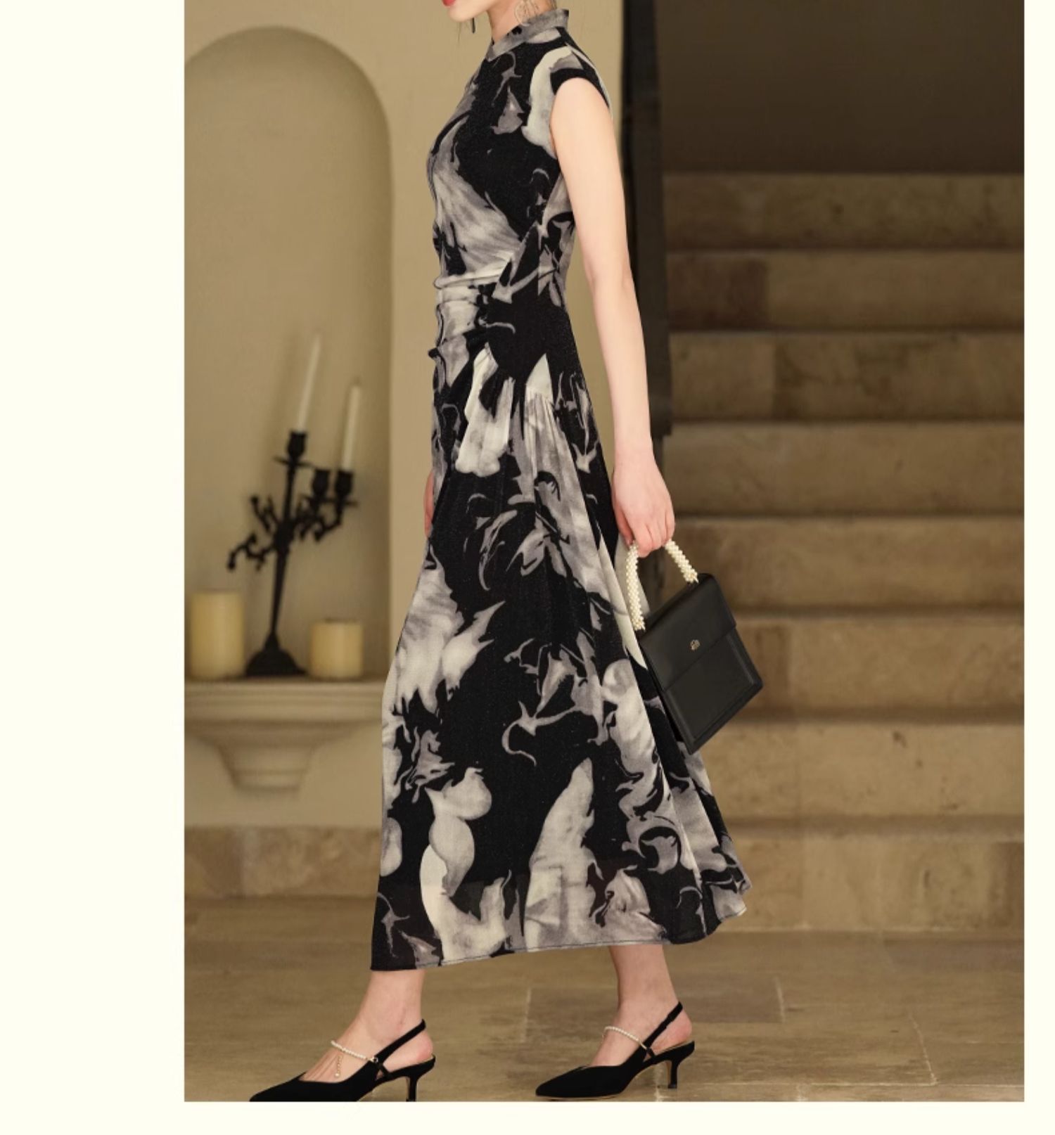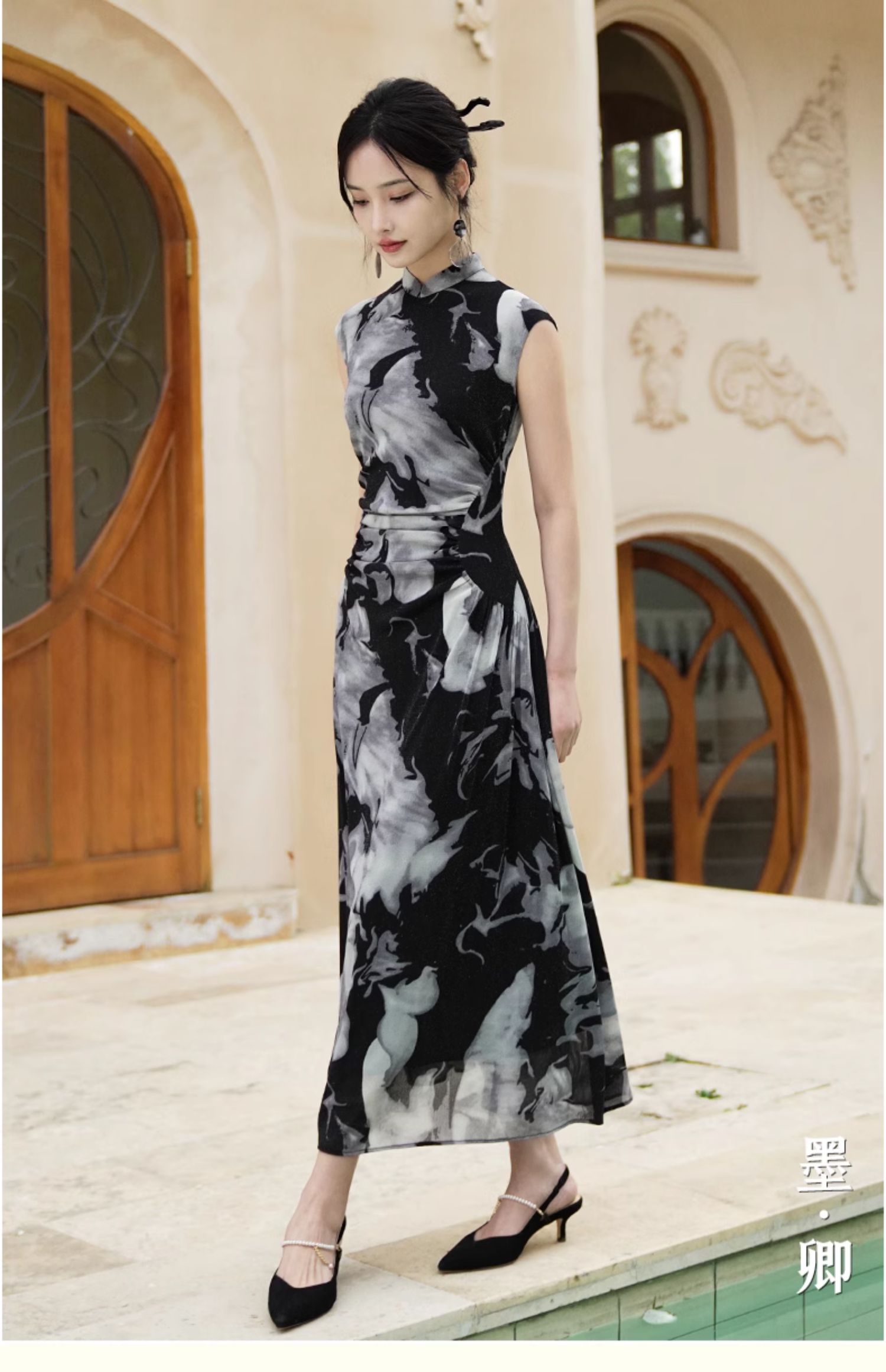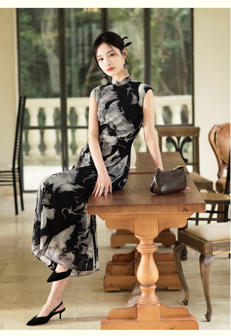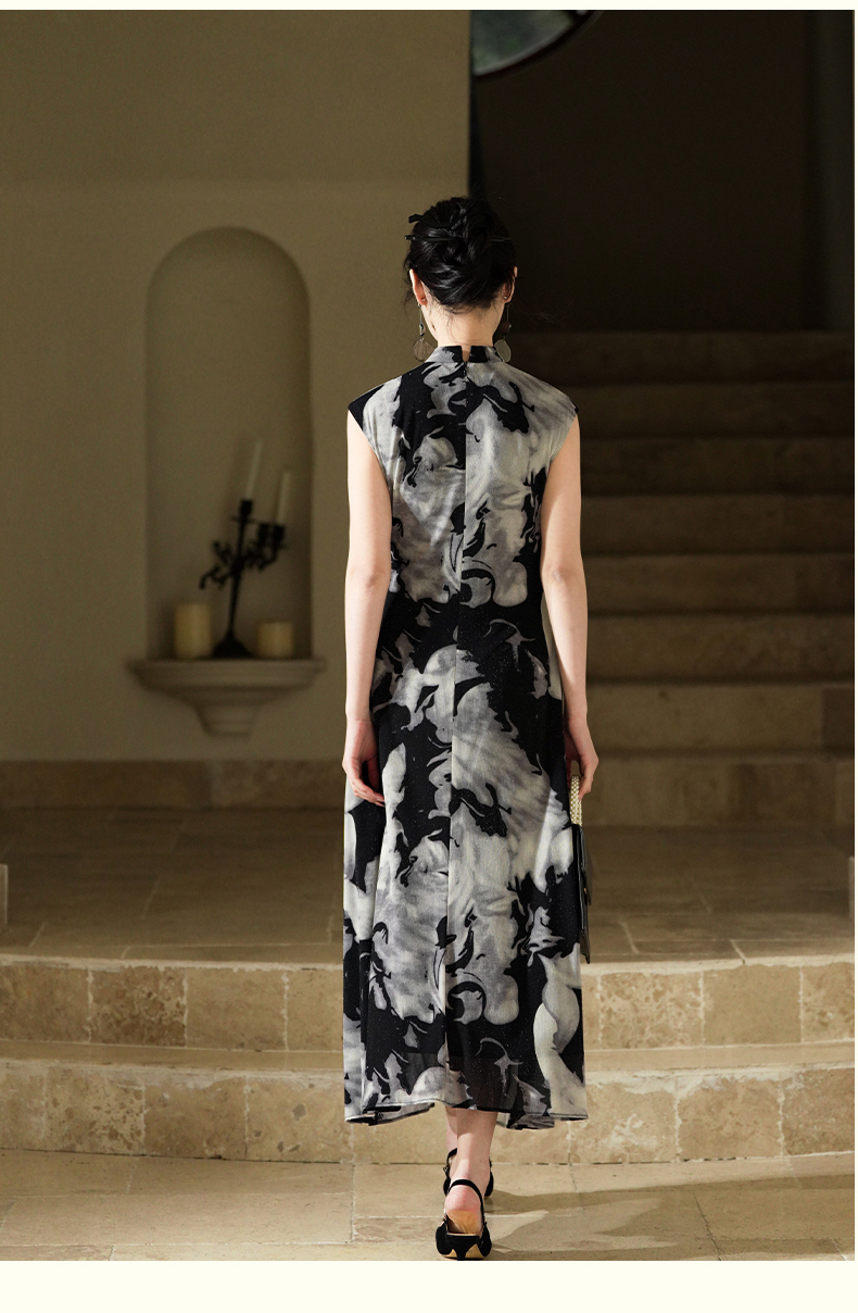 逸红颜墨卿2025夏新款冰凉感高弹银丝针织褶皱新中式大摆长旗袍裙