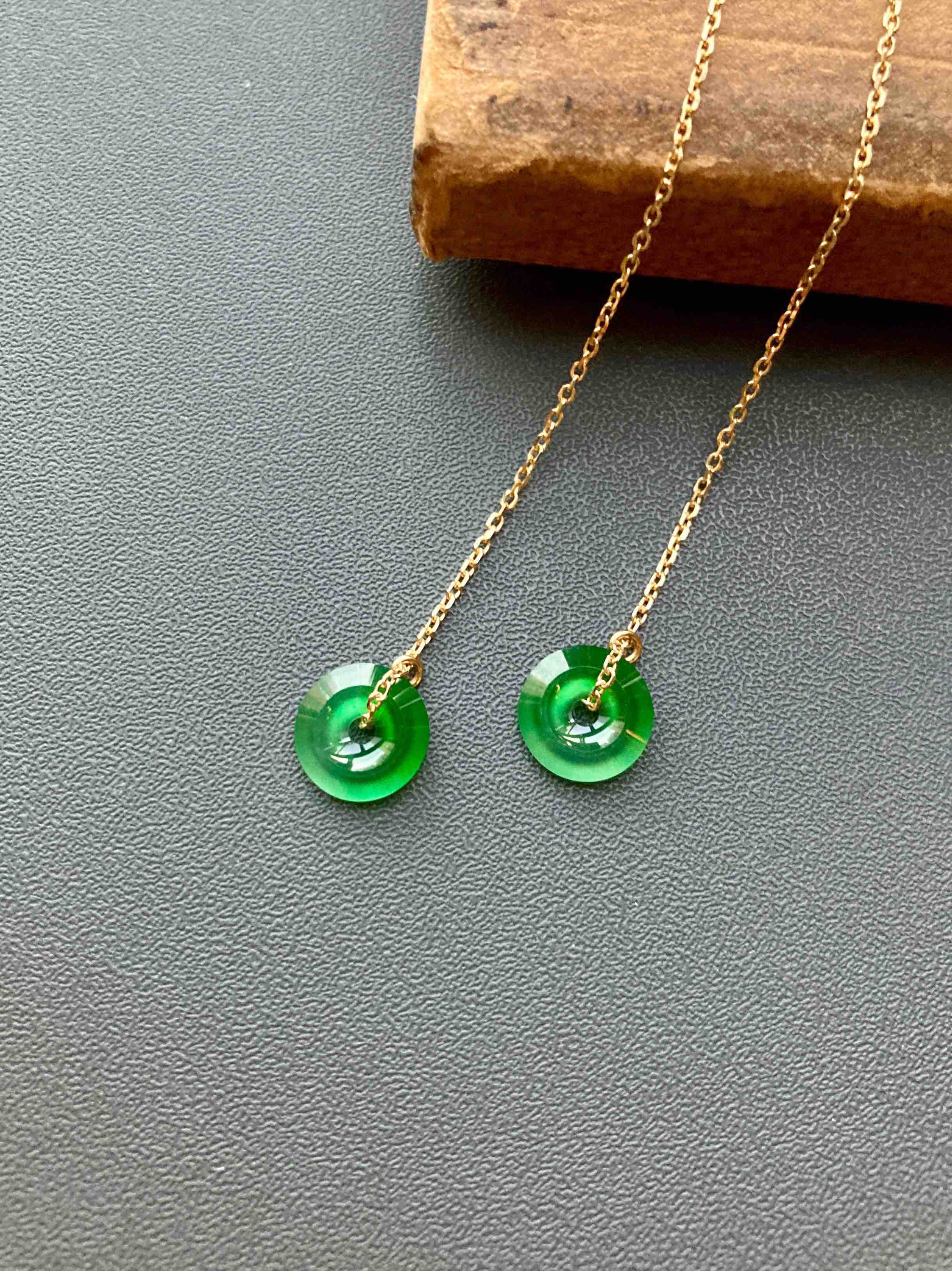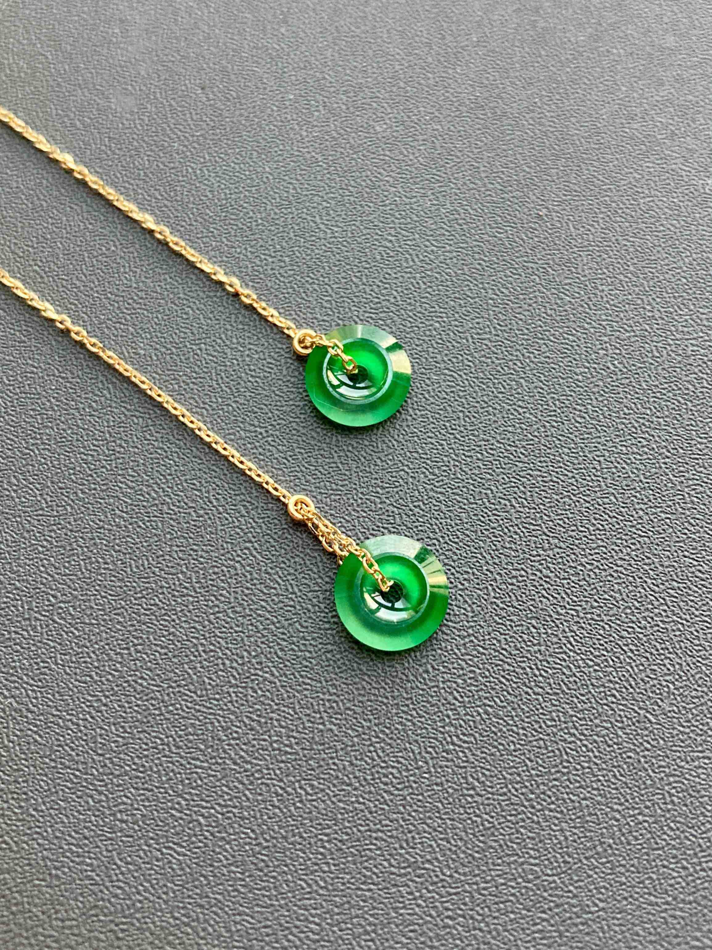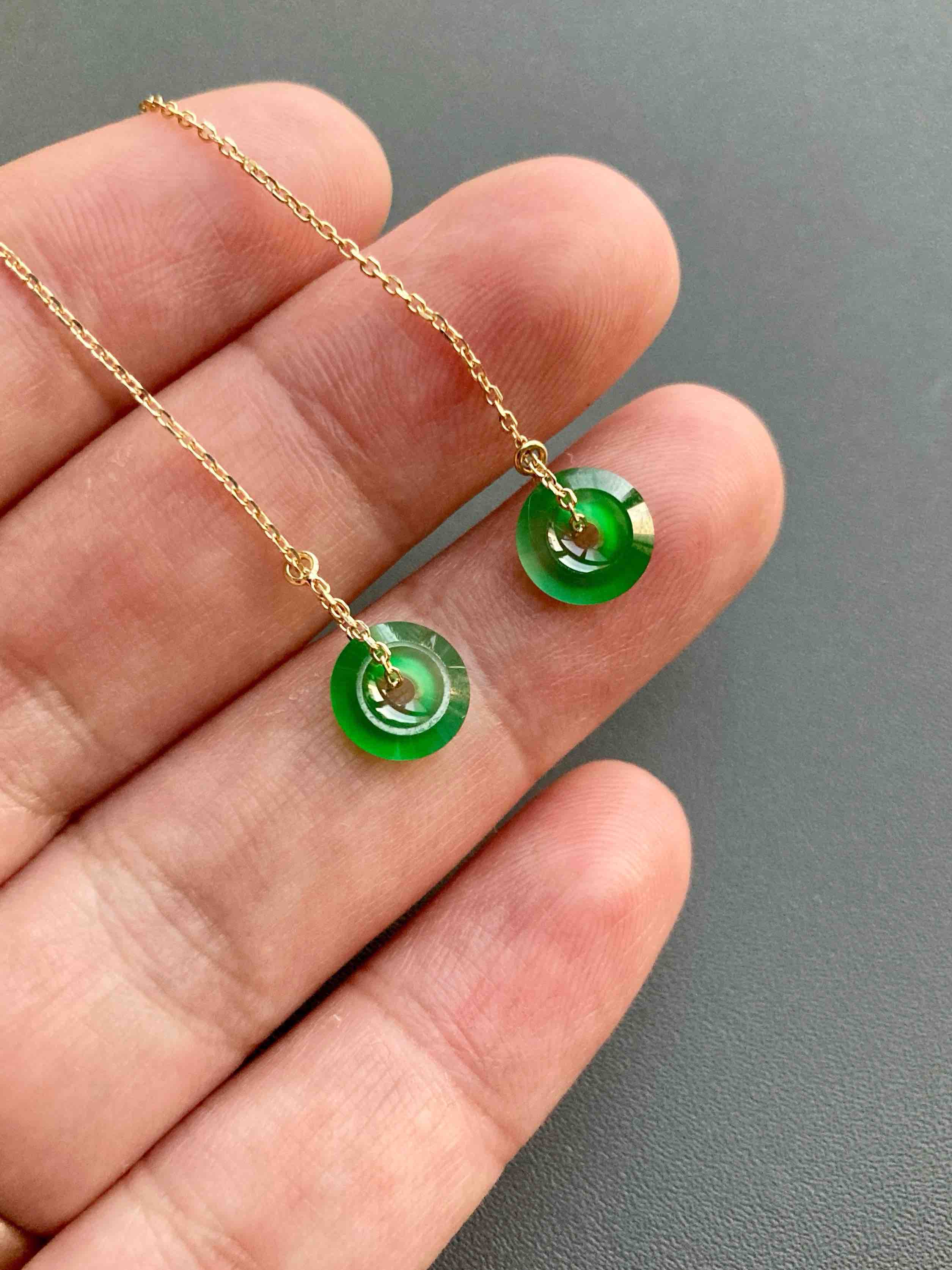 来点好东西,高冰到玻璃种阳绿翡翠平安扣耳线,见过种水这么好的正阳绿吗,太透了,荧光四射,阳绿艳丽无比,充满灵气,18k黄金耳线长度可调,危地马拉翡翠,这种品质等级还需要什么缅甸,只要小四价位哦,性价比绝了,平安扣7.8×1.9mm,总长90mm