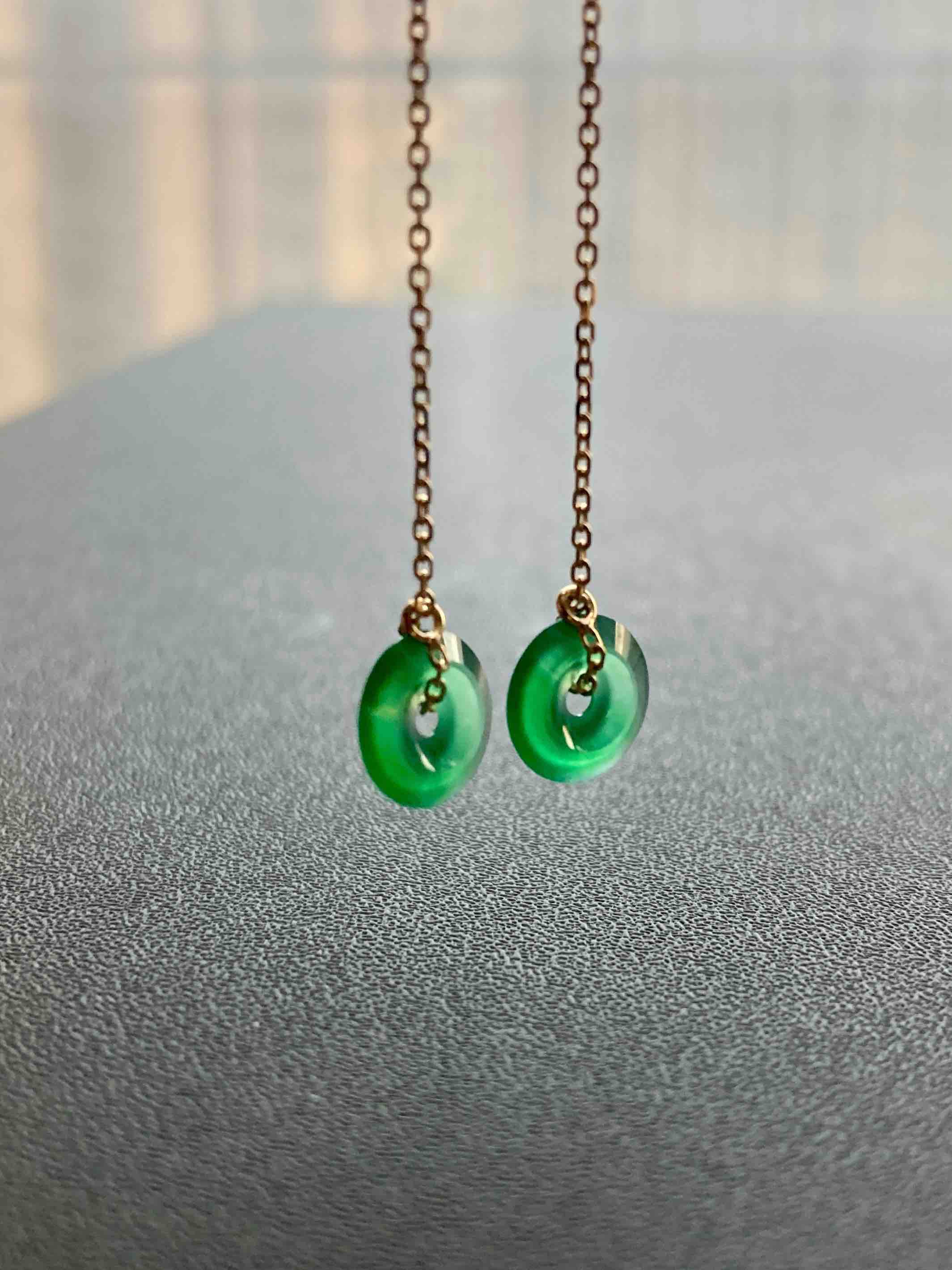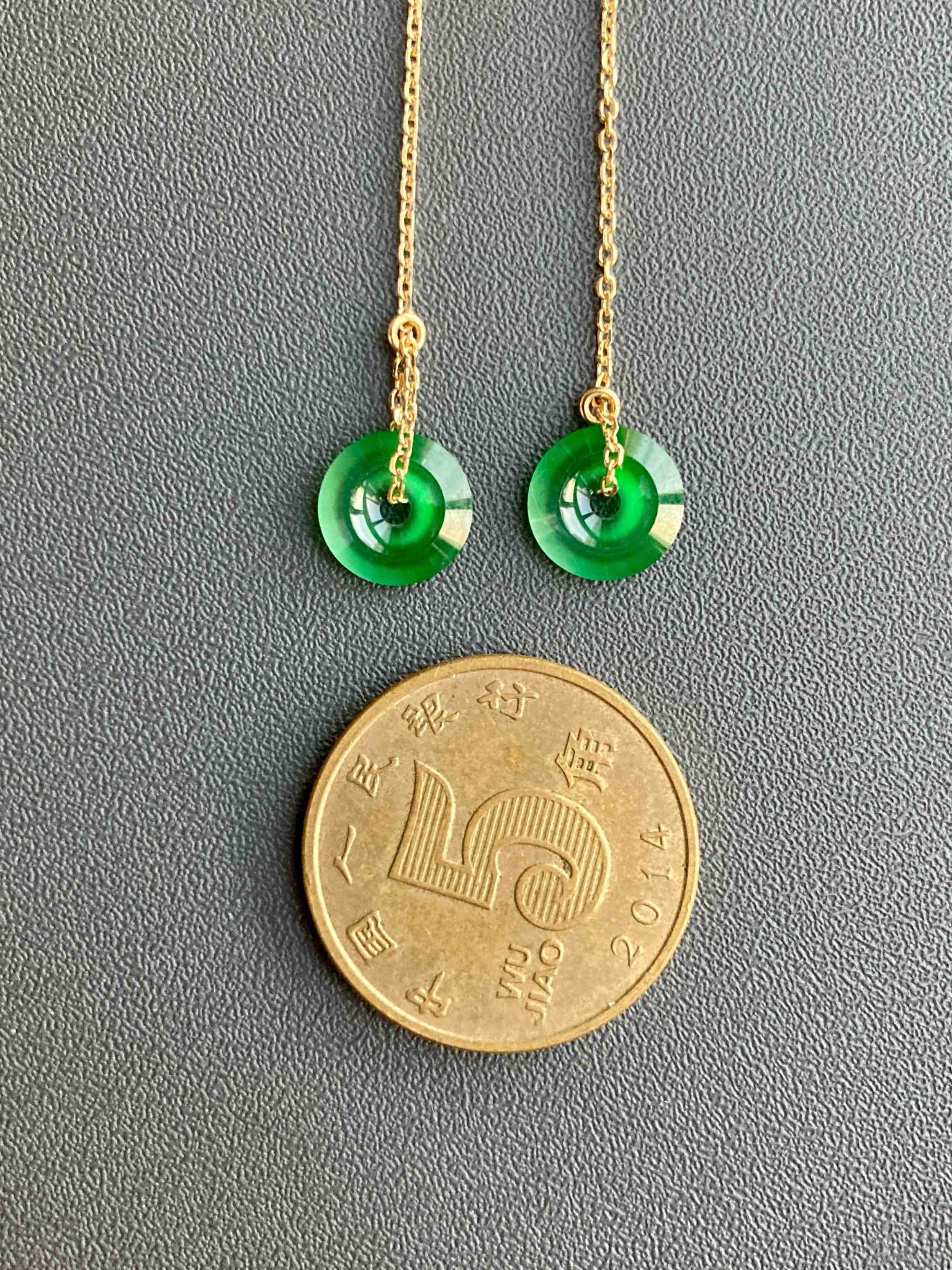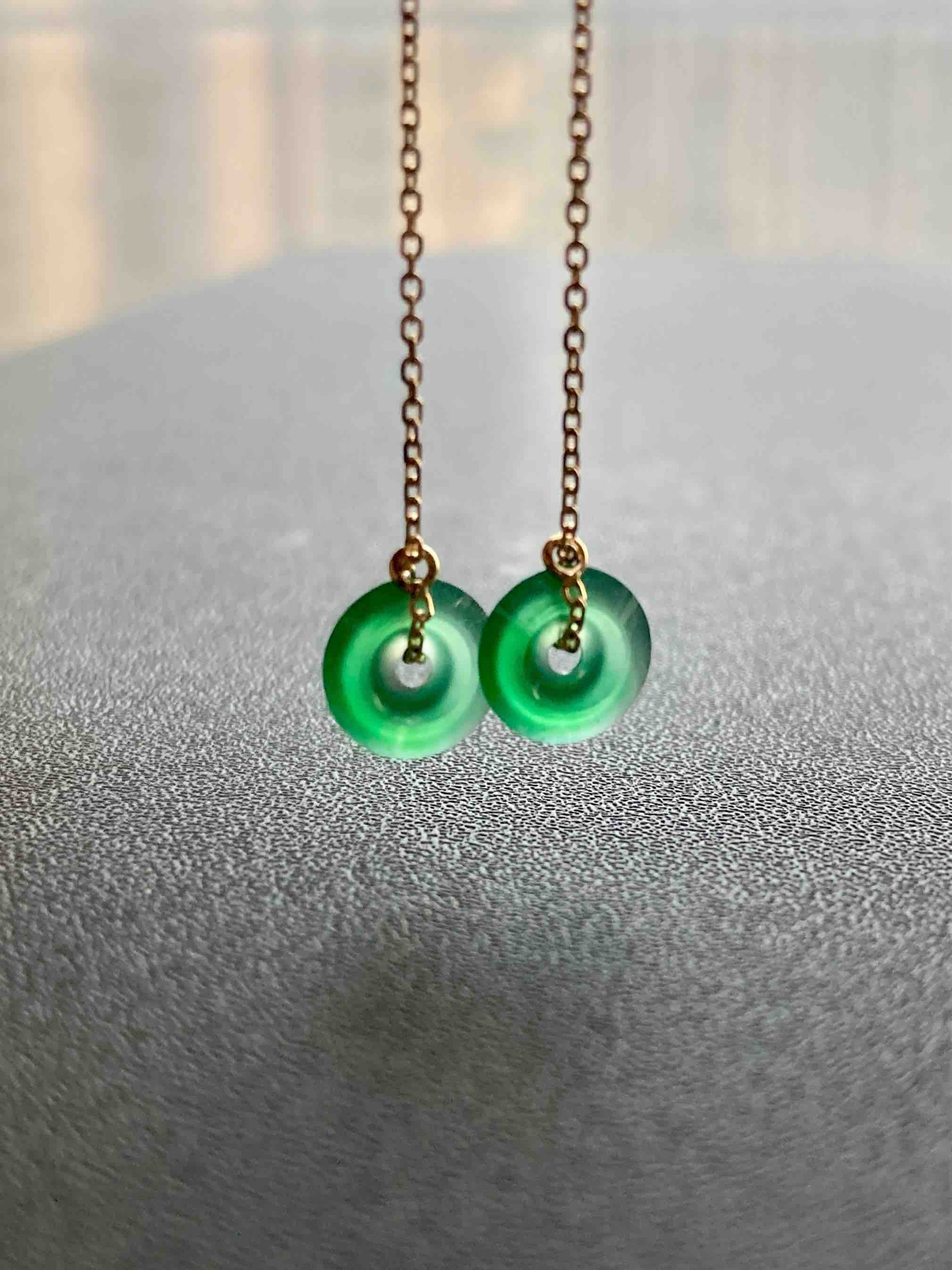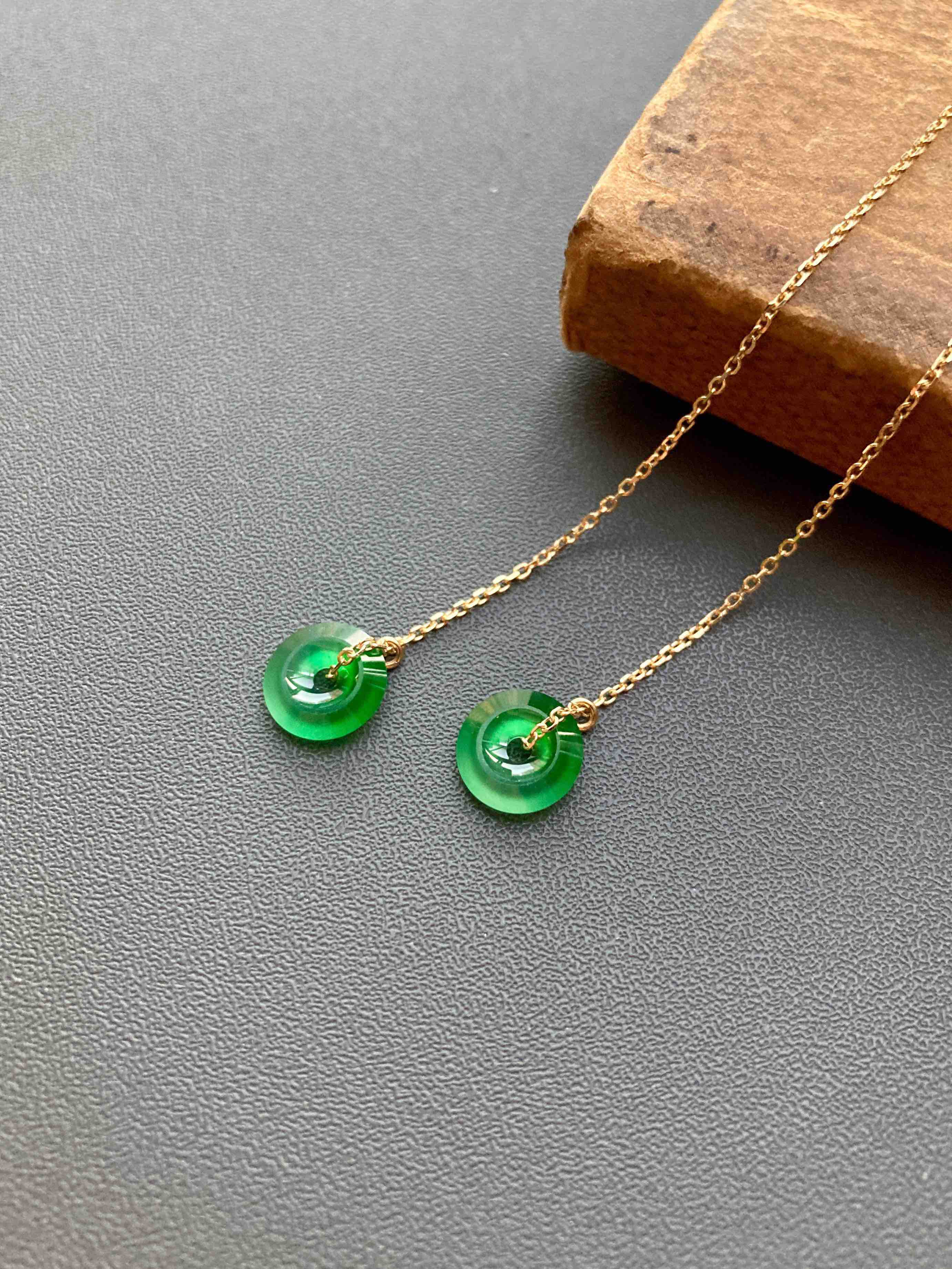 来点好东西,高冰到玻璃种阳绿翡翠平安扣耳线,见过种水这么好的正阳绿吗,太透了,荧光四射,阳绿艳丽无比,充满灵气,18k黄金耳线长度可调,危地马拉翡翠,这种品质等级还需要什么缅甸,只要小四价位哦,性价比绝了,平安扣7.8×1.9mm,总长90mm