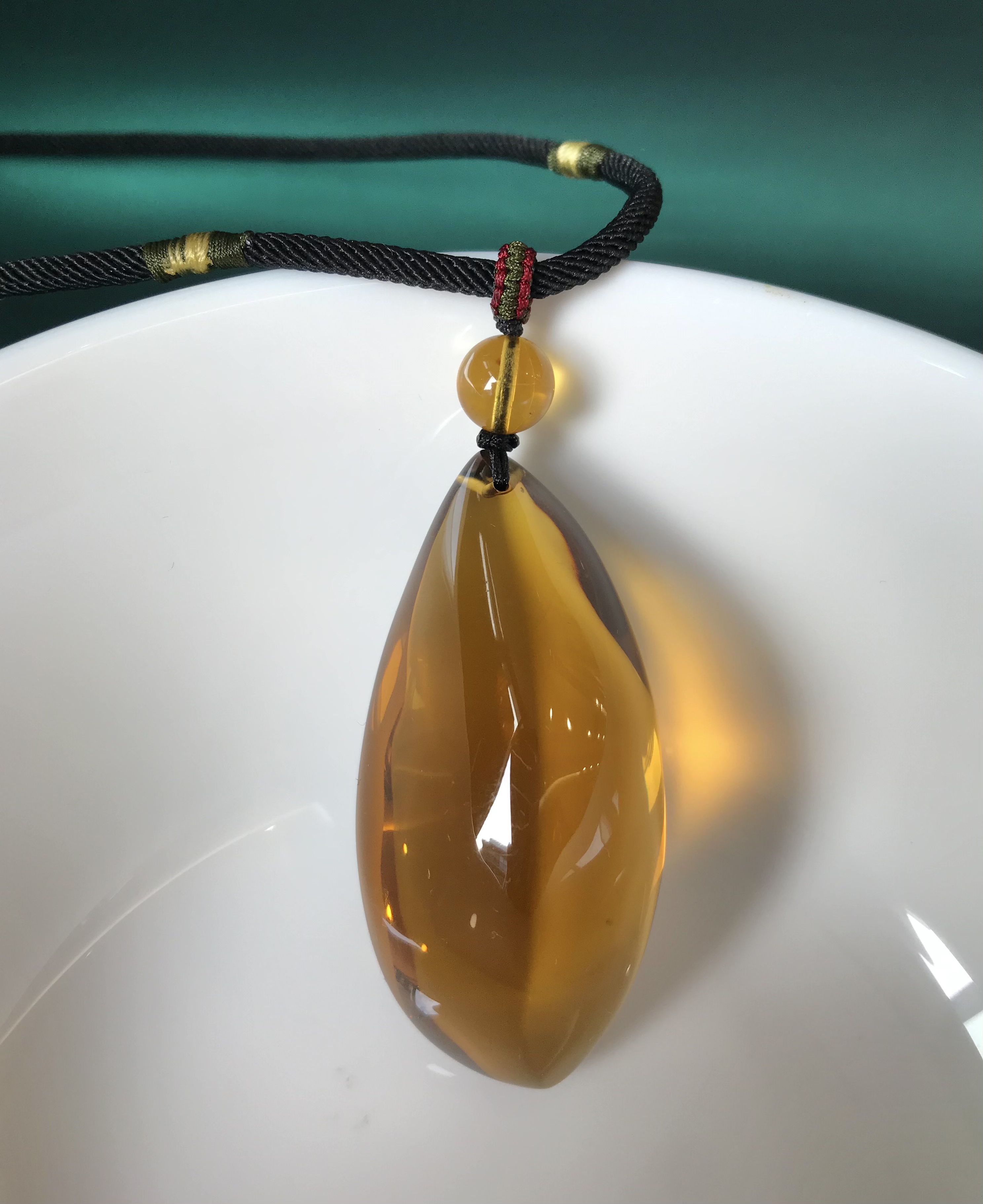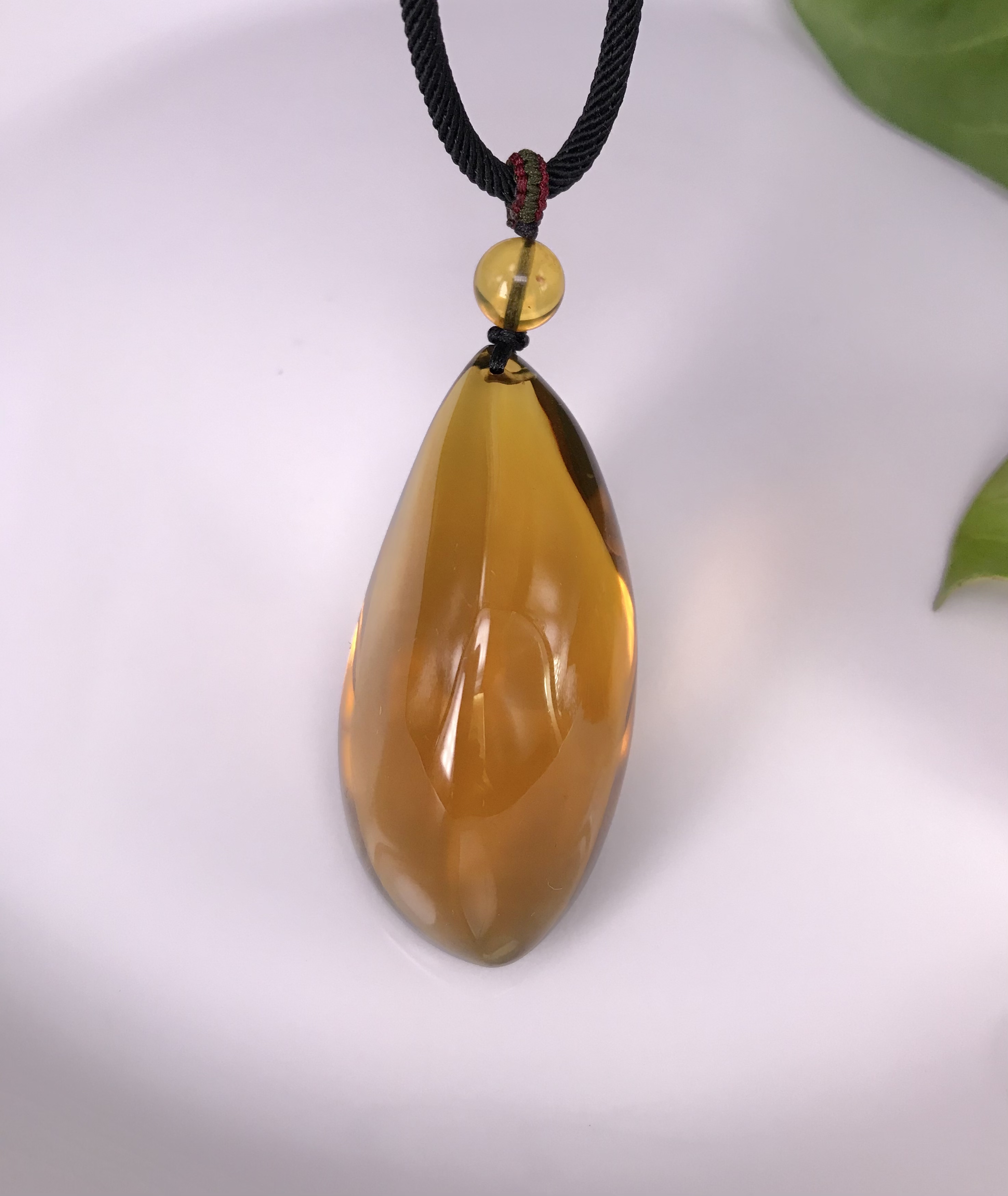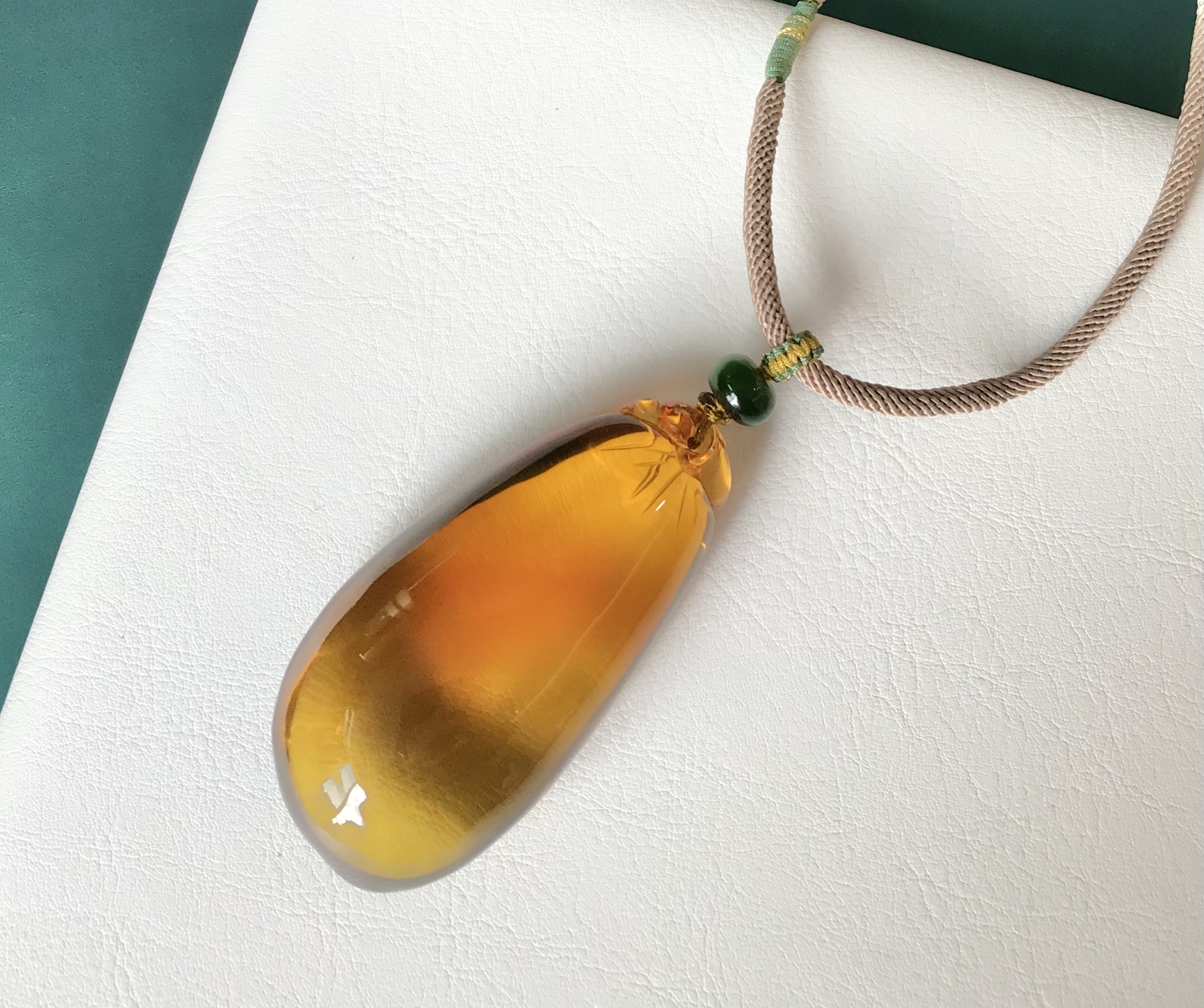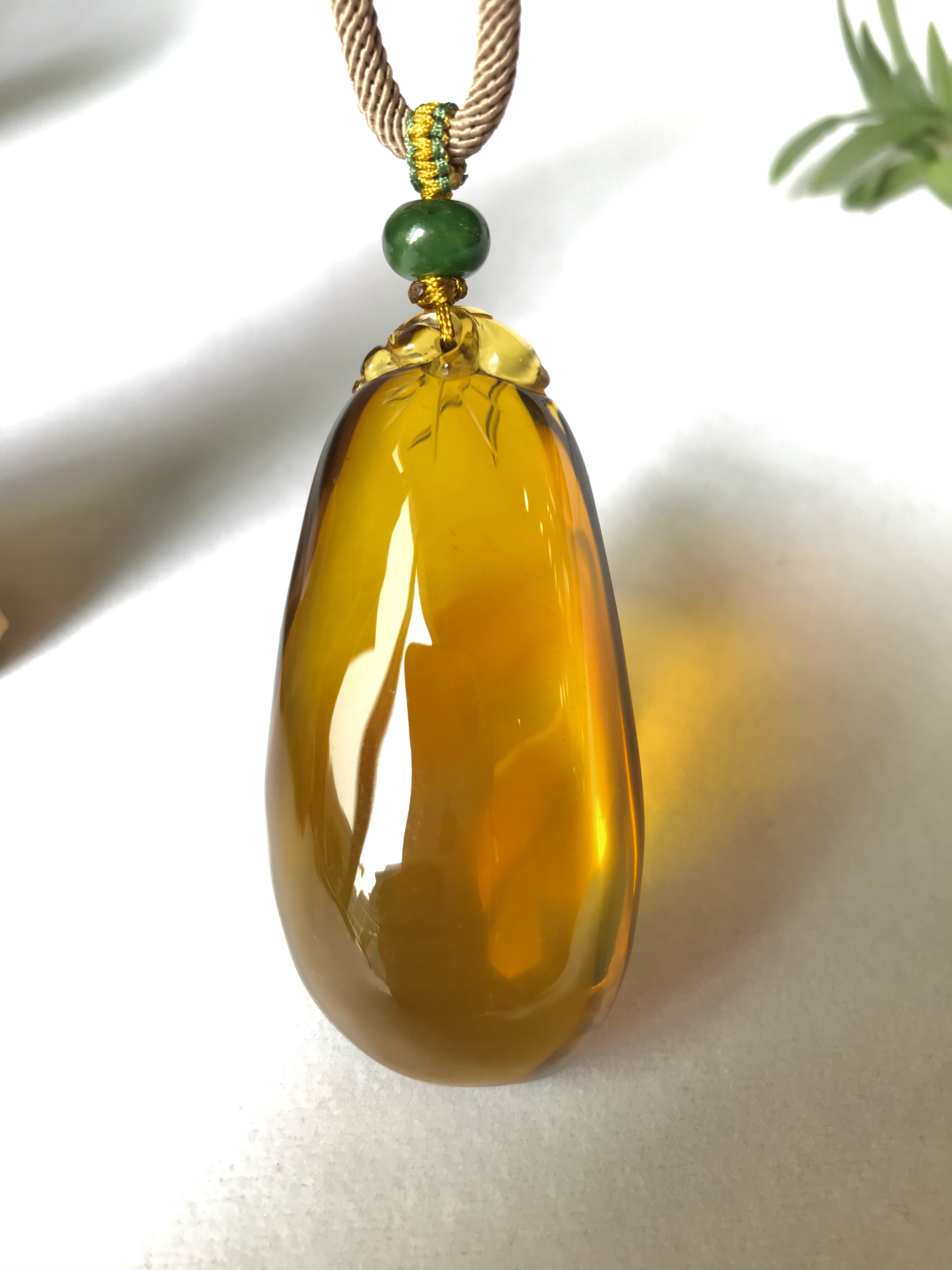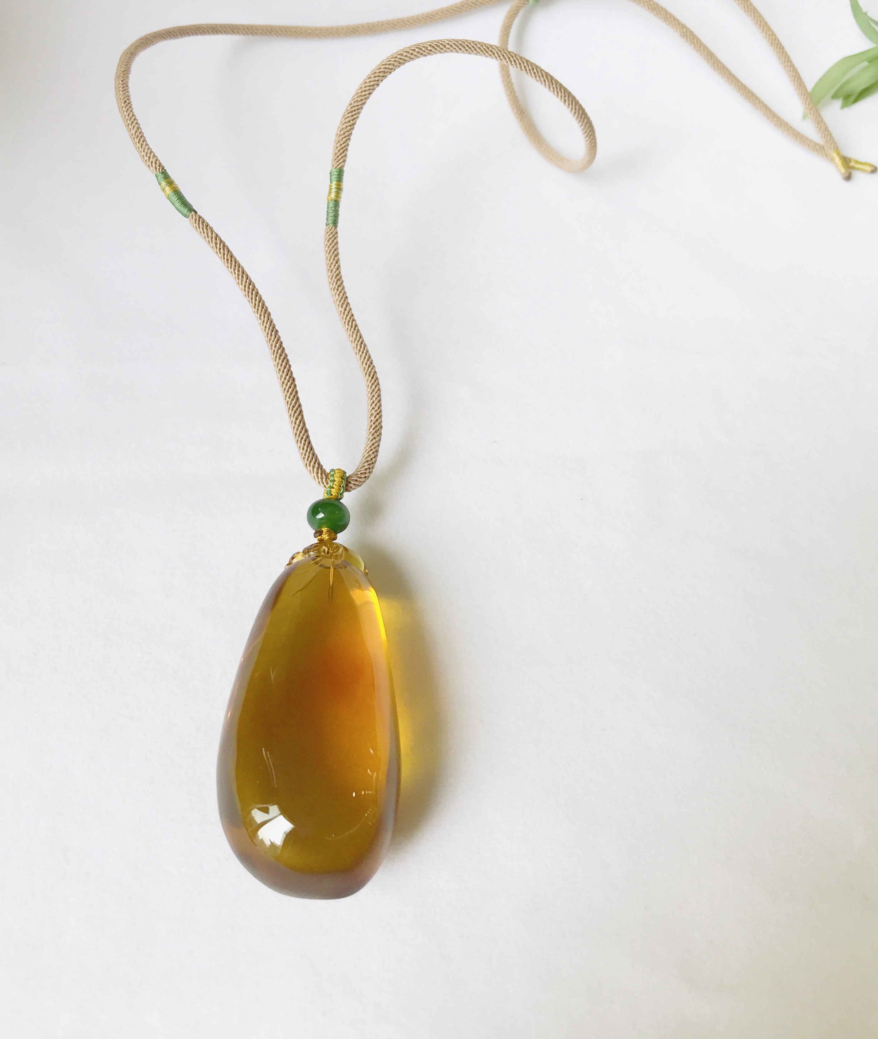 整个珀体干净无暇,全净水,面上浓浓的机油光,如镀上一层天然的油膜,举起来看,就像绿茶茶汤被凝固在了时光里,芳津流华,佩戴在身,泽润肌骨!也可做把玩件。