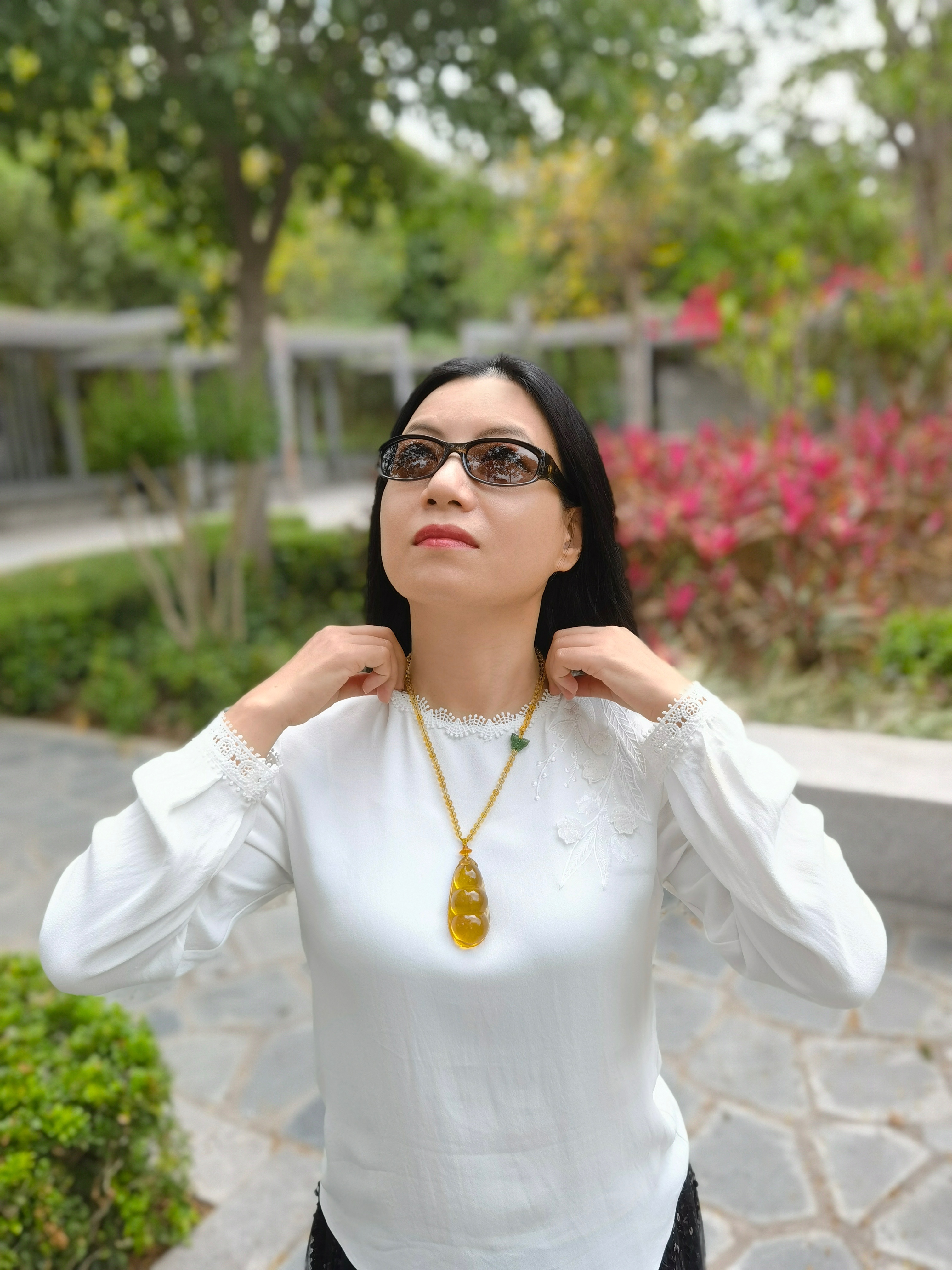 搭配品质很高的缅甸高白兰珀设计链,碧玉蝴蝶和足金玫瑰花,戴起来不仅气场强大,又透着女性的柔美。链子上的蝴蝶尤其出彩,漂亮大气!