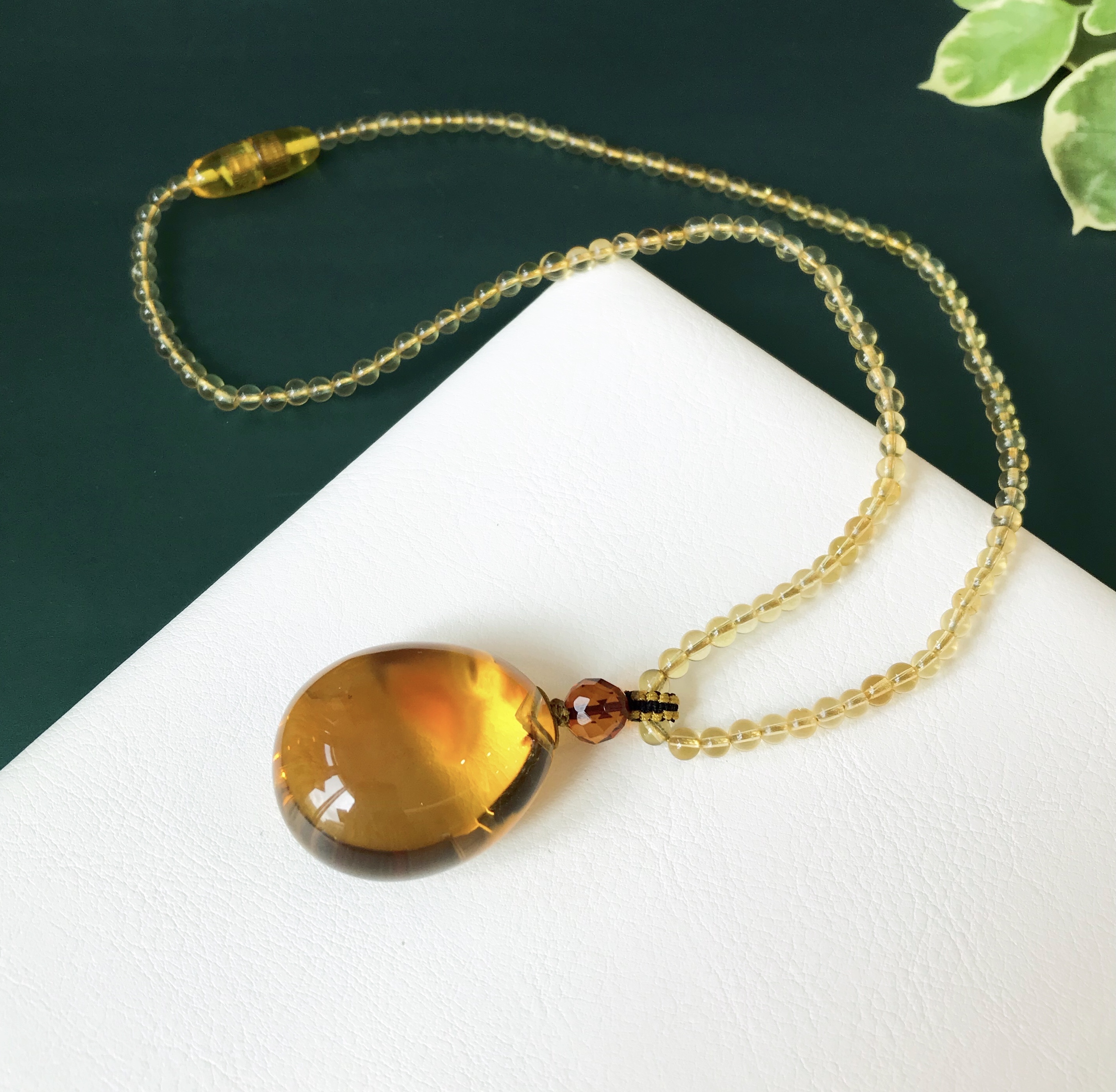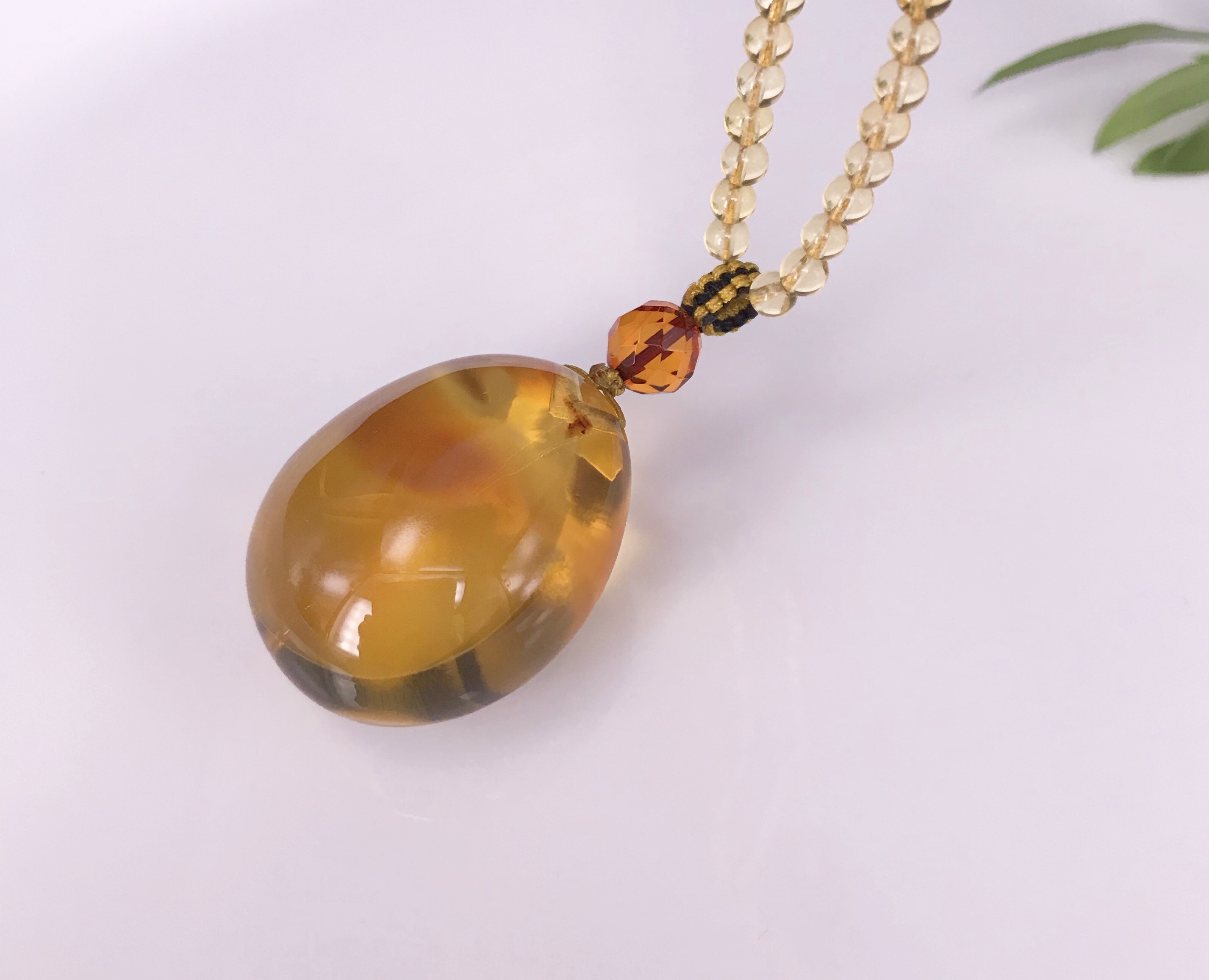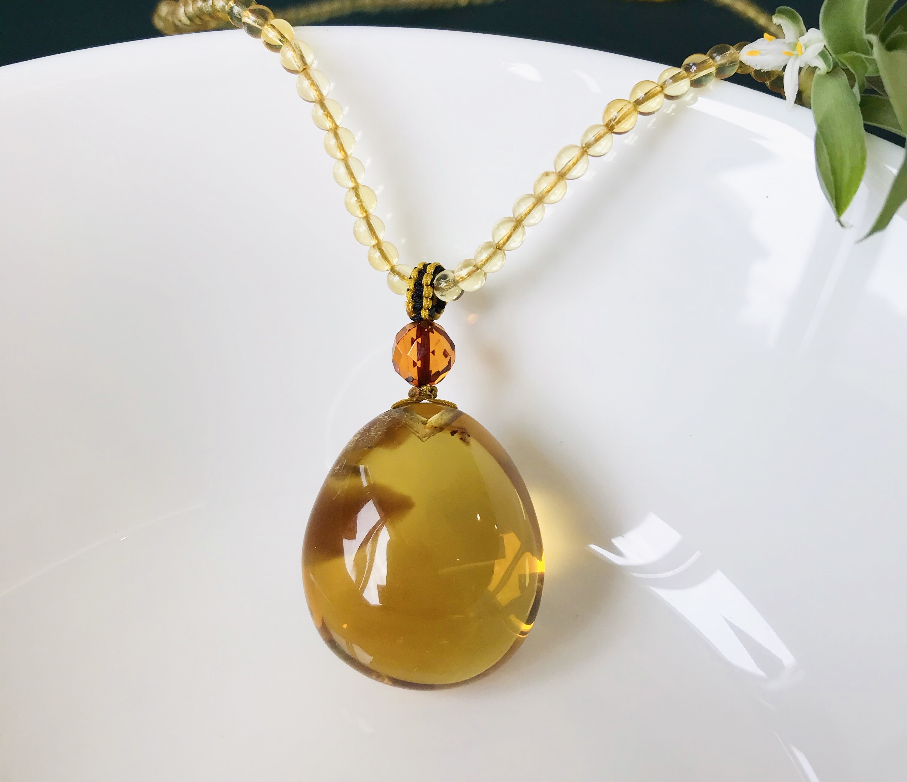 这件小精品可谓人见人爱,个头不大却内藏玄机,即是绿茶珀,又带有稀有的溶洞蜜(溶洞蜜是看起来类似溶洞般质感的缅甸琥珀品种,也属于缅甸珀中的高端珀种),晶晶亮亮,饱满圆润。给小美物搭配了同样可爱的高兰小珠链,手工精心编制了双色绳结将二者紧紧绑住,搭配同色系琥珀扣,戴起来清新无比,活力满满!