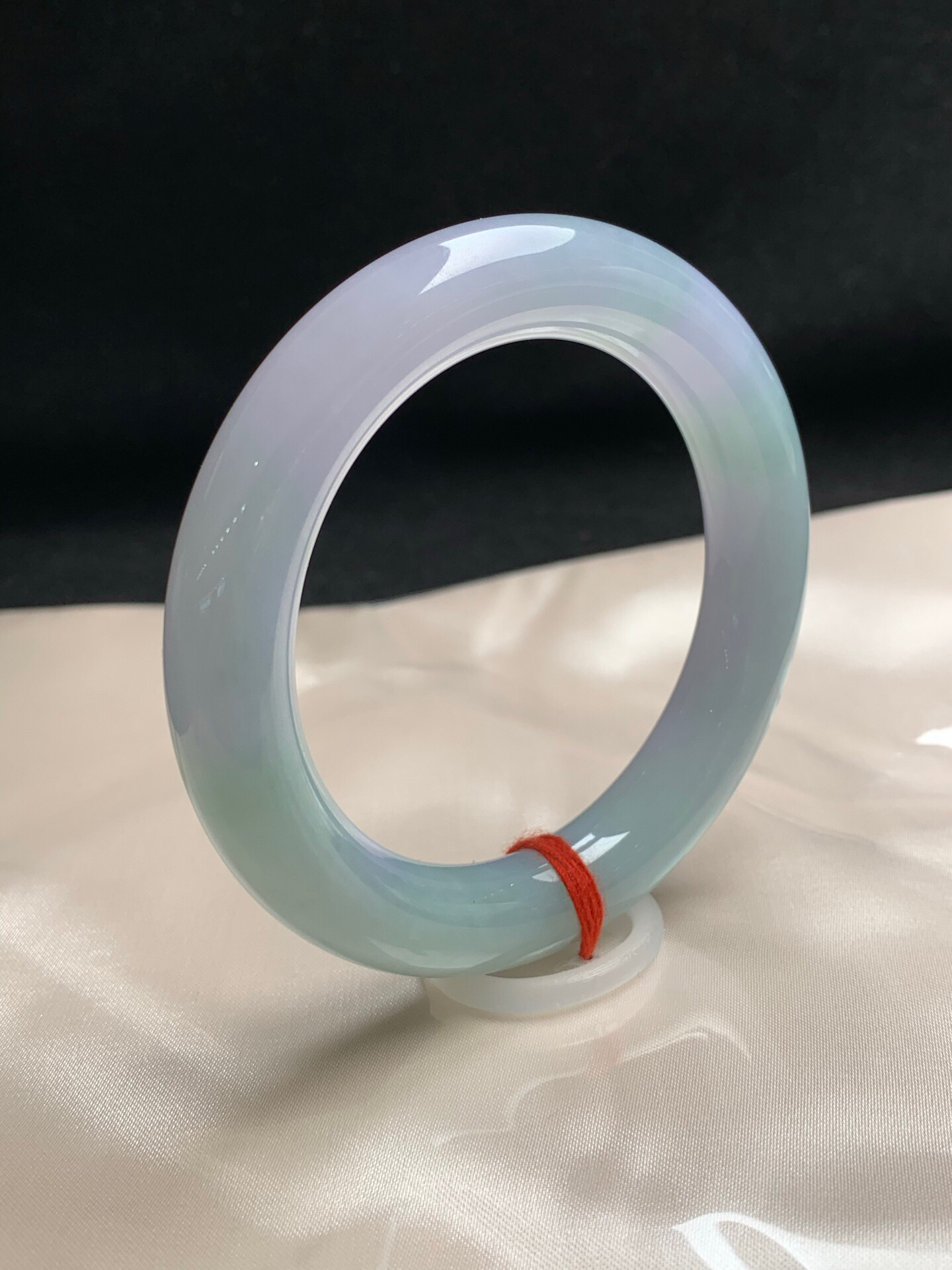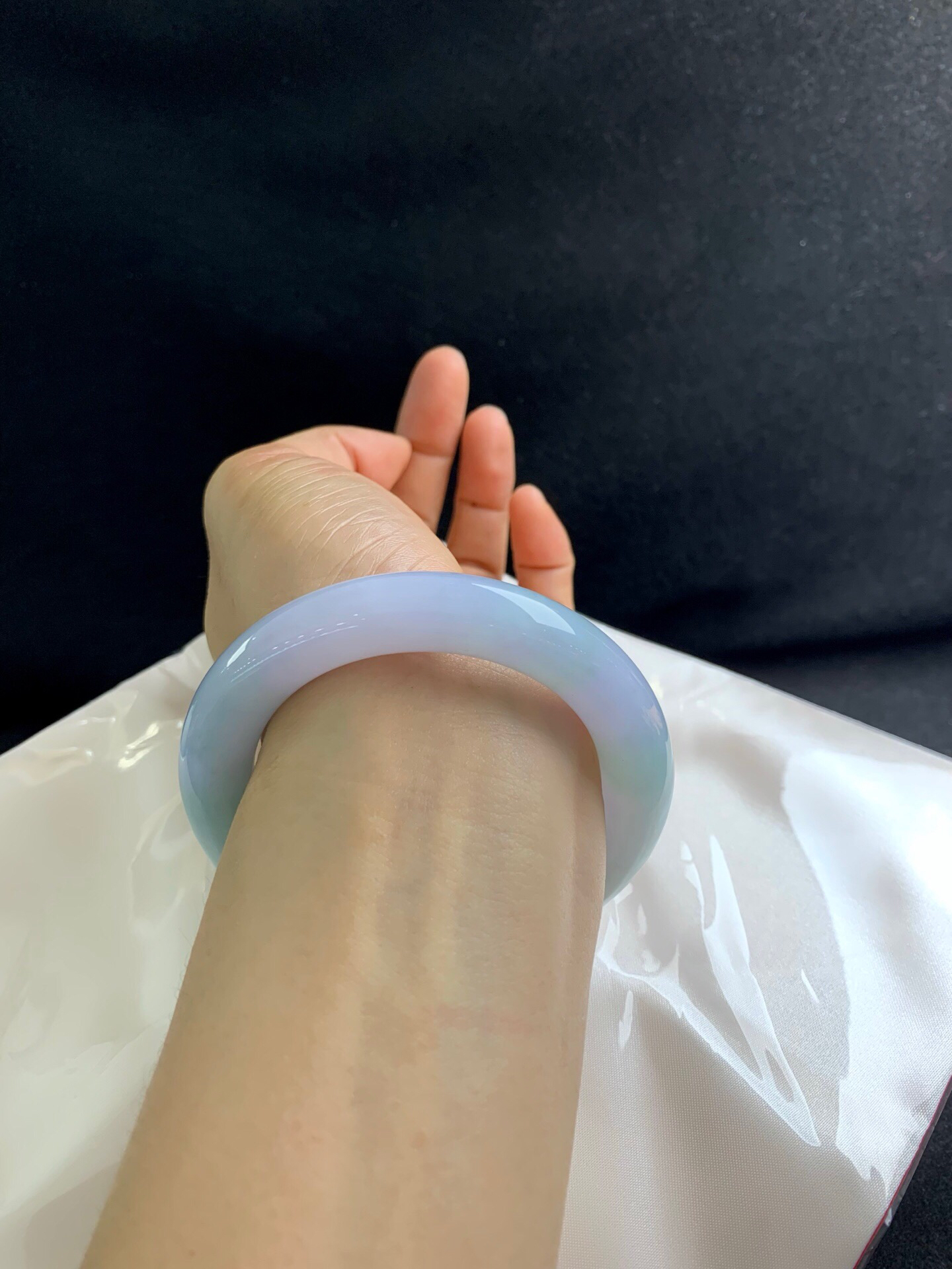 620711,55.3圈口,冰飘花正圈平安镯,老种,冰透起光,白底飘蓝花,条形秀气