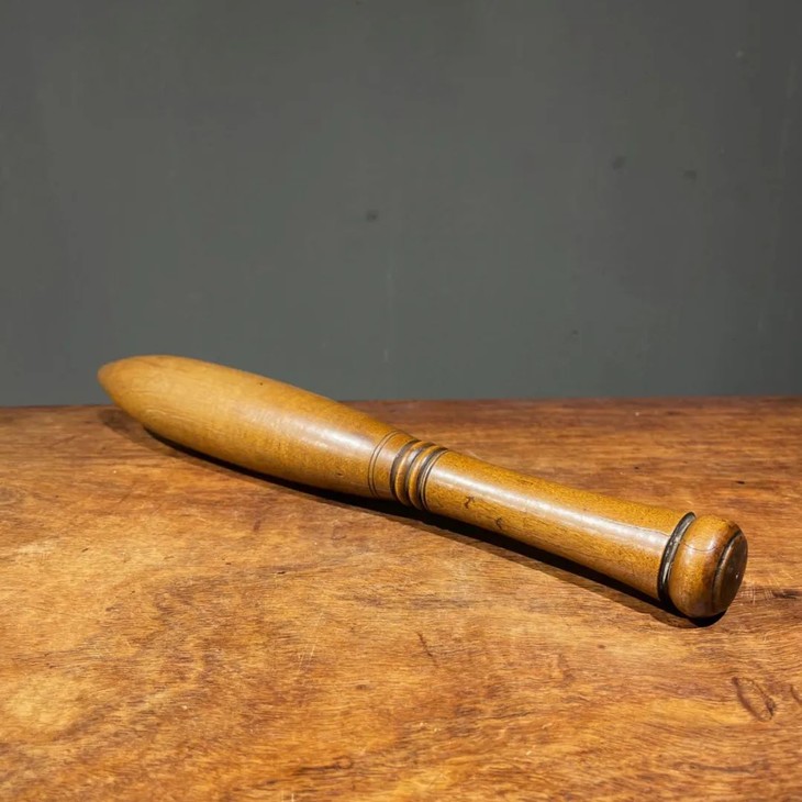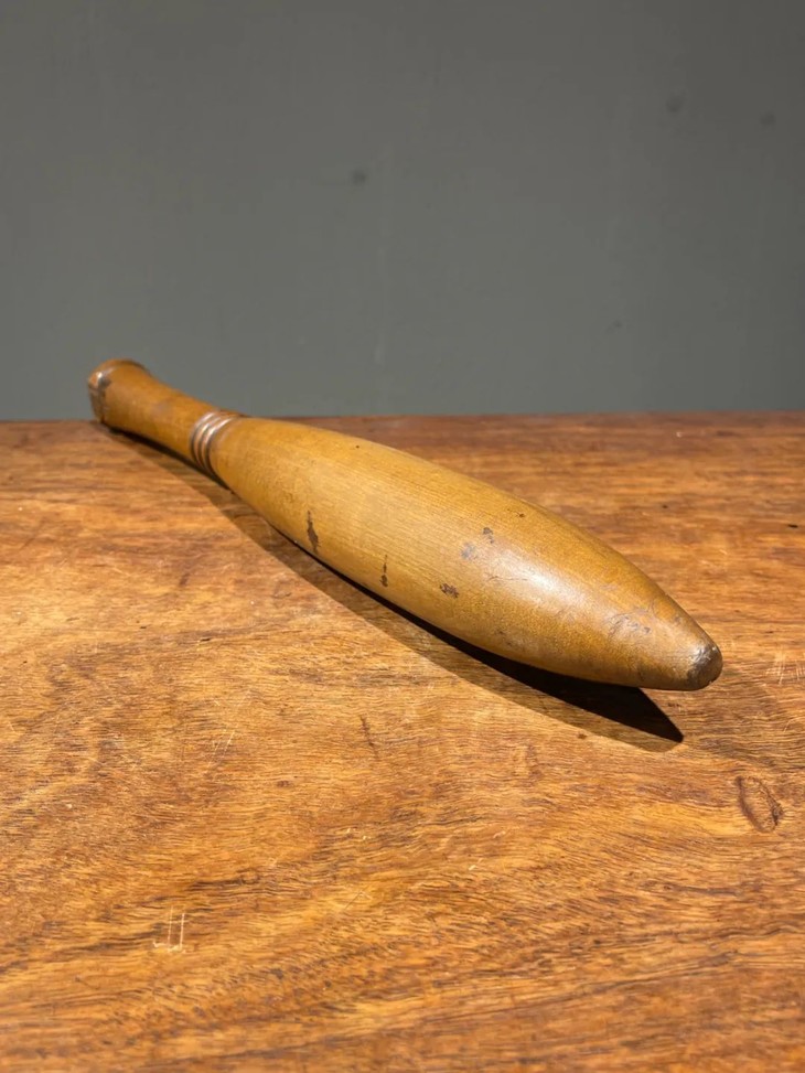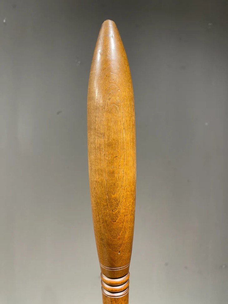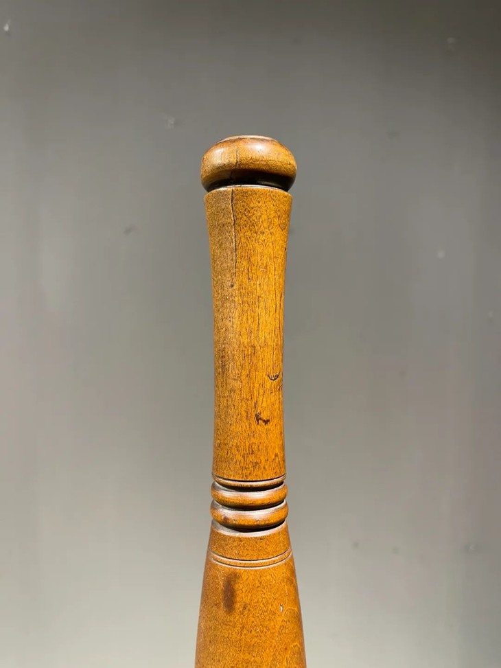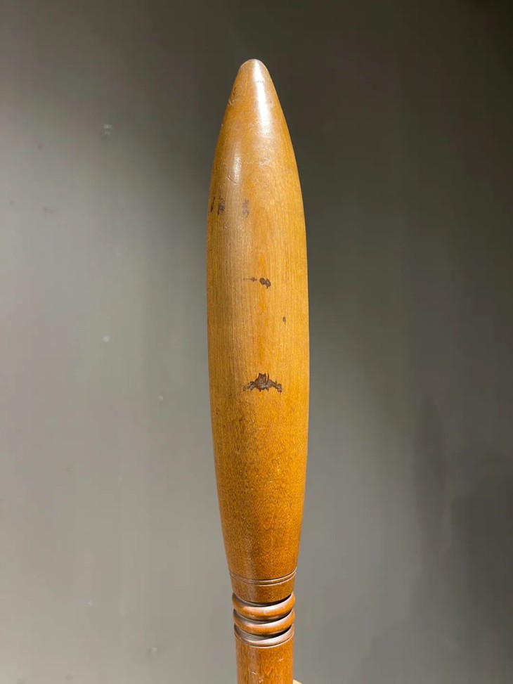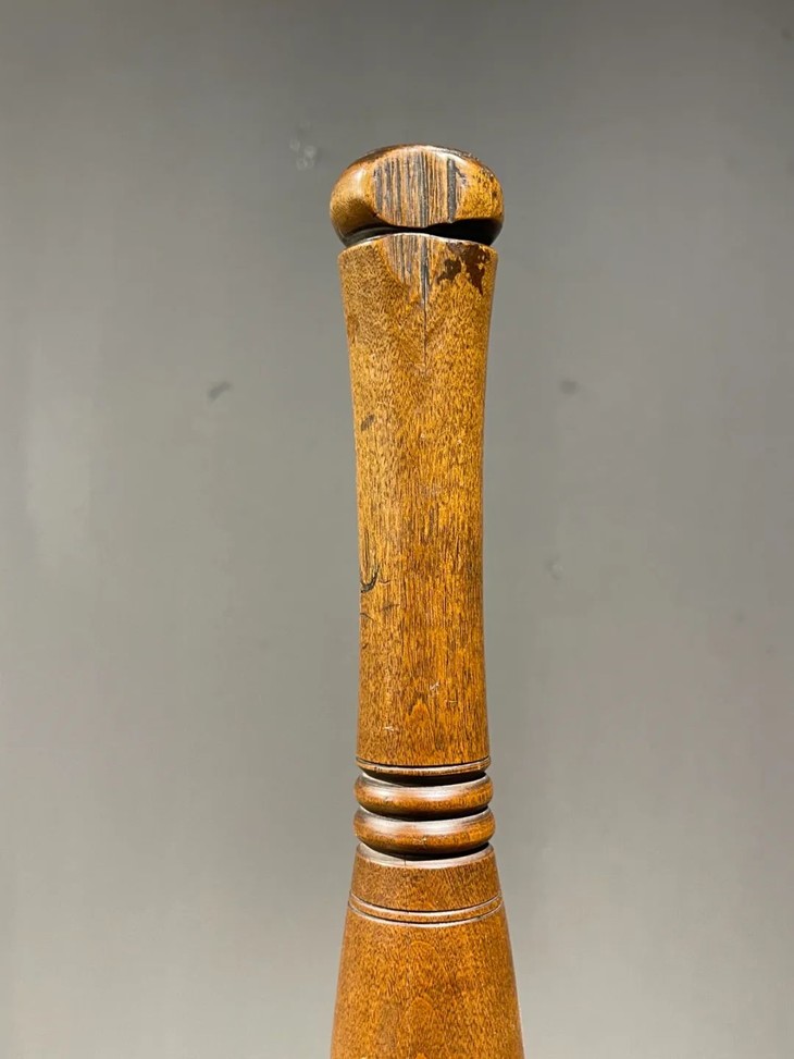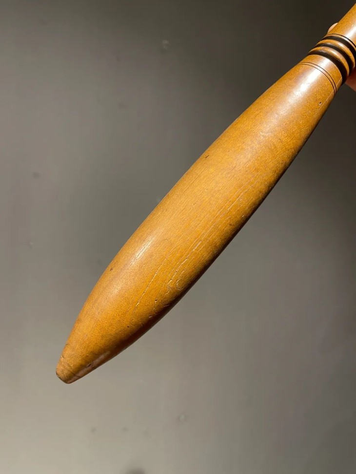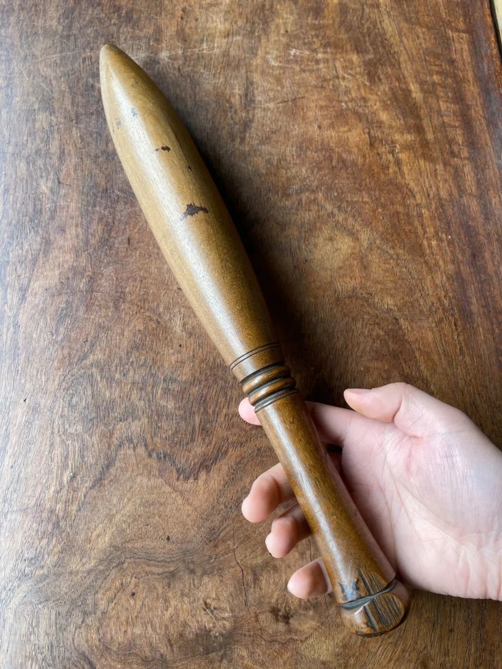 这是一件以黄杨木雕刻琢磨而成的流线弹头形棒槌棍,笔直的圆棍两端圆顶,长近四十厘米的长棍应是古人的宗教仪式法器或是练习武术功夫的棒棍,以质量特别好的黄杨木切割琢磨而成,带握柄流线弹头形棒槌棍,一体成型,无任何拼接与粘着,黄杨木质地坚硬,色泽柔美纯净,纹理清晰,老保浆皮壳温润细腻。