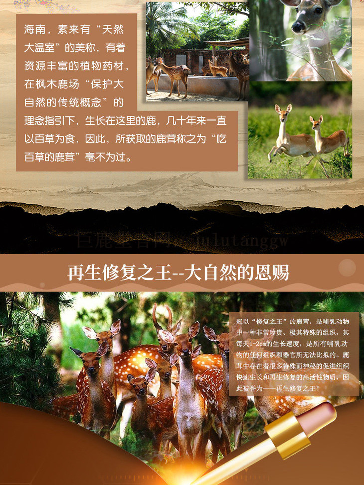 - 海南巨鹿堂公司是一家以鹿文化为核心的养殖、提炼(研究)、成品、销售的产业链公司,同时集生物工程研究,化妆品开发、生产、销售、培训、教育、服务及医学保健为一体的保健美容品专业机构。