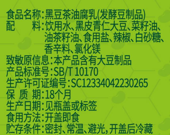 【产品配料】饮用水、黑皮青仁大豆、菜籽油、油茶籽油、食用盐、辣椒、白砂糖、香辛料、氯化镁