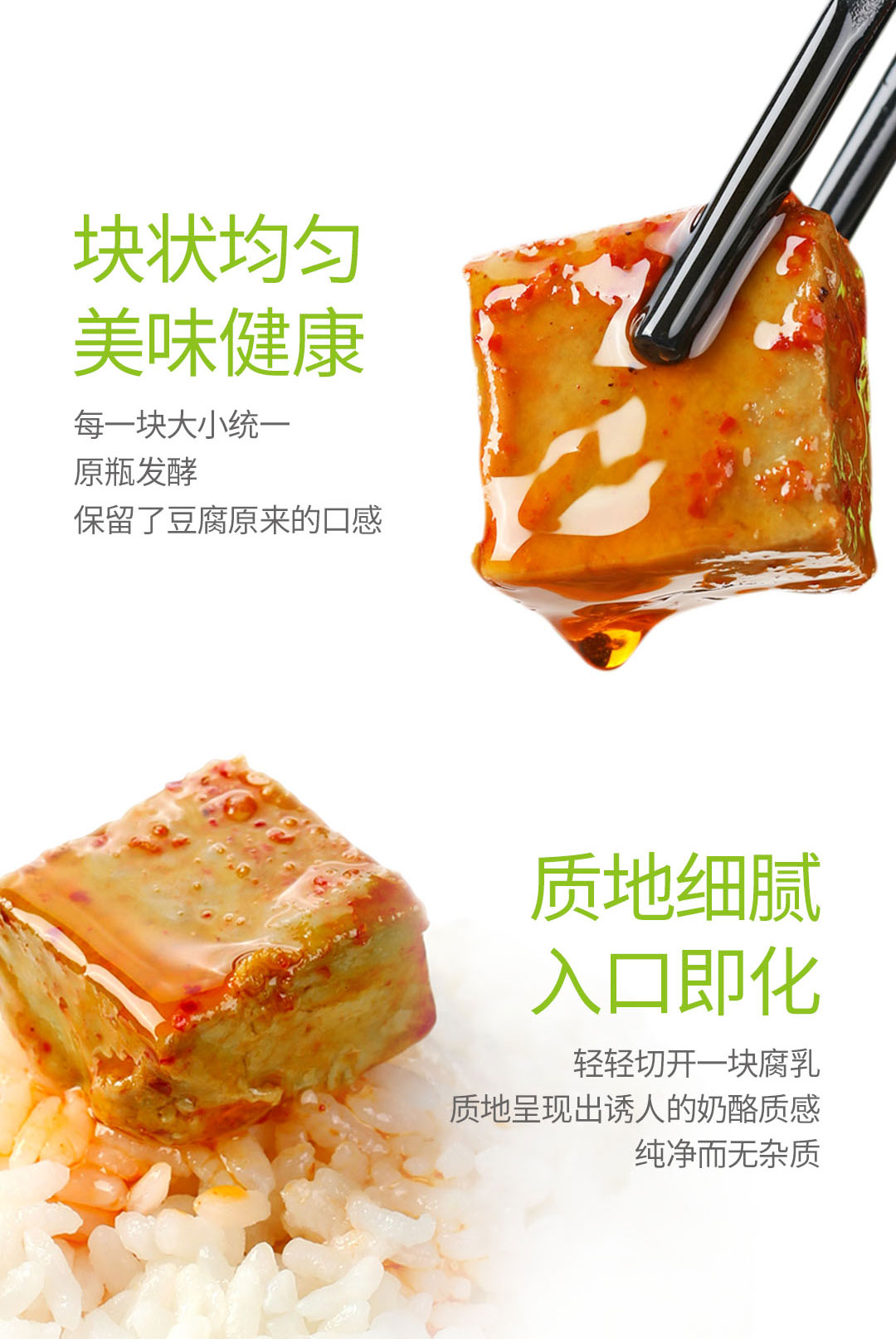 3、我们的腐乳属于发酵产品,质地比较软糯,再加上快递运输过程中产生颠簸,虽然有泡沫盒的保护,但是也会出现少量腐乳碎块的情况,这不属于产品质量问题,请放心食用;