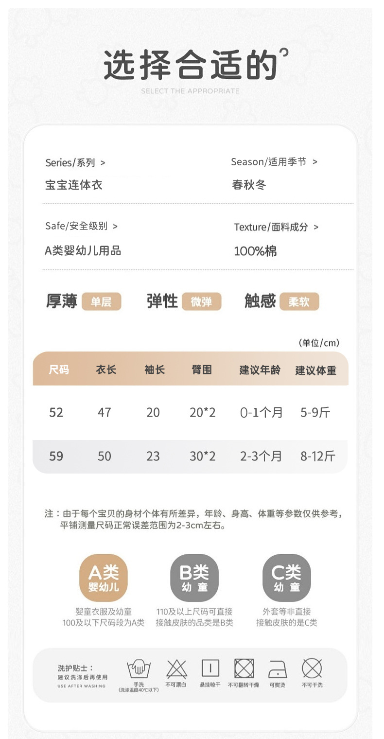 【40S高纱支 婴幼儿裸穿安心之选】新生儿衣服四季可穿a类月子服全棉魔术贴宝宝0-3月初生婴儿连体衣