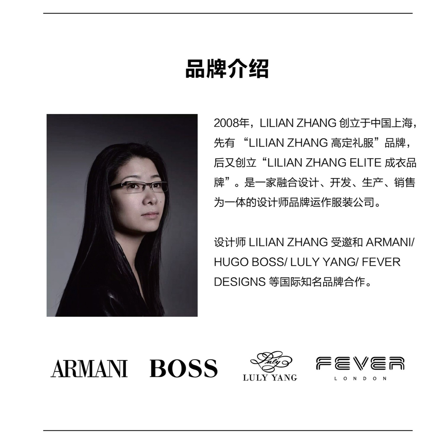 - LILIAN ZHANG ,创立于2008年,为 ARMANI 等国际品牌设计创作时装。 LILIAN ZHANG 坚持原创设计、坚持立体剪裁、坚持颠覆奢侈品价格、坚持简约经典 ,深受时尚女性喜爱。