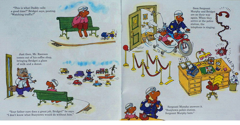 在A Day at the Police Station《警察局的一天》中,墨菲警官的女儿布里奇抱怨爸爸工作太忙,周末都不带她去游乐场玩。于是墨菲就把布里奇带到警局去,布里奇跟着爸爸处理交通事故,为大河马希尔达驱逐“浴室幽灵”,帮助走丢的小孩回家,还破获了一起“盗窃案”。这一天布里奇过得非常开心,她为有一个当警察的爸爸感到骄傲。这本小书向孩子们介绍了警察局的日常工作,让他们了解到警察对于保障人们安静的生活是多么重要。