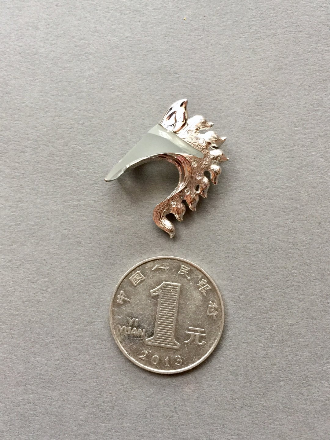 翡翠高冰种翡翠马头胸针,镶嵌后29.7*29.2*10mm。记得很早以前看过大树用异形裸石设计的山水,很喜欢,心想自己也要做一个。历时四个月的用心打造,最终呈现,雕塑感的18k白金镶嵌马头胸针,款式大气洒脱,首饰与石的结合特别好,总算没有辜负这块漂亮的美玉,单单金的成本就花了几千,不容错过的宝贝,推荐了