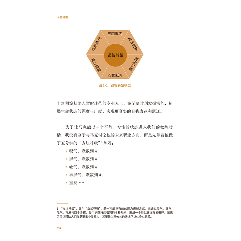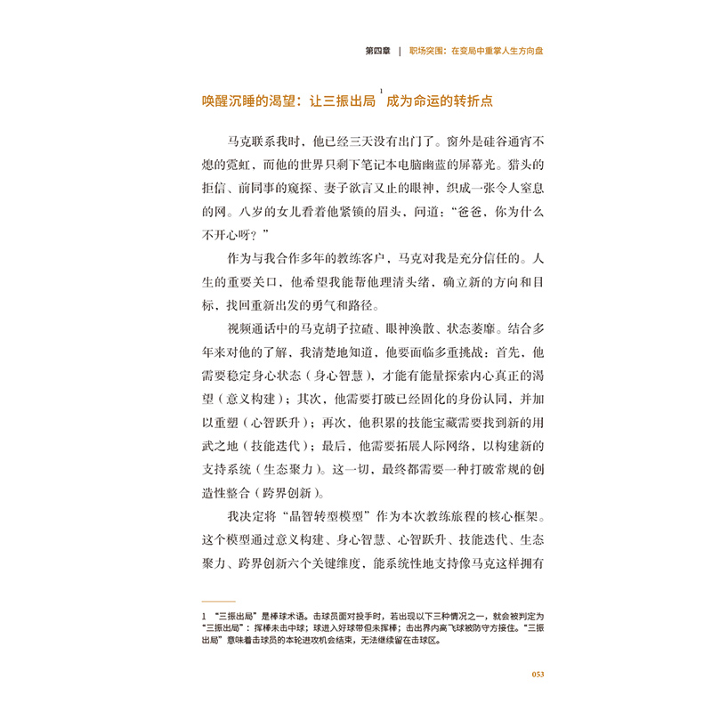 唤醒沉睡的渴望:让三振出局 成为命运的转折点马克联系我时,他已经三天没有出门了。窗外是硅谷通宵不熄的霓虹,而他的世界只剩下笔记本电脑幽蓝的屏幕光。猎头的拒信、前同事的窥探、妻子欲言又止的眼神,织成一张令人窒息的网。八岁的女儿看着他紧锁的眉头,问道:;爸爸,你为什么不开心呀?作为与我合作多年的教练客户,马克对我是充分信任的。人生的重要关口,他希望我能帮他理清头绪,确立新的方向和目标,找回重新出发的勇气和路径。视频通话中的马克胡子拉碴、眼神涣散、状态萎靡。结合多年来对他的了解,我清楚地知道,他要面临多重挑战:首先,他需要稳定身心状态(身心智慧),才能有能量探索内心真正的渴望(意义构建);其次,他需要打破已经固化的身份认同,并加以重塑(心智跃升);再次,他积累的技能宝藏需要找到新的用武之地(技能迭代);最后,他需要拓展人际网络,以构建新的支持系统(生态聚力)。这一切,最终都需要一种打破常规的创造性整合(跨界创新)。我决定将;晶智转型模型作为本次教练旅程的核心框架。这个模型通过意义构建、身心智慧、心智跃升、技能迭代、生态聚力、跨界创新六个关键维度,能系统性地支持像马克这样拥有丰富积淀却陷入暂时迷茫的专业人士,在至暗时刻发掘潜能,拓展生命状态的深度与广度,实现更真实的自我表达和跃迁。为了让马克能以一个平静、专注的状态进入我们的教练对话,我没有急于与马克讨论他的未来职业方向,而是先带着他做1了五分钟的;方块呼吸 练习:bull; ?吸气,默数到4;bull; ?屏气,默数到4;bull; ?吐气,默数到4;bull; ?再屏气,默数到4;bull; ?重复