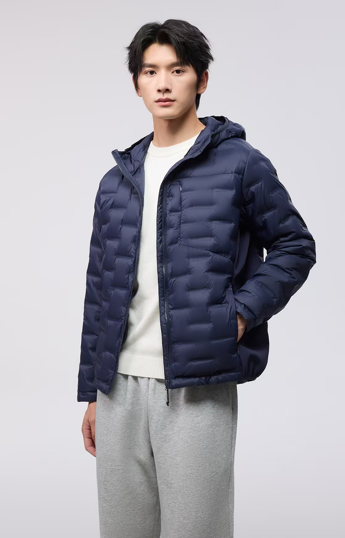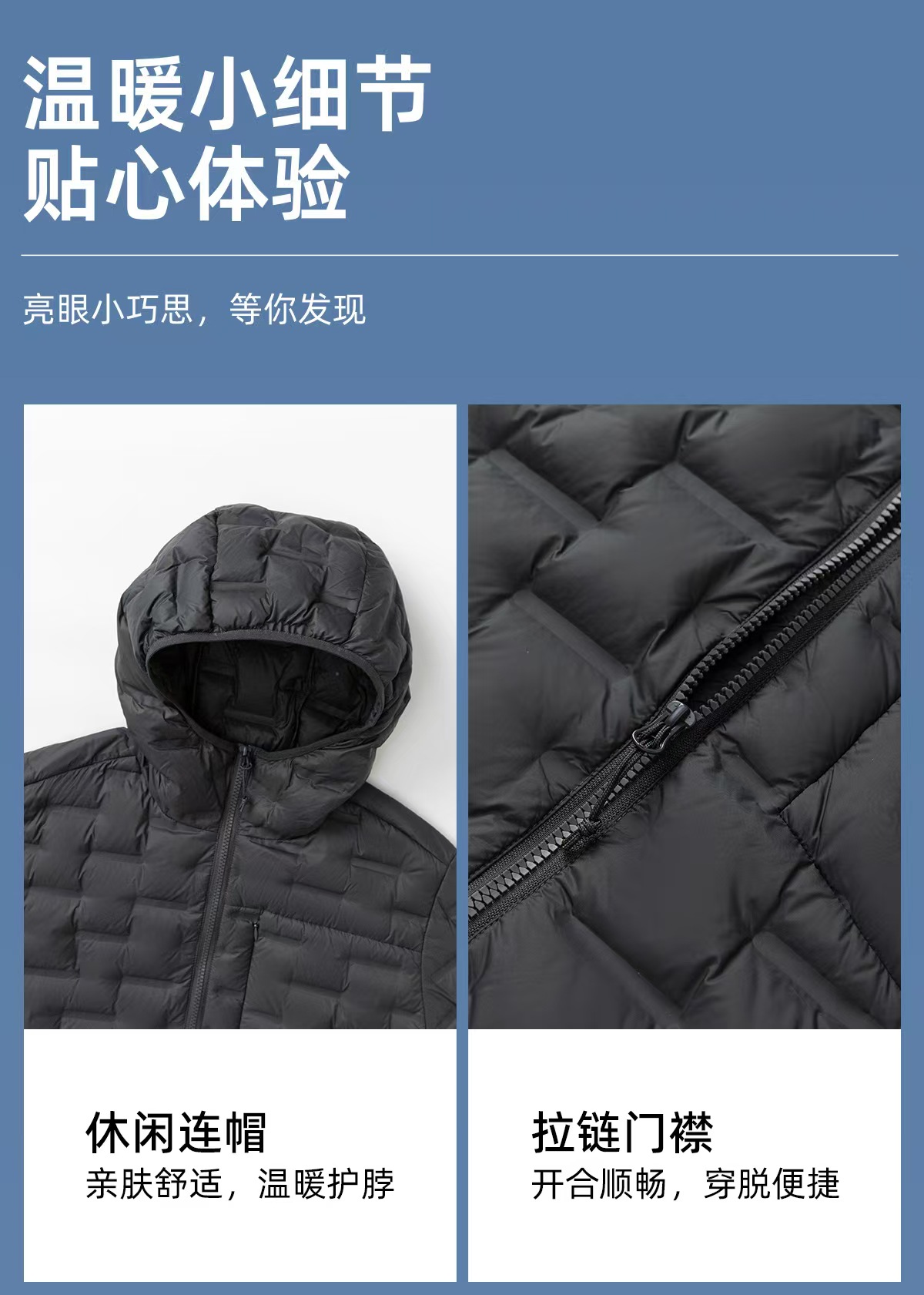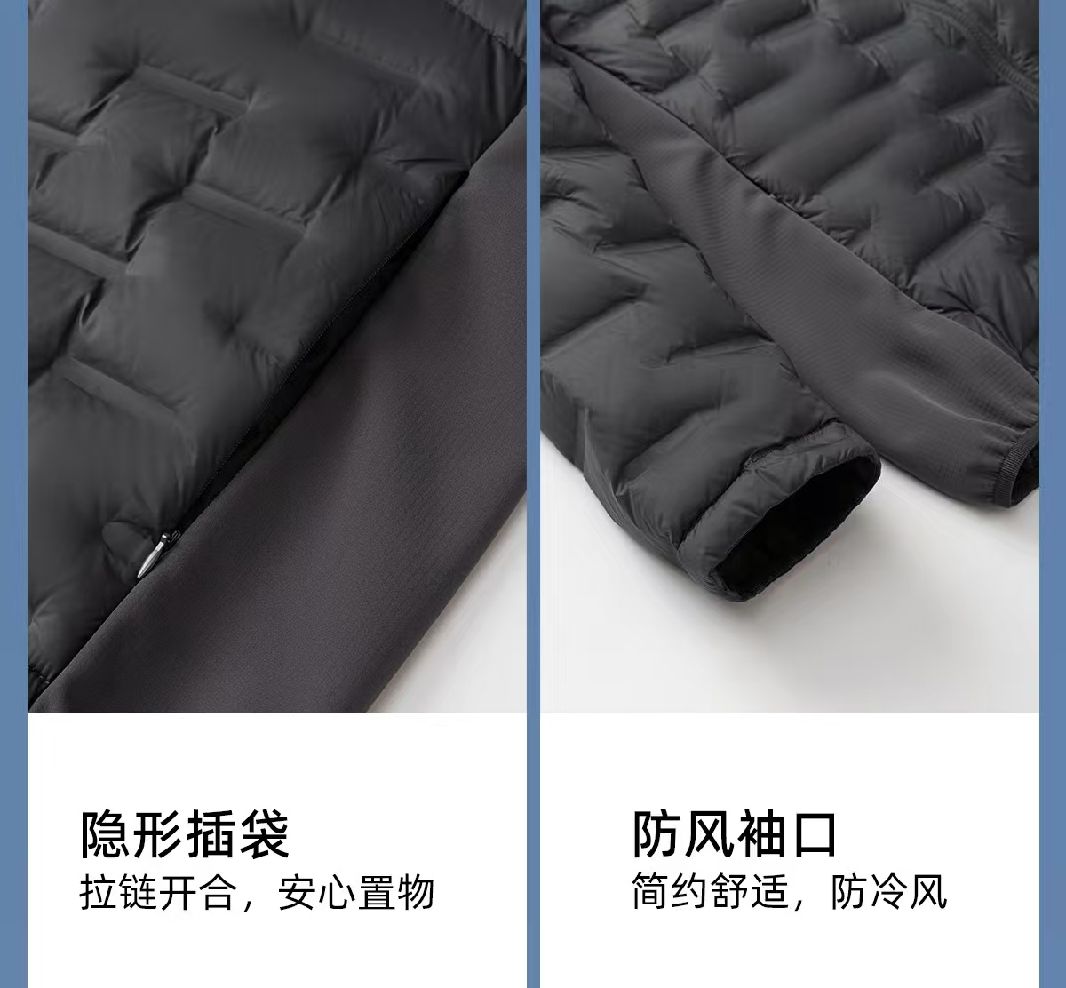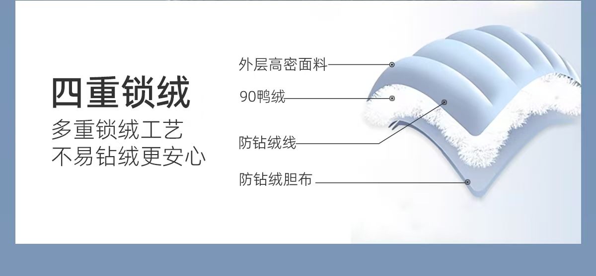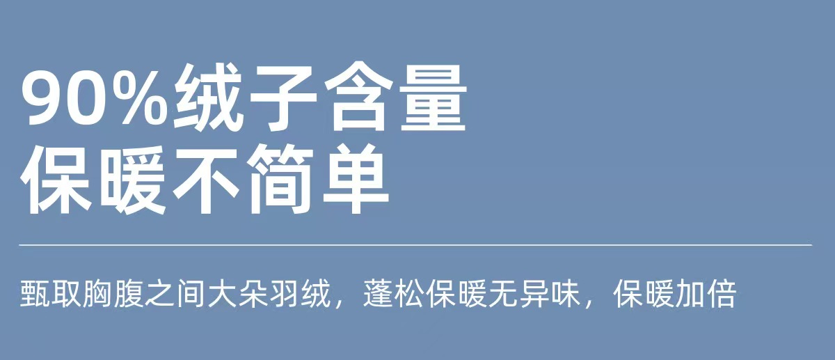 拼接轻羽绒,采用高品质90鸭绒填充,轻盈蓬松却锁温强劲