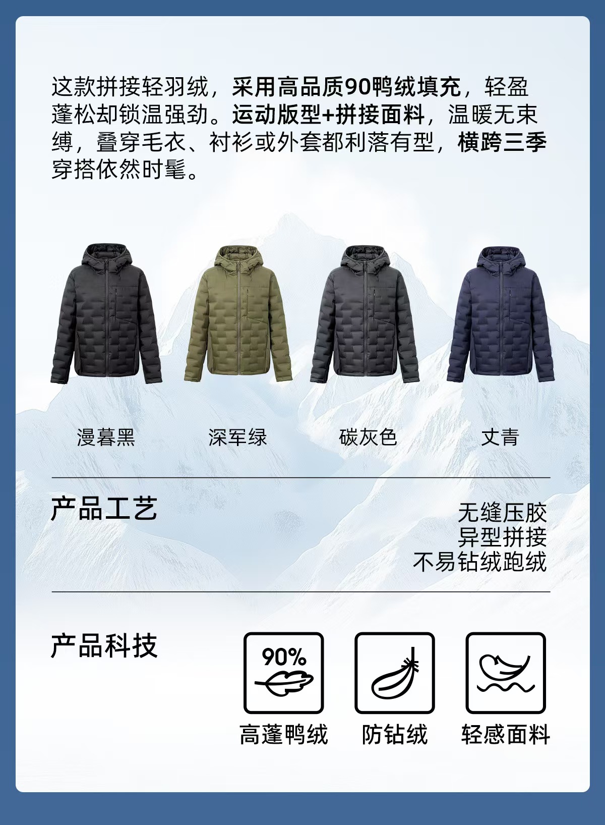 无缝压胶,异型拼接不易钻绒跑绒,90高蓬鸭绒,防钻绒 轻感面料。