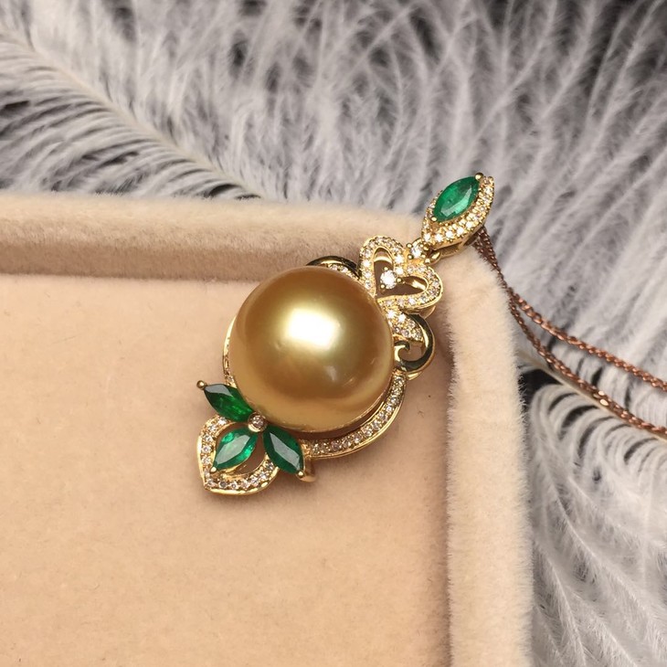 【400198】南洋金珠套装,18k重金伴钻祖母绿豪镶,精选珠子正圆,珍珠光泽,皮光细腻,款式时尚别致,美丽动人,您值得佣有,一套佩戴上身气质佳。尺寸吊坠13mm戒指10.7mm一套克重11.6g一套结缘价12300 可单出