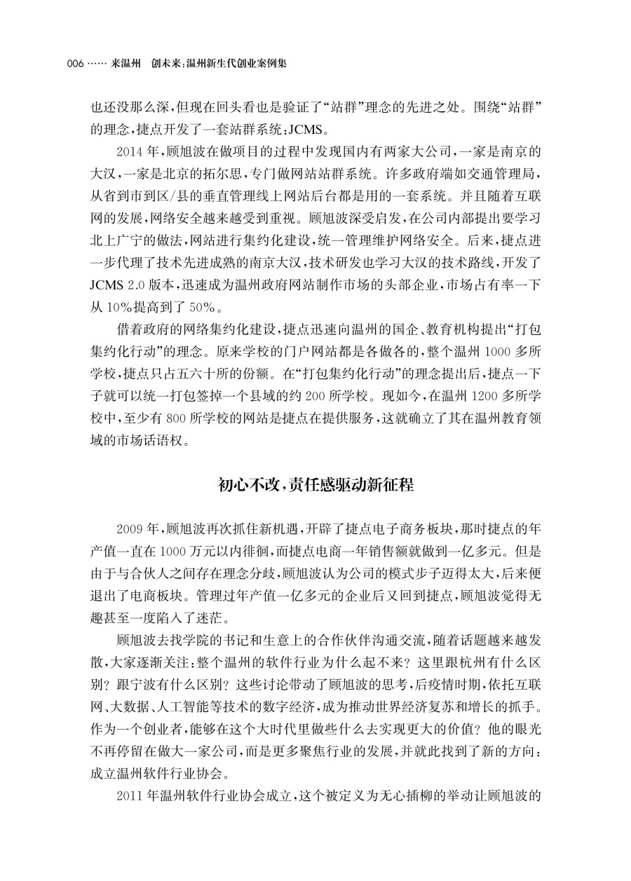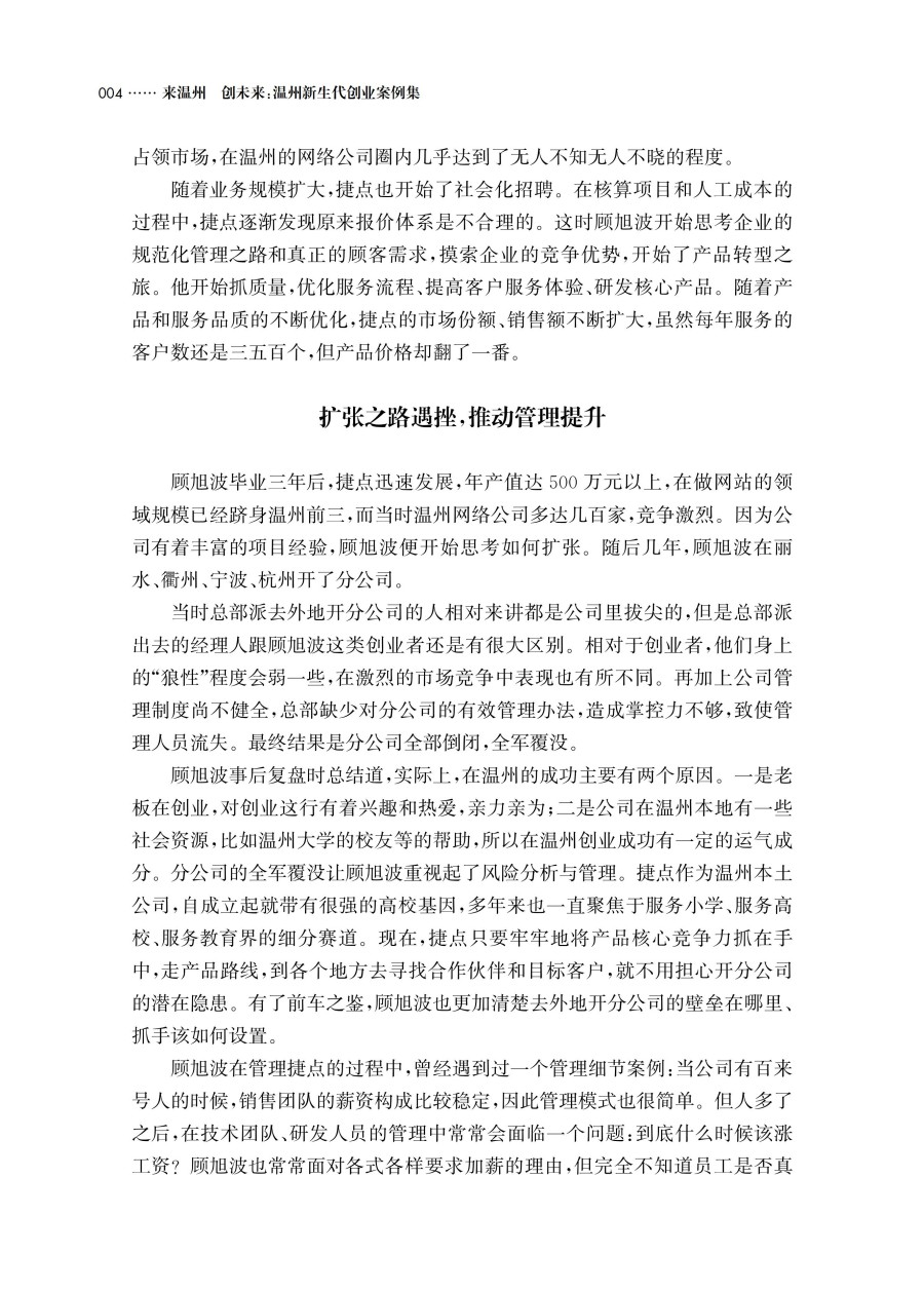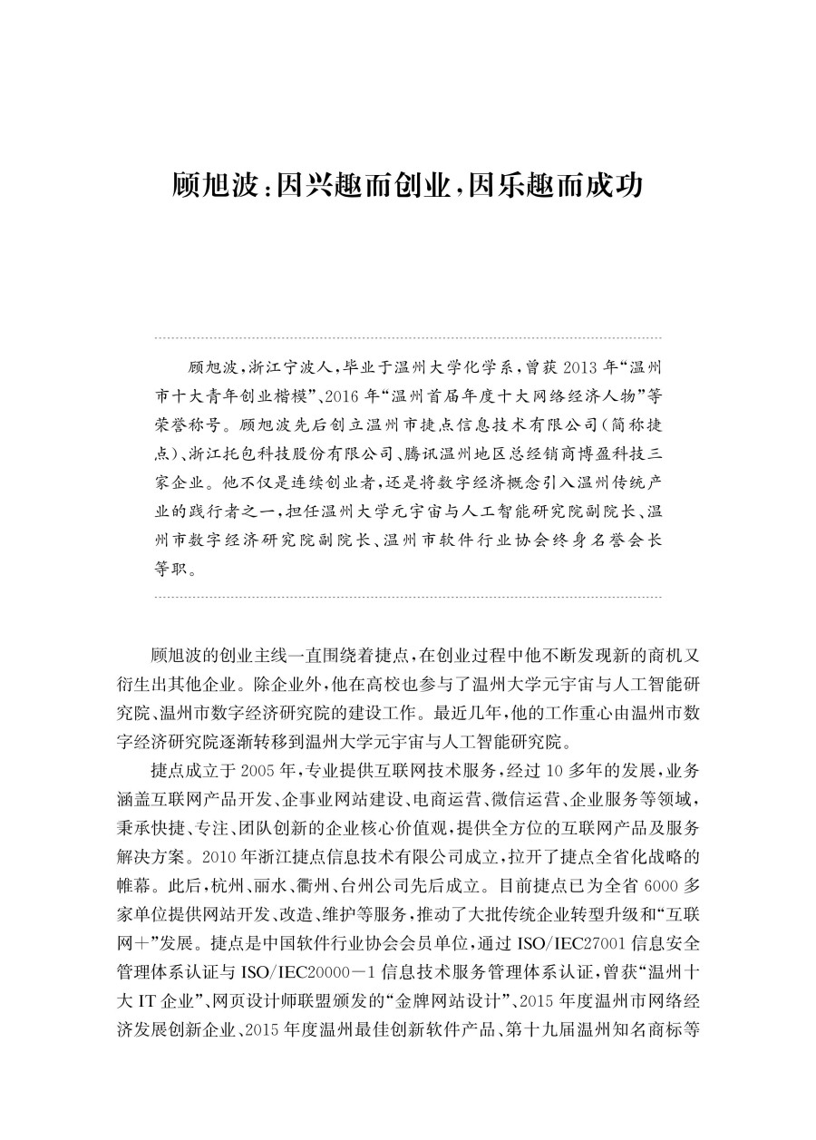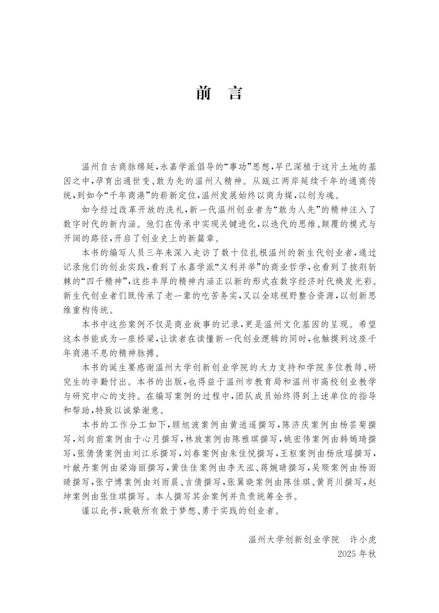 温州素来有中国创业之都的美誉,孕育了无数白手起家的商业英才,他们的创业历程不仅是个人的奋斗史,更是中国经济迅速崛起历程中不可或缺的一部分。本书聚焦于新一代在温州扎根创业的青年群体,收集整理十余个优秀创业者的创业案例,分享新的时代背景之下新温州人的创业选择和创业故事。这些创业者或者从平凡的生活中捕捉到创业的火花,或者在传统行业中寻找突破,通过技术创新或商业模式革新实现差异化竞争,或者在家族企业的薪火相传中摸索出新的创业方法论。在他们身上展现了新温州人在当今时代特色下的创业思考和转型历程,也体现出了新时代老温州的四千精神。本书包含多个不同行业、不同规模、不同发展阶段的创业者故事。这些案例的多样性有助于读者从多个角度了解新温州人的创业风貌,感受敢为天下先的创业精神,汲取不同创业者的经验智慧,为有志于创业的人群提供全面的理解和洞察。本书适合大学生,想要创业或正在创业的人群