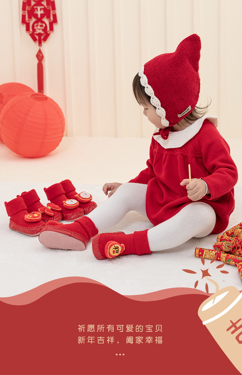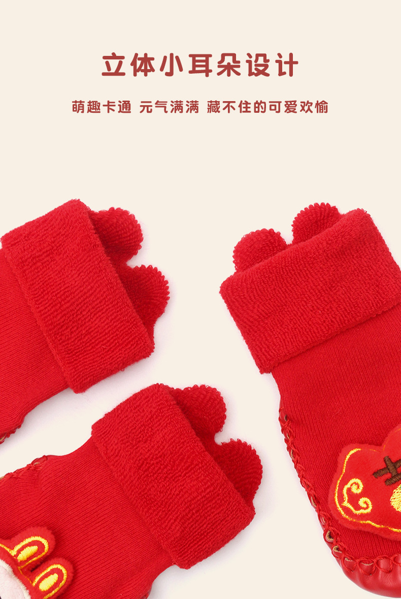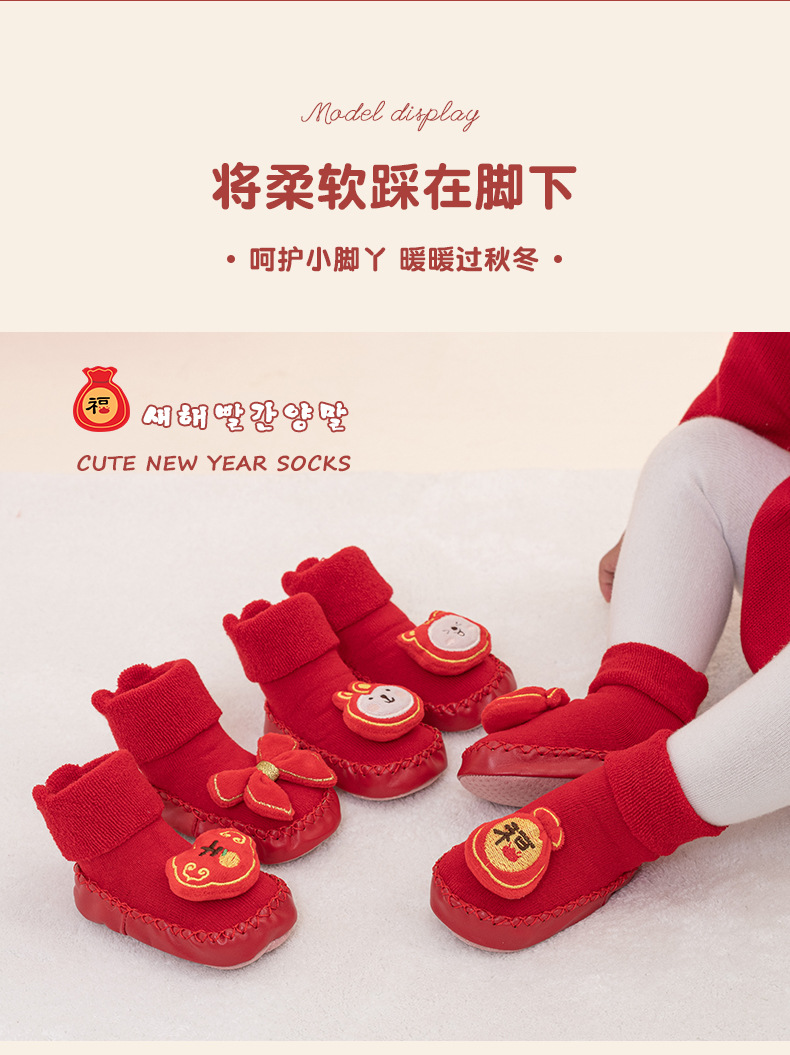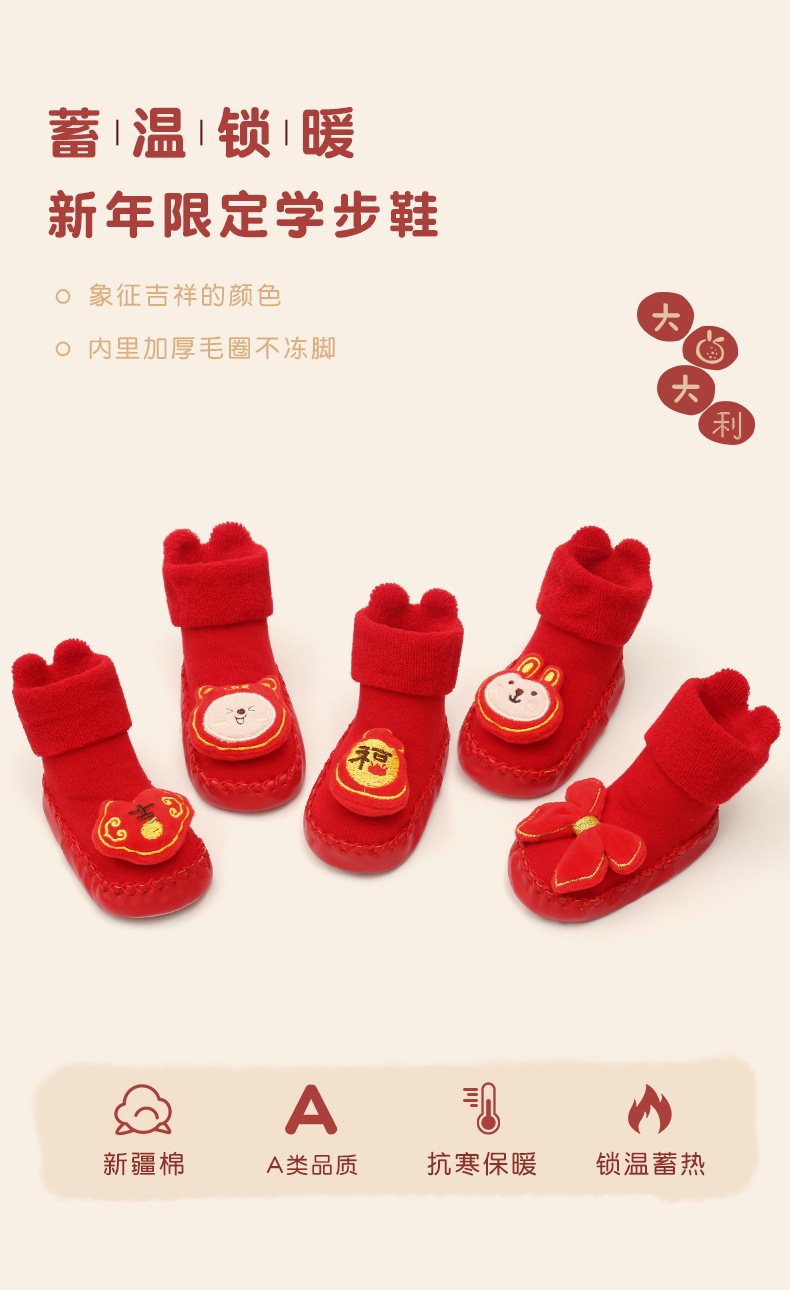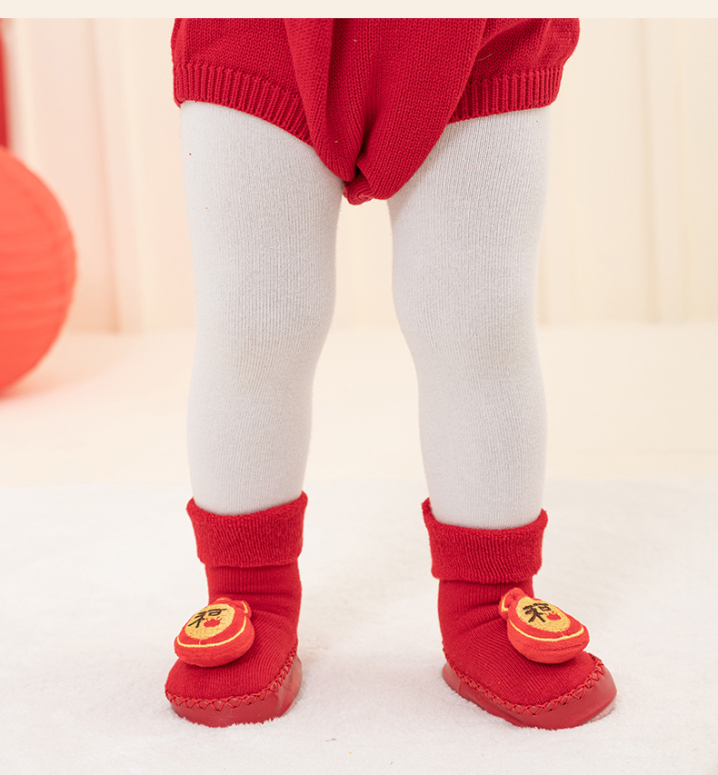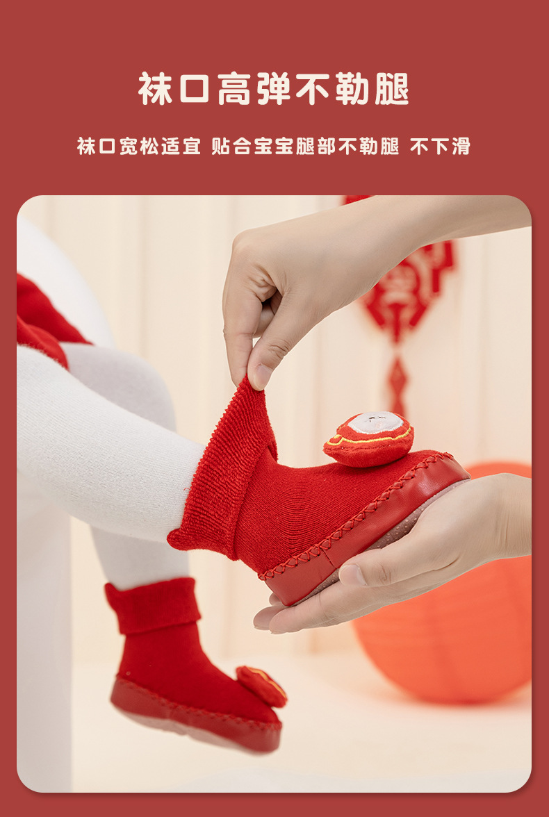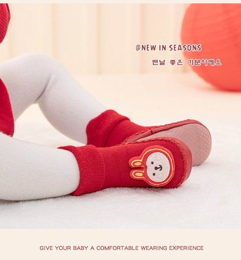 【2双装 新年限定学步鞋】23兔年大红加厚宝宝学步鞋婴幼儿小童公仔卡通袜子毛圈新年皮底袜