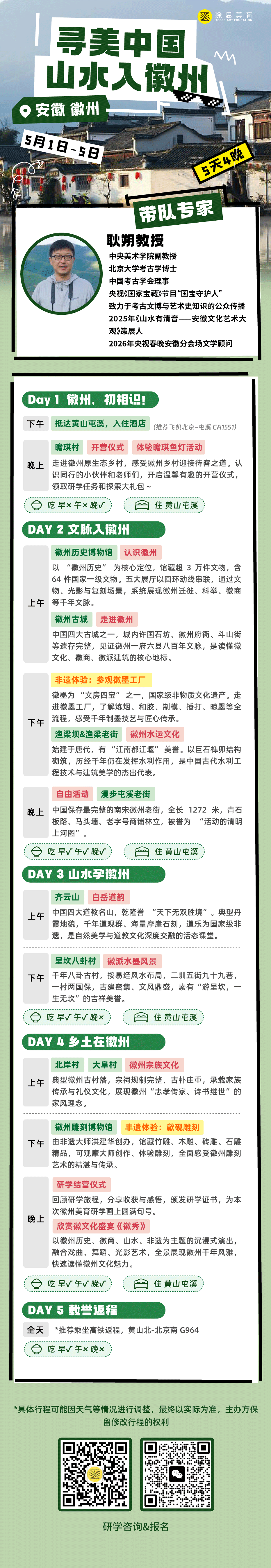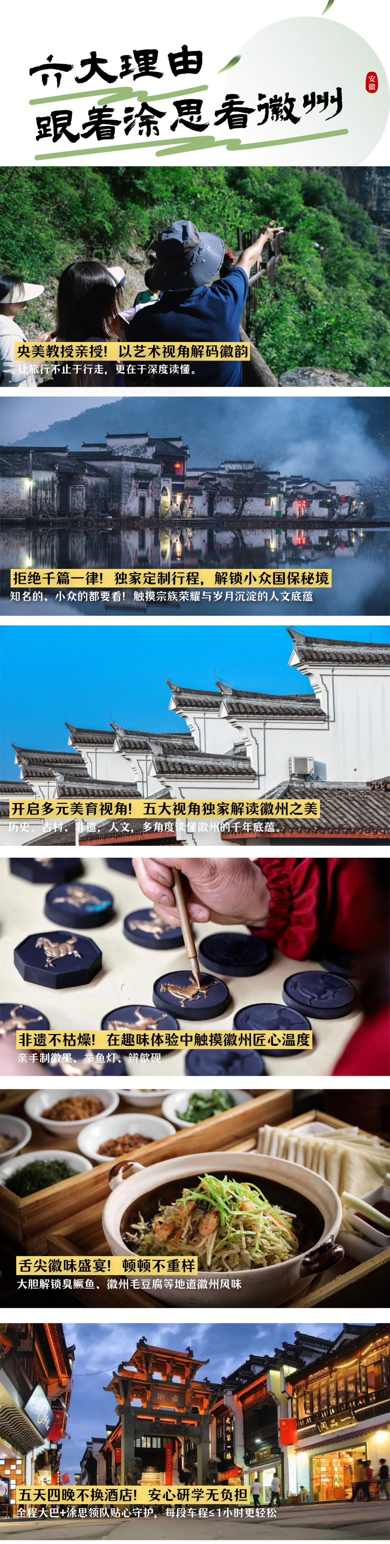 从唐宋的文风初兴,到明清的徽商鼎盛,徽州的历史从未褪色。赴这场徽州研学之约,便是与千年文脉温柔对话——唯有亲身踏足,方能读懂“一生痴绝处,无梦到徽州”的深情;唯有躬身前行,方能触摸历史的温度、传承文化的根脉,让山水的灵秀、古村的底蕴、匠心的坚守,都成为成长路上最珍贵的滋养。