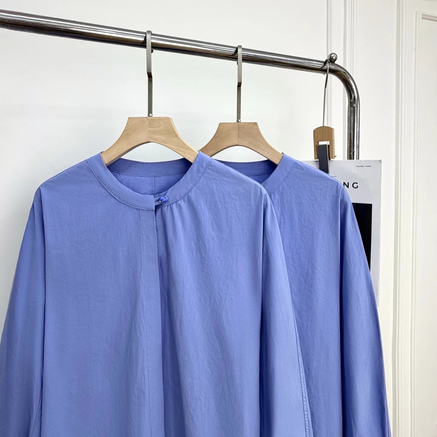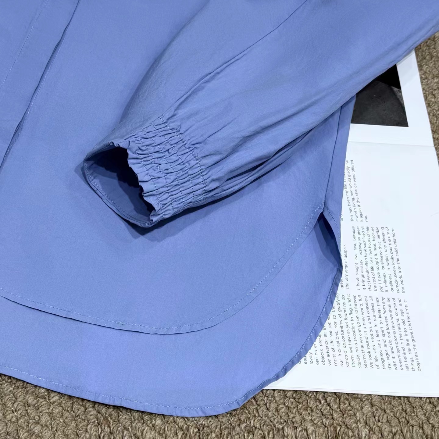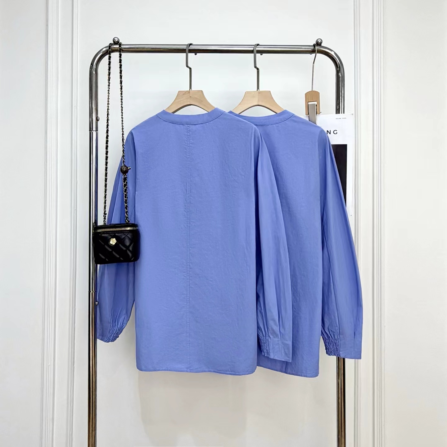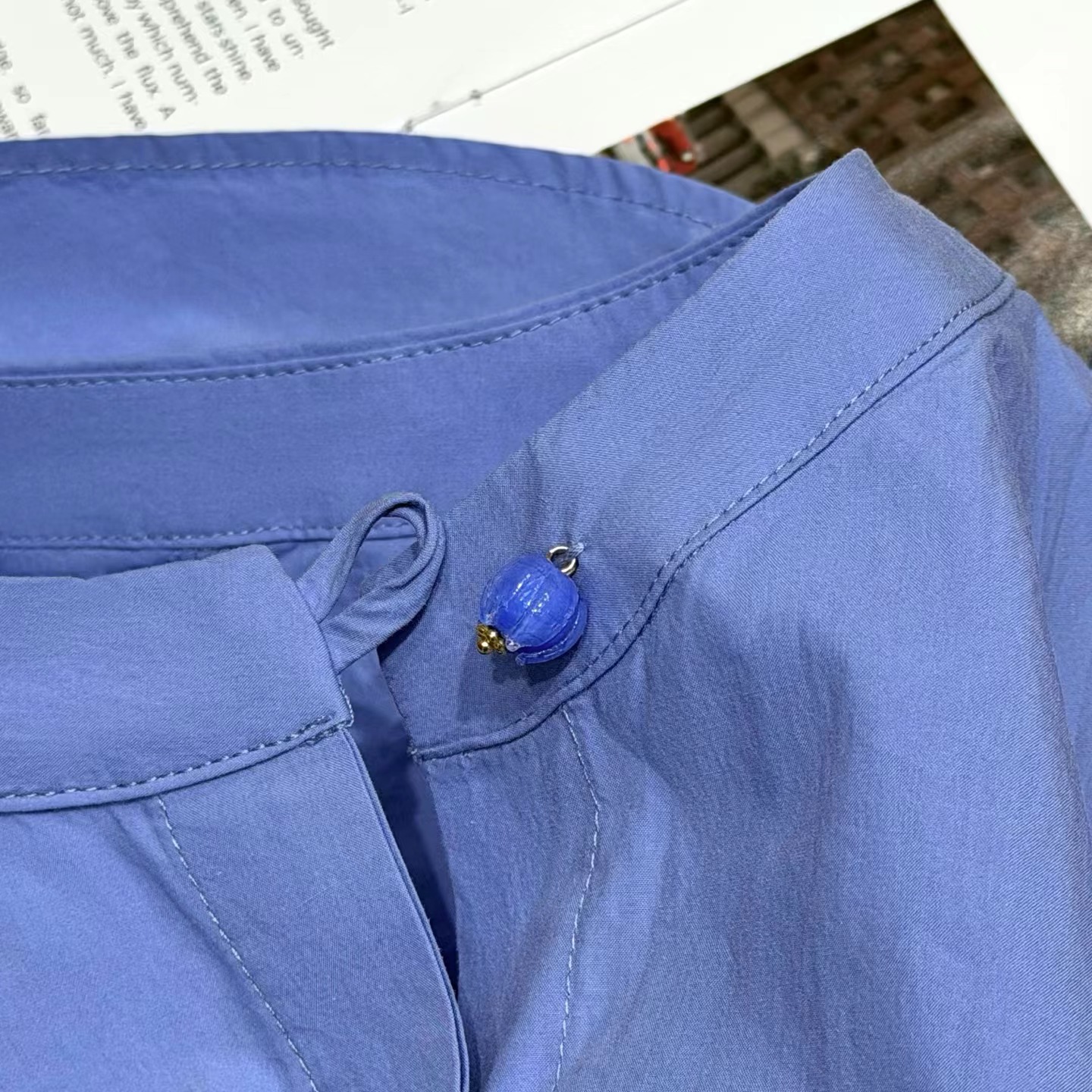 显白蔚蓝色~早春新款新中式设计感领口盘扣气质衬衫,轻中式风格的立领衬衫,采用小立领,利落贴合颈部线条,不会卡脖子,还能修饰脖颈比例,适配项链、耳饰等配饰。领口同色盘扣加入领部细节,保留中式雅致,又能适应日常实穿需求。宽松利落的外廓线条,克制而不拘束,双层隐藏式门襟精减细节,让外观干净简洁!长袖做了微收的灯笼袖处理,袖口收褶+木耳边装饰增加设计感,带点小俏皮感,一秒减龄!弧形开叉下摆,前短后长,两侧开叉,时髦有层次,更加修饰臀部线条,恰好遮住臀胯视觉显瘦,同时也方便掖进下装,利落干练。选用纯棉面料,质感棉柔且挺阔有型,易于日常打理!羔级又纯净的蓝色,颜色清新淡雅,上身有一种清冷的贵气感!搭配裤装裙装随意切换不同风格,特别喜欢,推荐