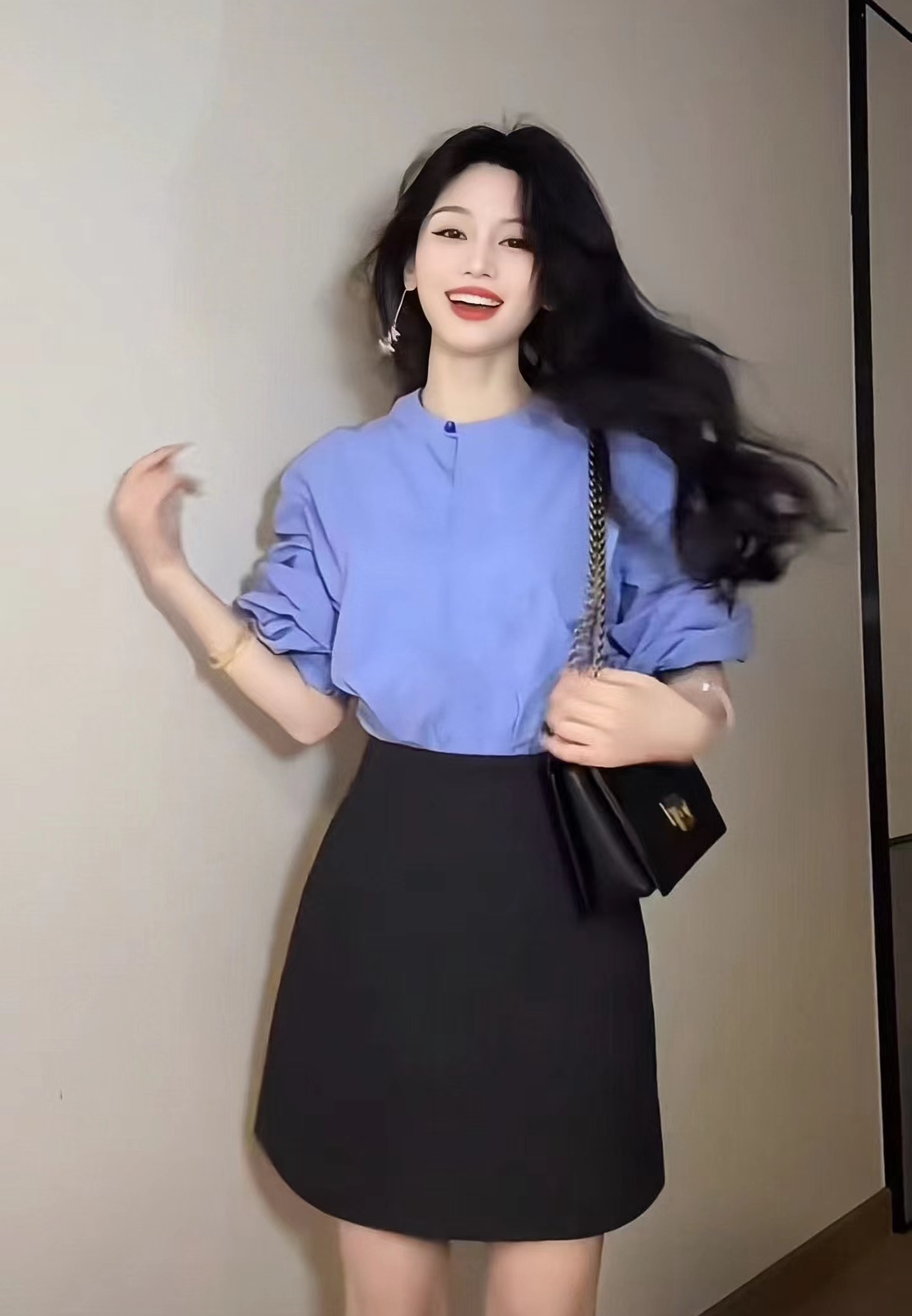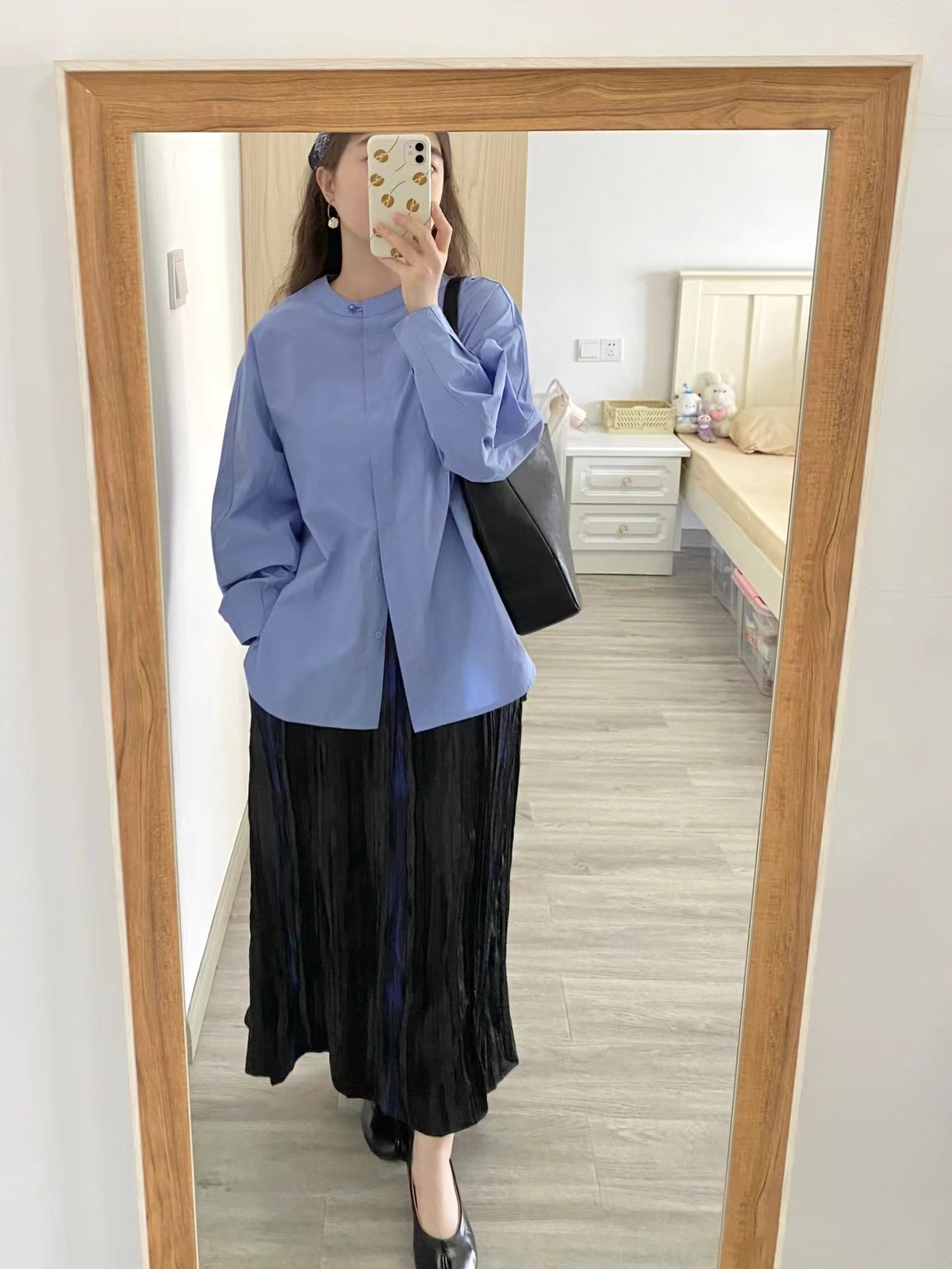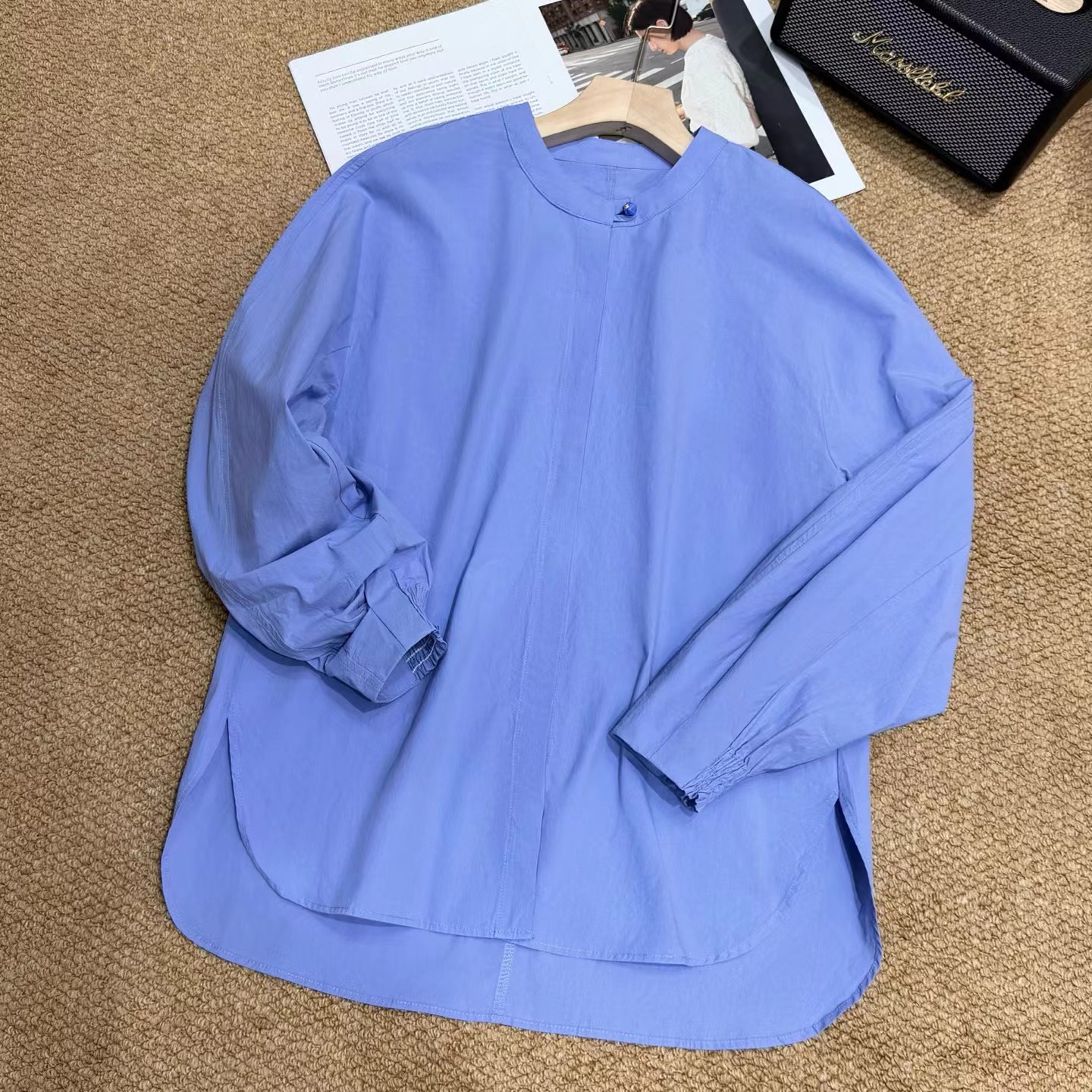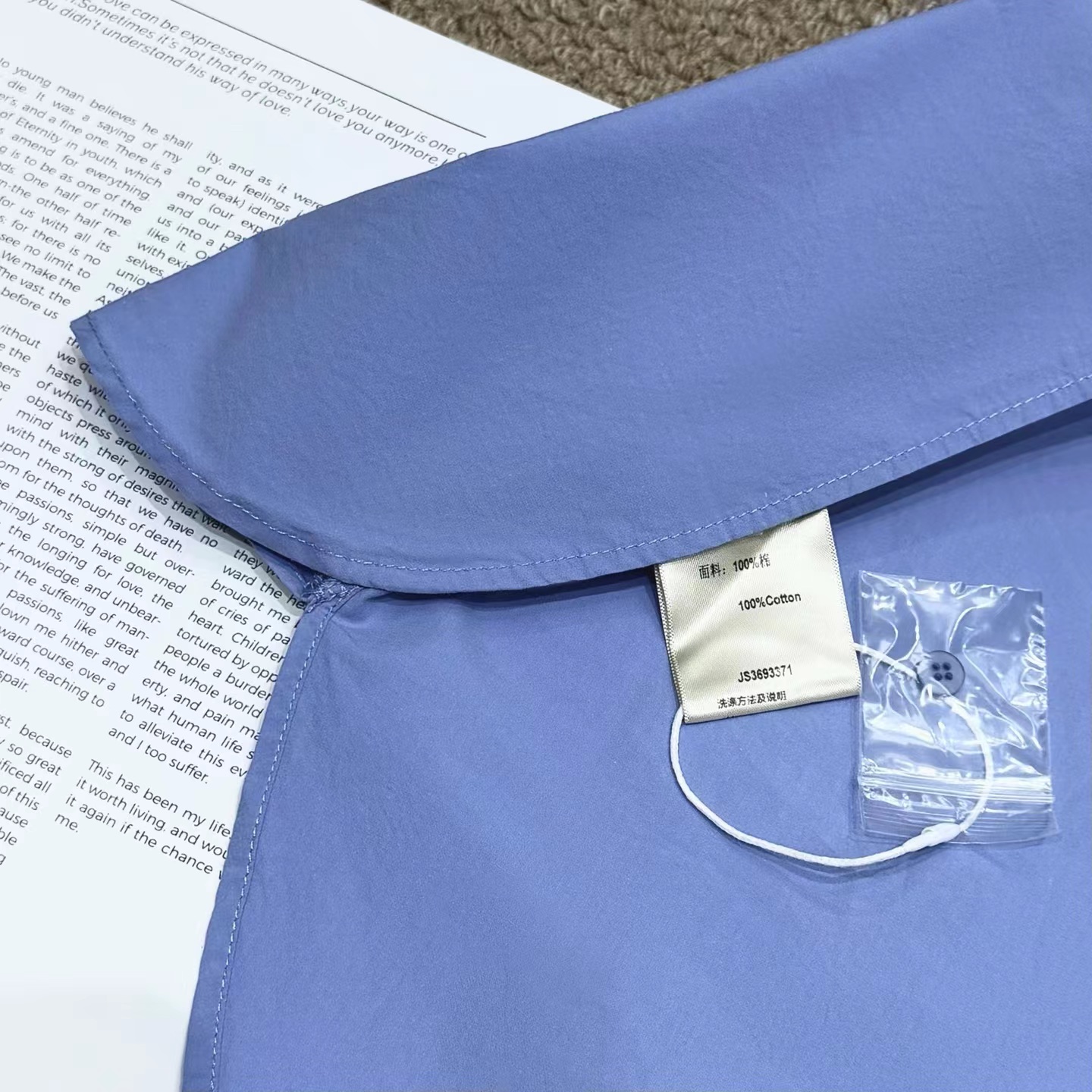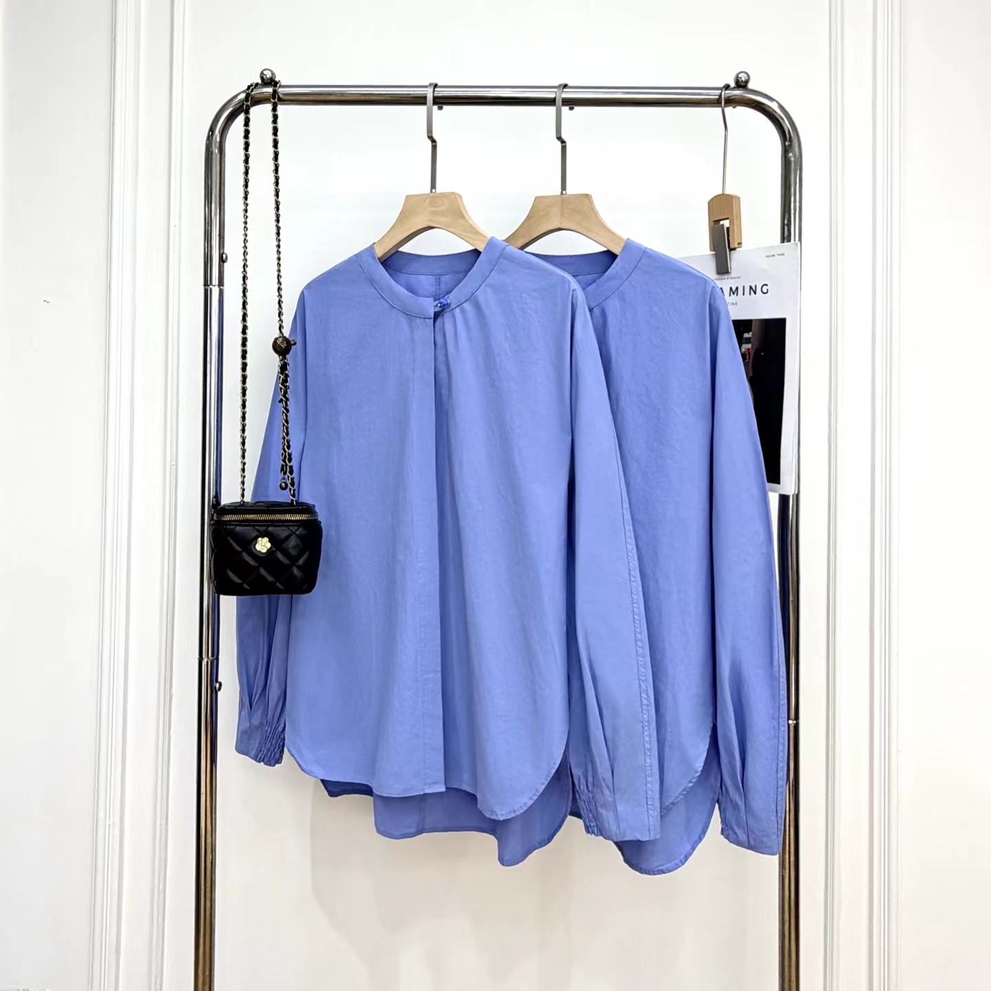 显白蔚蓝色~早春新款新中式设计感领口盘扣气质衬衫,轻中式风格的立领衬衫,采用小立领,利落贴合颈部线条,不会卡脖子,还能修饰脖颈比例,适配项链、耳饰等配饰。领口同色盘扣加入领部细节,保留中式雅致,又能适应日常实穿需求。宽松利落的外廓线条,克制而不拘束,双层隐藏式门襟精减细节,让外观干净简洁!长袖做了微收的灯笼袖处理,袖口收褶+木耳边装饰增加设计感,带点小俏皮感,一秒减龄!弧形开叉下摆,前短后长,两侧开叉,时髦有层次,更加修饰臀部线条,恰好遮住臀胯视觉显瘦,同时也方便掖进下装,利落干练。选用纯棉面料,质感棉柔且挺阔有型,易于日常打理!羔级又纯净的蓝色,颜色清新淡雅,上身有一种清冷的贵气感!搭配裤装裙装随意切换不同风格,特别喜欢,推荐