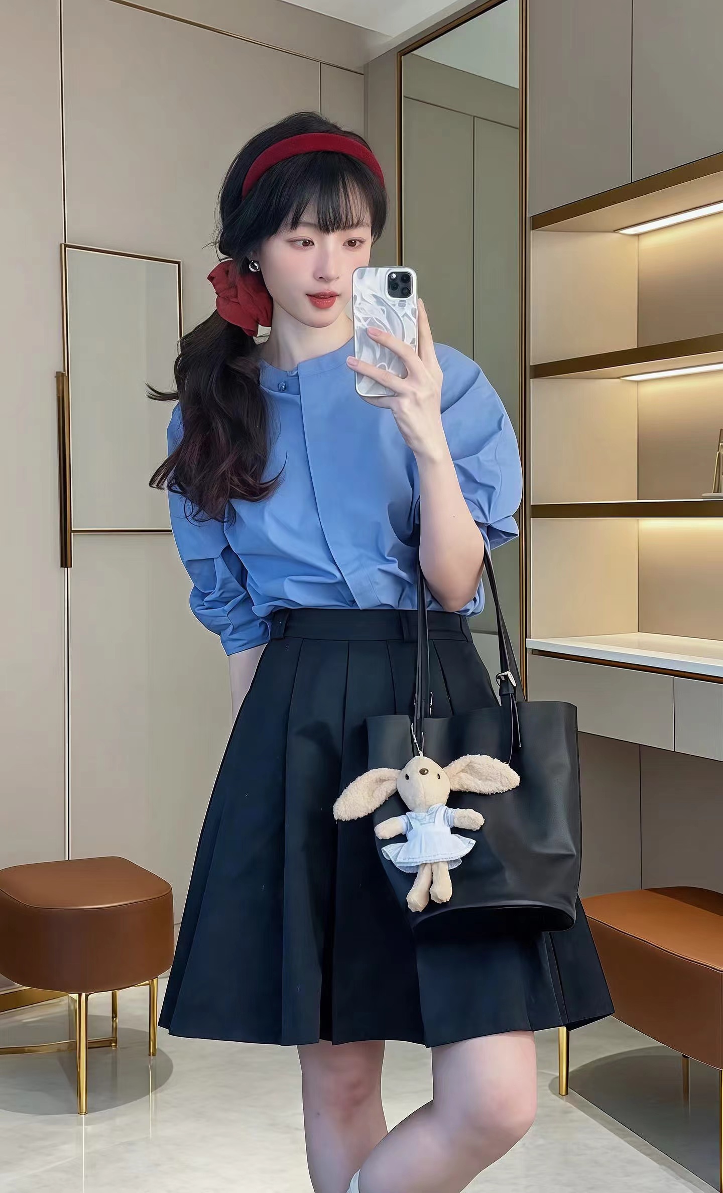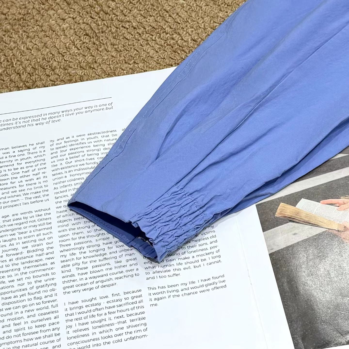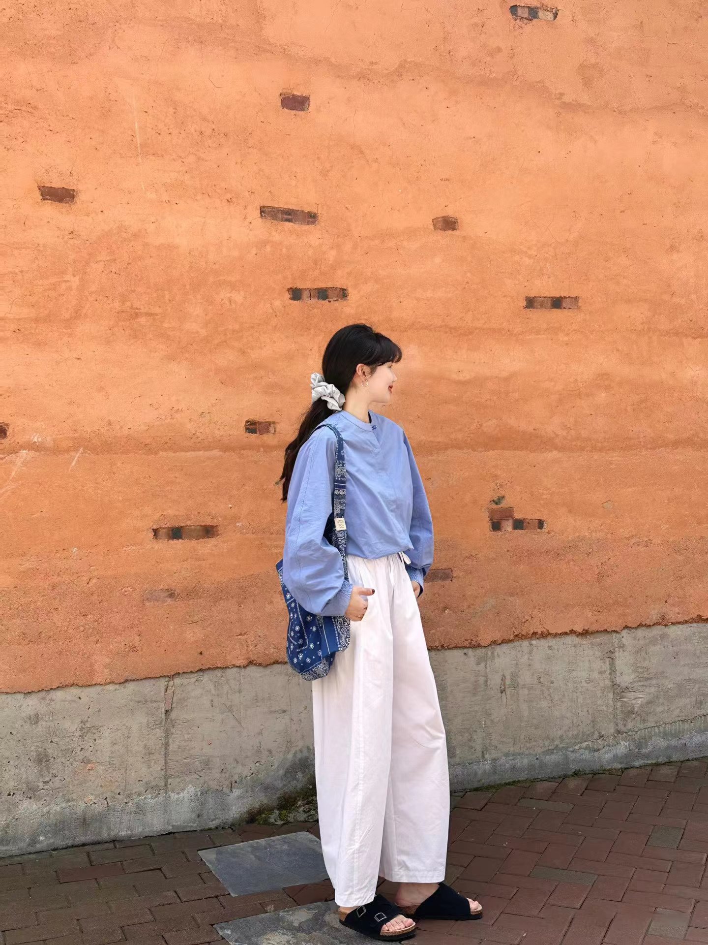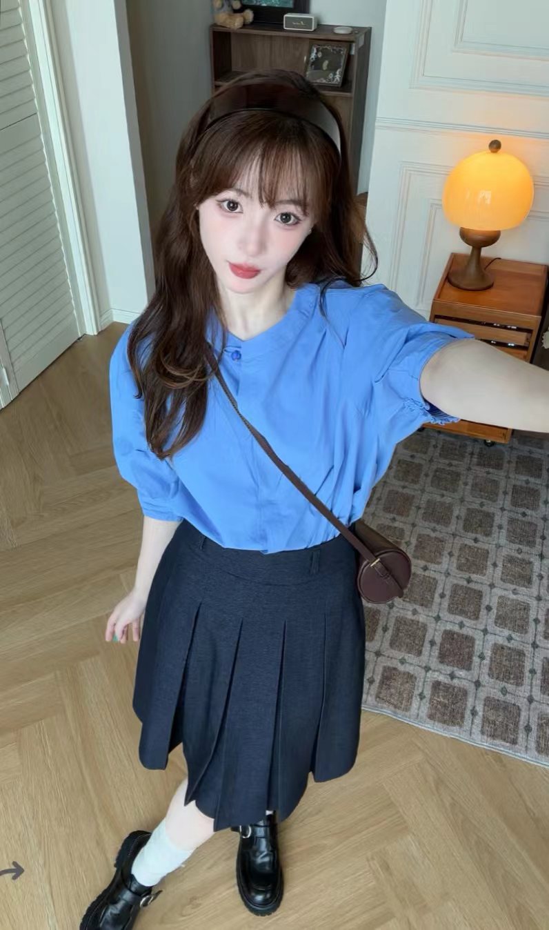显白蔚蓝色~早春新款新中式设计感领口盘扣气质衬衫,轻中式风格的立领衬衫,采用小立领,利落贴合颈部线条,不会卡脖子,还能修饰脖颈比例,适配项链、耳饰等配饰。领口同色盘扣加入领部细节,保留中式雅致,又能适应日常实穿需求。宽松利落的外廓线条,克制而不拘束,双层隐藏式门襟精减细节,让外观干净简洁!长袖做了微收的灯笼袖处理,袖口收褶+木耳边装饰增加设计感,带点小俏皮感,一秒减龄!弧形开叉下摆,前短后长,两侧开叉,时髦有层次,更加修饰臀部线条,恰好遮住臀胯视觉显瘦,同时也方便掖进下装,利落干练。选用纯棉面料,质感棉柔且挺阔有型,易于日常打理!羔级又纯净的蓝色,颜色清新淡雅,上身有一种清冷的贵气感!搭配裤装裙装随意切换不同风格,特别喜欢,推荐