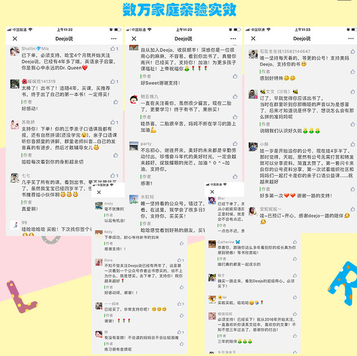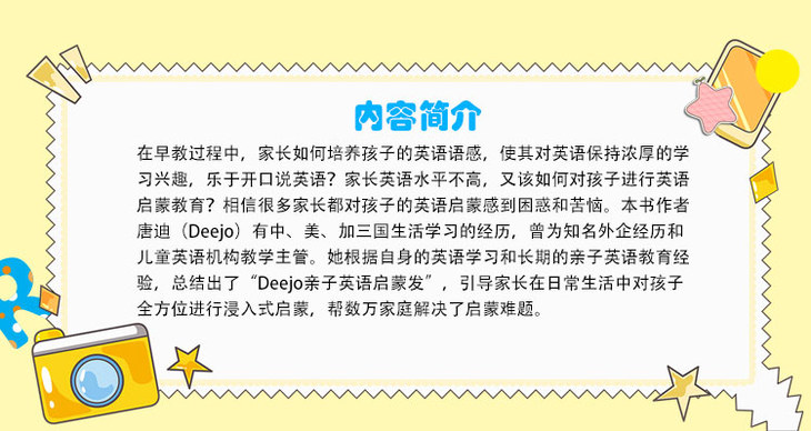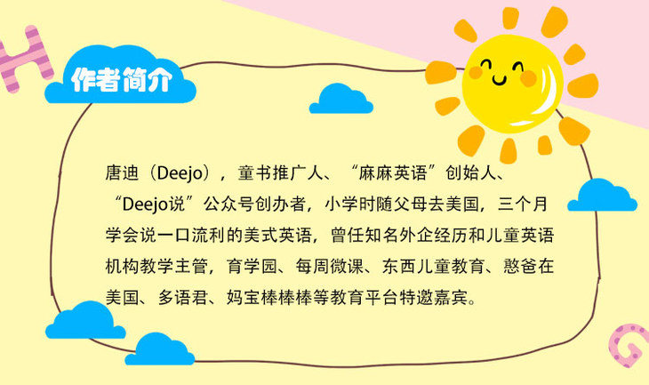 唐迪(Deejo),童书推广人、“麻麻英语”创始人、“Deejo说”公众号创办者,小学时随父母去美国,三个月学会说一口流利的美式英语,曾任知名外企经历和儿童英语机构教学主管,育学园、每周微课、东西儿童教育、憨爸在美国、多语君、妈宝棒棒棒等教育平台特邀嘉宾。