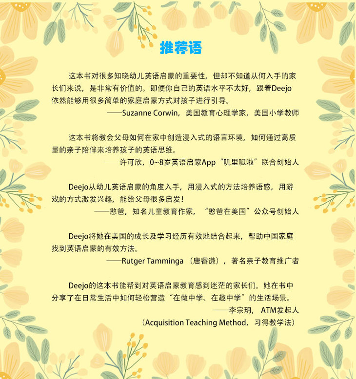 在早教过程中,家长如何培养孩子的英语语感,使其对英语保持浓厚的学习兴趣,乐于开口说英语?家长英语水平不高,又该如何对孩子进行英语启蒙教育?相信很多家长都对孩子的英语启蒙感到困惑和苦恼。本书作者唐迪(Deejo)有中、美、加三国生活学习的经历,曾为知名外企经历和儿童英语机构教学主管。她根据自身的英语学习和长期的亲子英语教育经验,总结出了“Deejo亲子英语启蒙发”,引导家长在日常生活中对孩子全方位进行浸入式启蒙,帮数万家庭解决了启蒙难题。