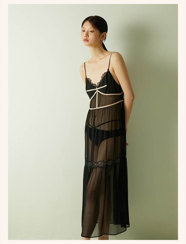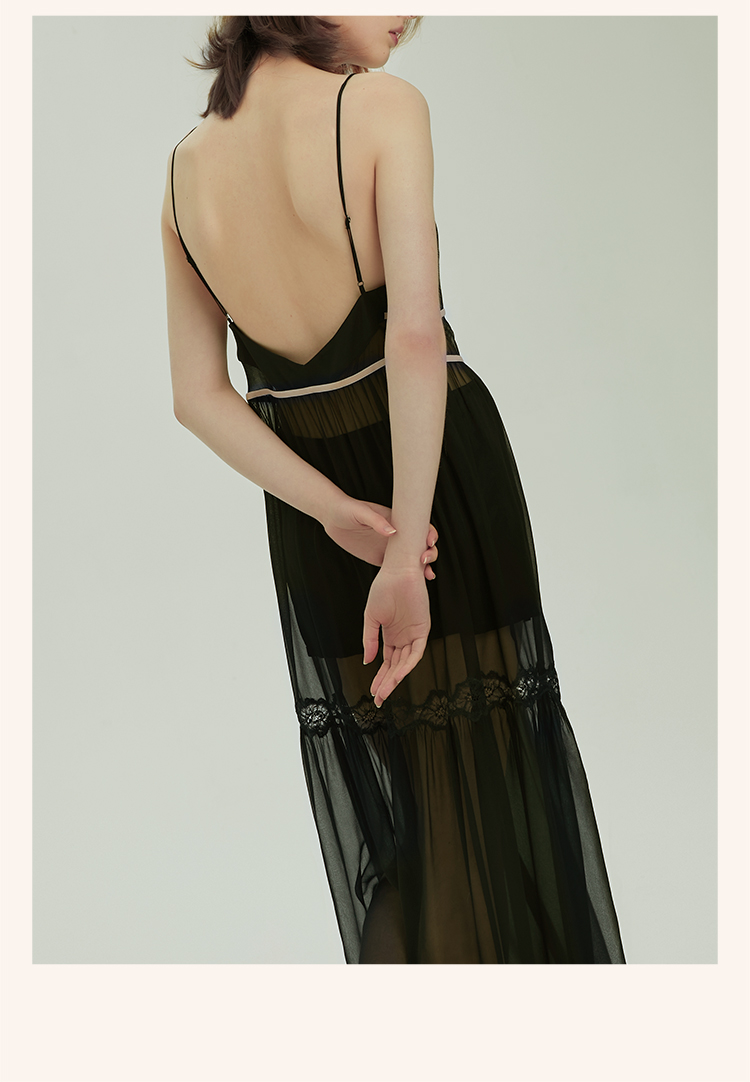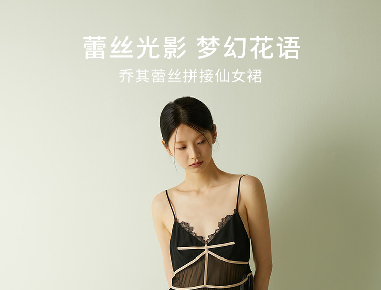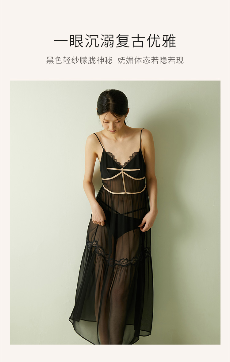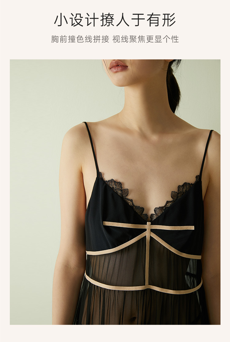 桑罗真丝蕾丝吊带睡裙法式V领黑色轻性感微透镂空约会战衣