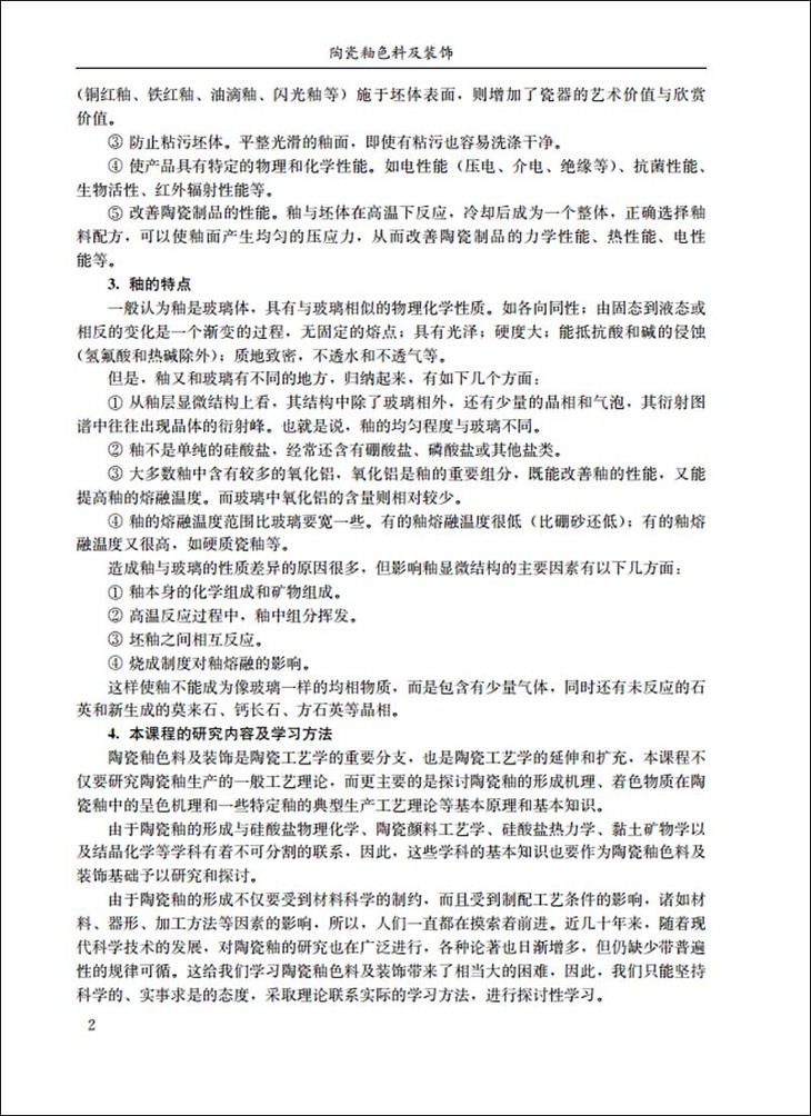 远古以来人类就以各种器物之造型、美术图案来美化生活,考古学家把陶瓷及其装饰视为重要的研究领域。今天在陶瓷色釉料与装饰研究方面已取得极大进展,人们可以根据陶瓷制品的胎体质地、造型、表面装饰要求等,来选择适合的色釉料来装饰。随着科学技术的发展,各种装饰方法及装饰材料层出不穷,本教材在编写过程中也尽量给予收录,同时阐述了一些装饰色釉料的形成机理。