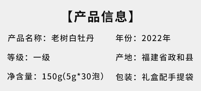 品政韵(原添寿白茶)丨老树白牡丹 政和白茶 2022年 特级 150g(5g*30泡)礼盒装 配手提袋