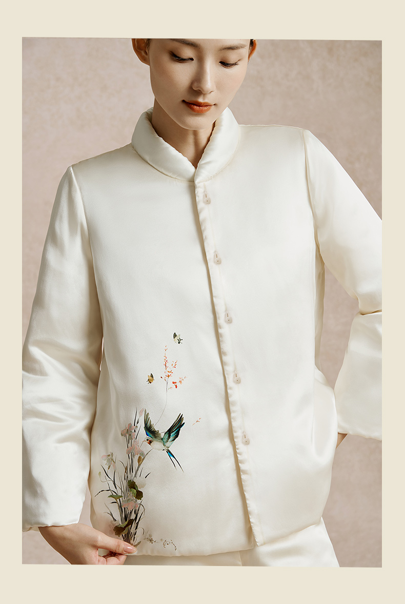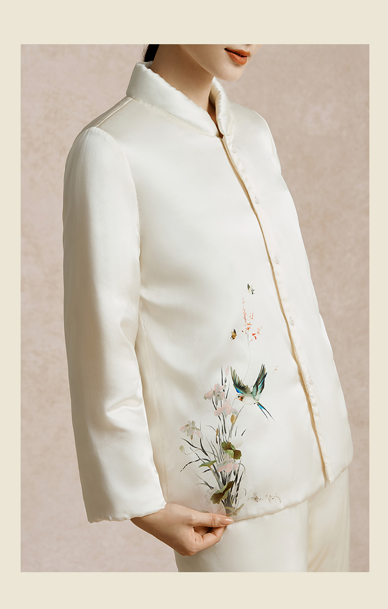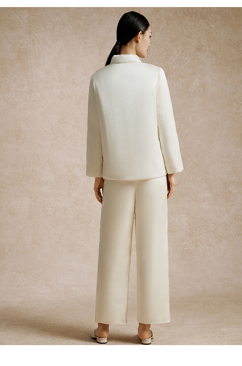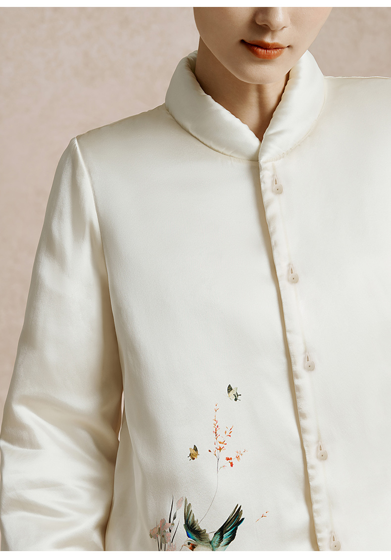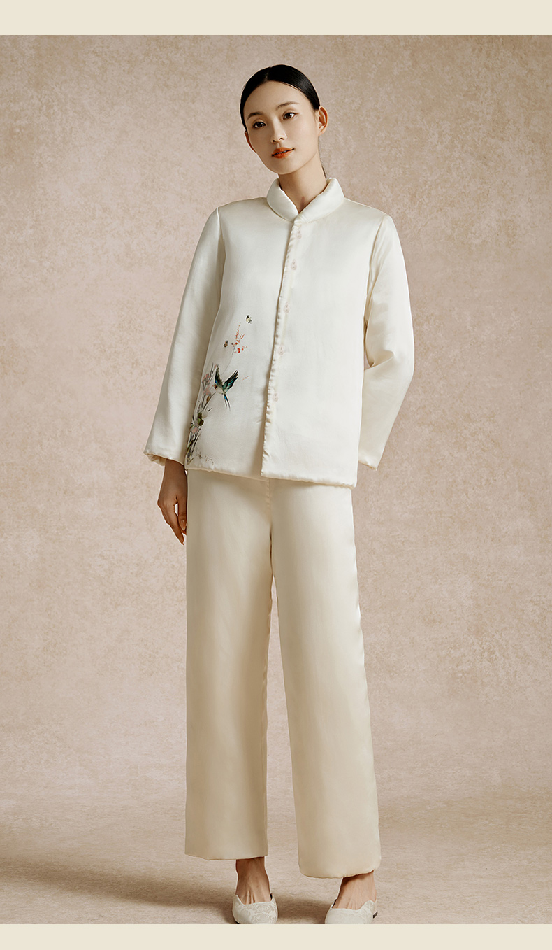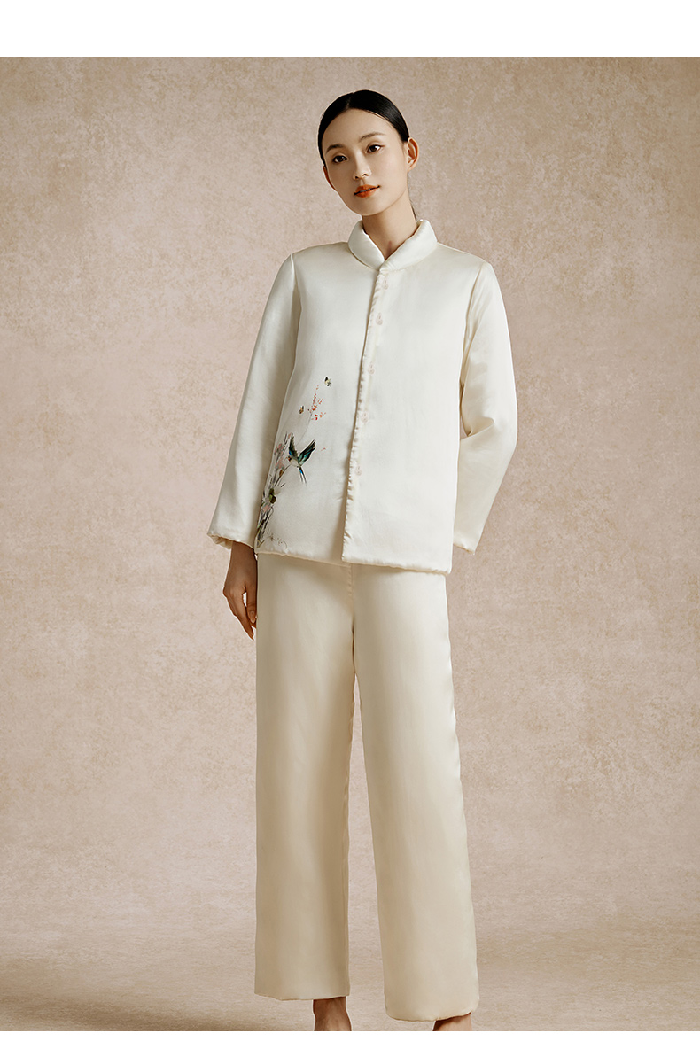 金三塔100%桑蚕丝夹绵印花保暖衣裤套装女中式立领轻奢缎面睡衣 YSFED205