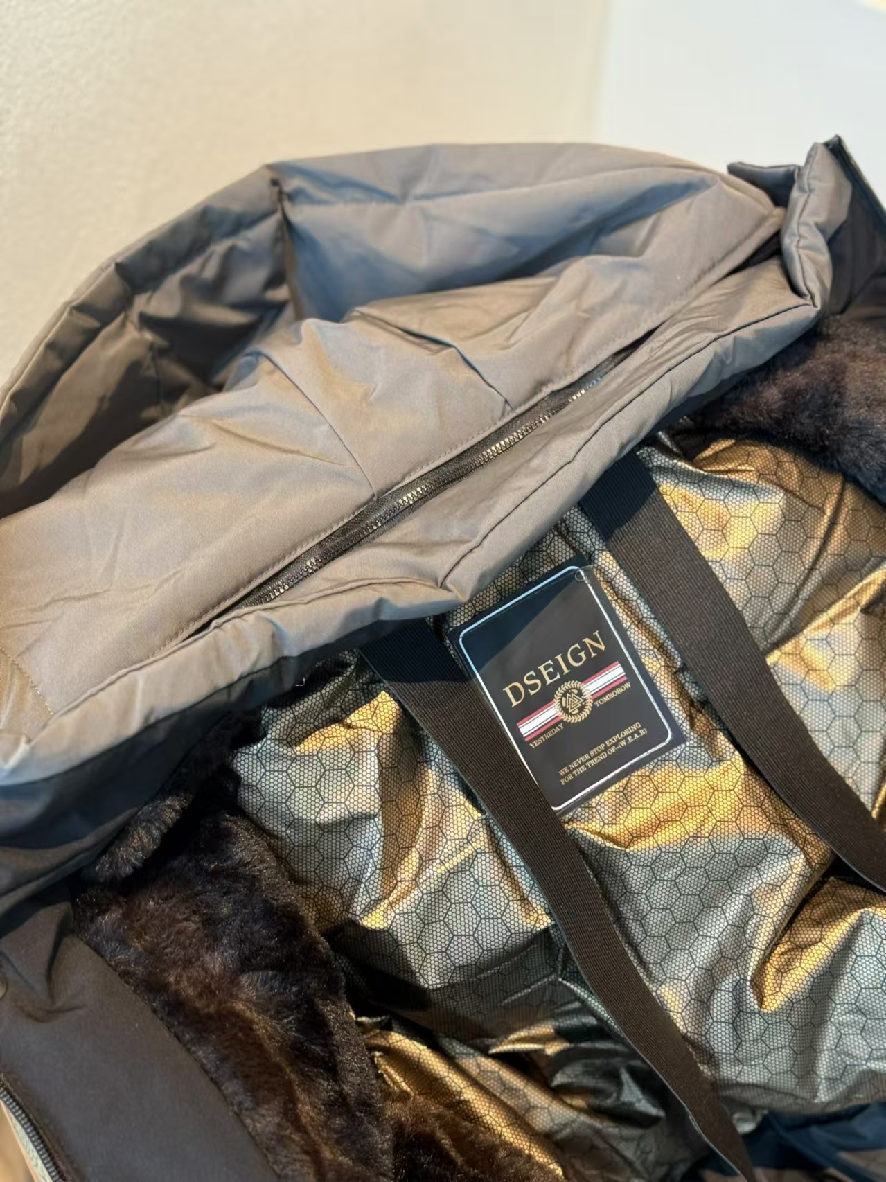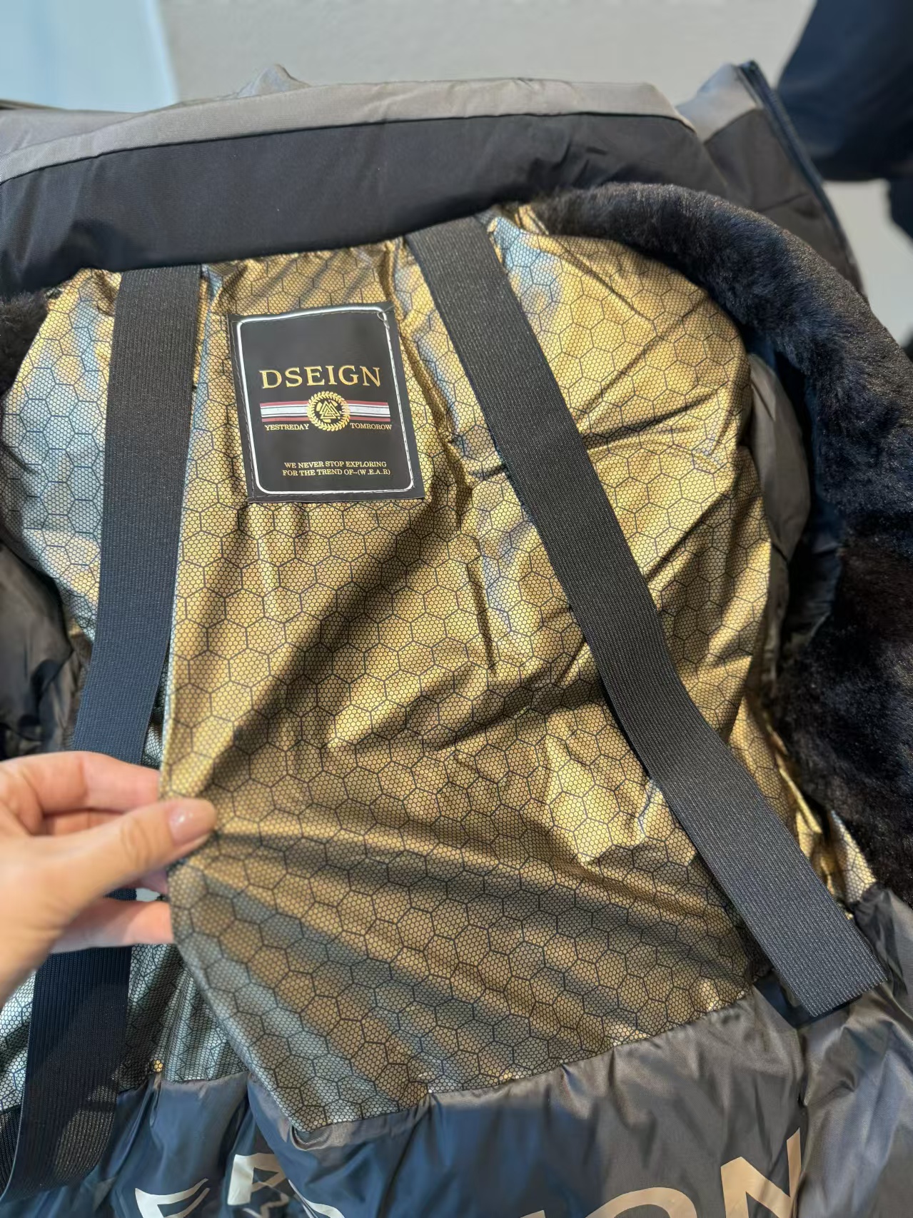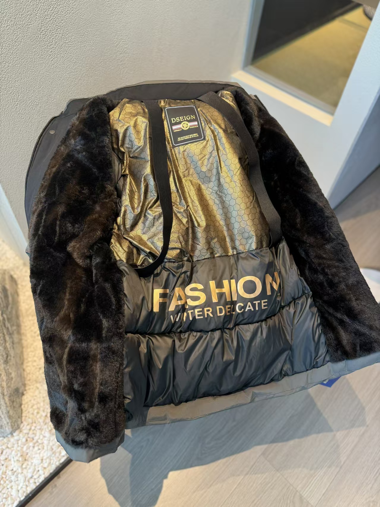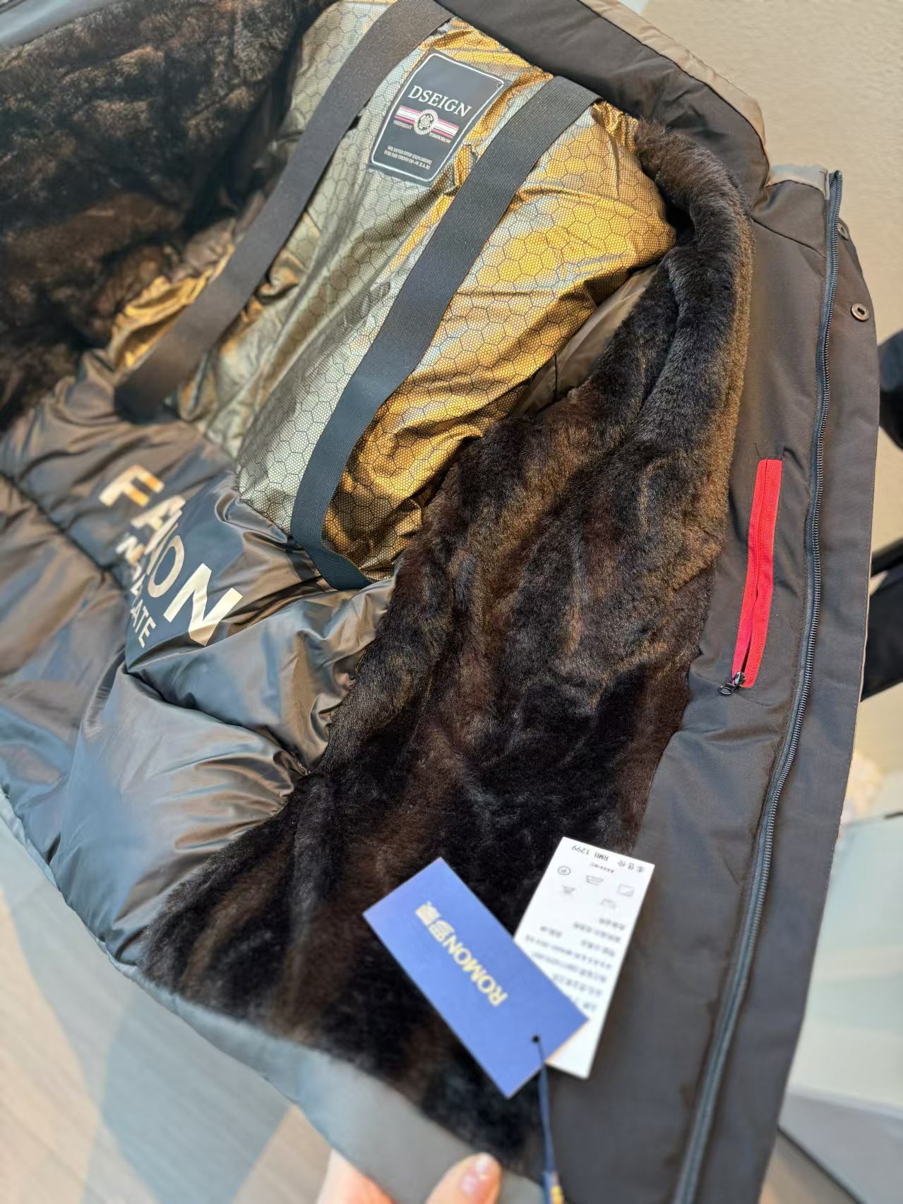 🔹衣身填充羽丝棉,前身两侧仿水貂绒