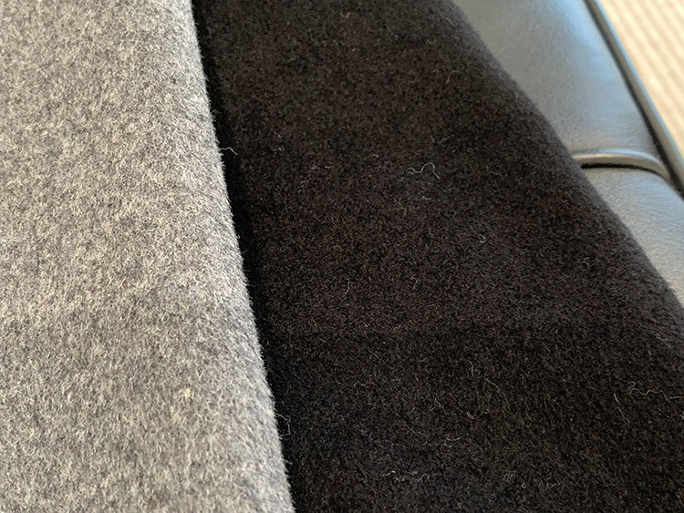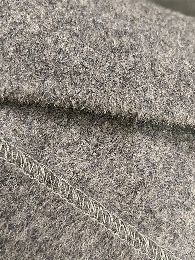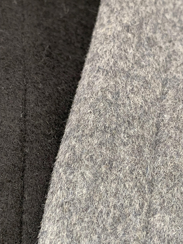 羊毛羊绒混纺,手感柔软饱满,能够自然回弹,挺括干爽,筋骨感好,面料表面细腻柔软,亲肤性好,微磨绒呢感工艺处理,手感更上一个台阶。