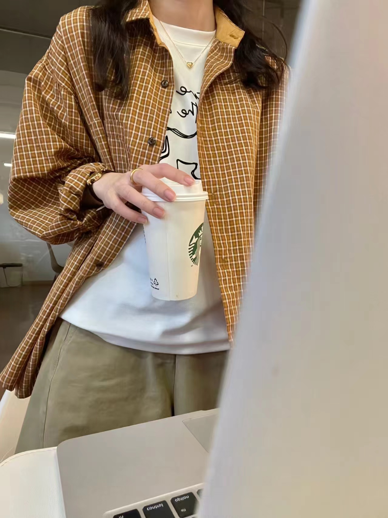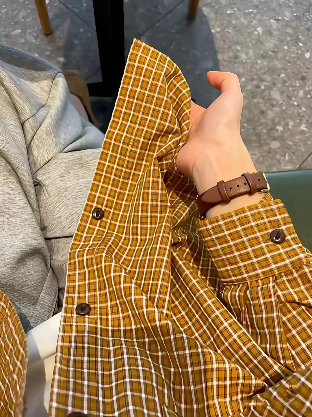 显白姜黄格纹~ 2026新款幂式港风复古小众松弛感宽松百搭荃棉防晒衬衣,格子衬衫真的超适合春夏!!春夏就需要这种不挑场合的单品格子衬衫,颜色选用暖调暖棕黄,以浅米白为格纹基底交织出柔和复古的视觉效果,低饱和色调不挑肤色,黄皮也能轻松驾驭,既摆脱纯色的单调又比亮色更显温柔,内里搭配一件白T就非常好看了!以复古松弛感为he心设计,版型上采用宽松落肩剪裁,既能藏住手臂赘肉,不挑身材,又自带慵懒随性质感,兼顾实用性与复古细节,弧形下摆增添随性氛围!面料为轻薄棉质,带有细微肌理感,透气亲肤,春夏可单穿,秋冬可作内搭,实用性拉满打造日系慵懒感,休闲风可内搭白T,下搭灰色阔腿裤或牛仔半裙,脚踩帆布鞋,打造日系慵懒感。也可作防晒外套,搭配吊带裙与凉鞋,清爽又出片,是衣橱里四季都能穿的百搭单品。