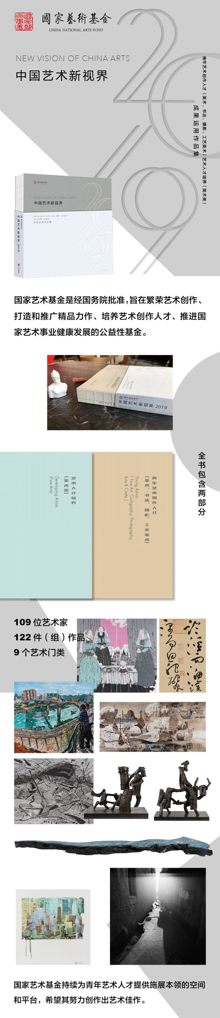 本书将借由“中国艺术新视界2019——国家艺术基金青年艺术创作人才(美术、书法、摄影、工艺美术)成果运用作品巡展”,对获得滚动资助项目的作品集结成册。这些作品反映了当下我国青年艺术工作者的思考探索和创新实践,也为了解我国青年艺术创作的新特点提供新的视野。