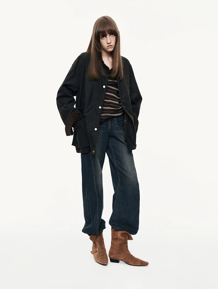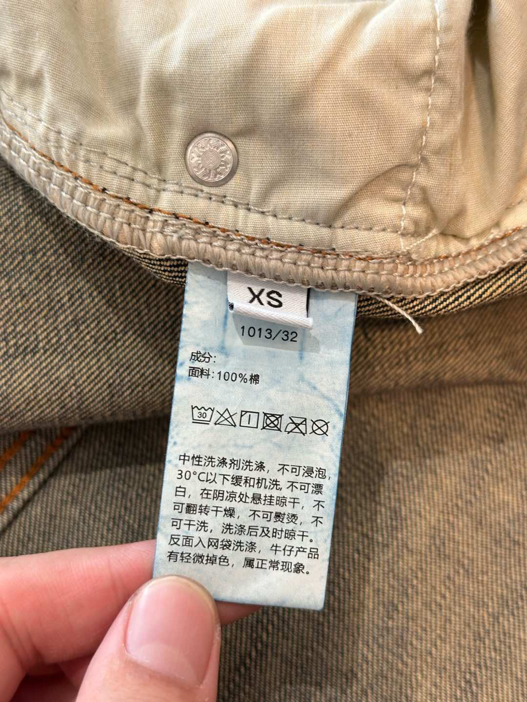 面料甄选100%棉纱经传统环锭纺纱制成,匠心保留自然棉纱的纯粹与舒软天性,拥有饱满蓬松的棉感质地,后经美国康龙绳染技术、猫须、多位手擦砂、酵磨漂、多位马骝、套色、固色、软化等多道后整工序打磨而成,还原原始牛仔的粗犷风格,落色层次轻重交替有层次,面料质地结构紧实,软硬有致,洗褪/磨白等做旧细节,均模拟时光磨损痕迹,旦因手工成分,件件不一样,每一件都是个性。