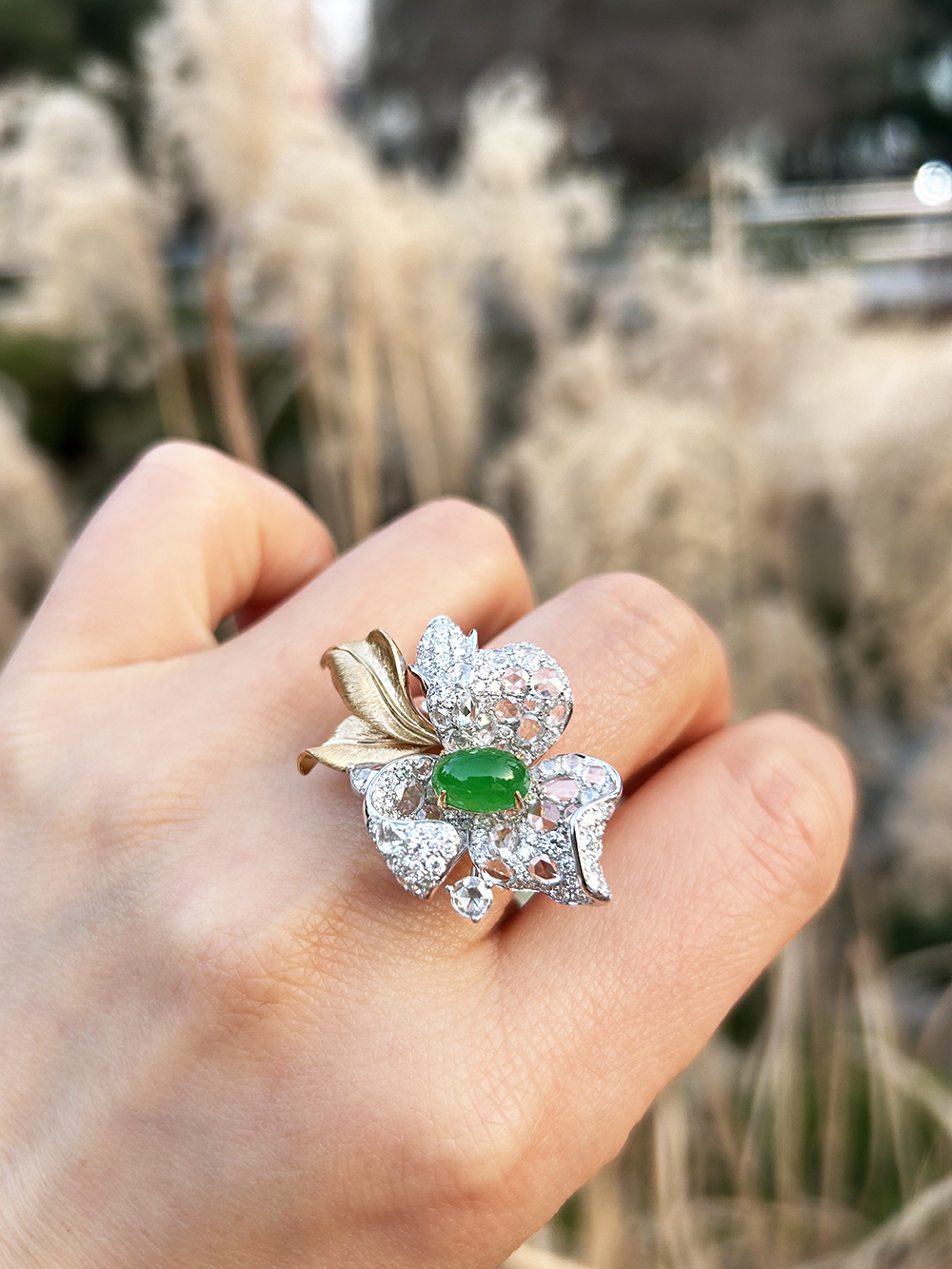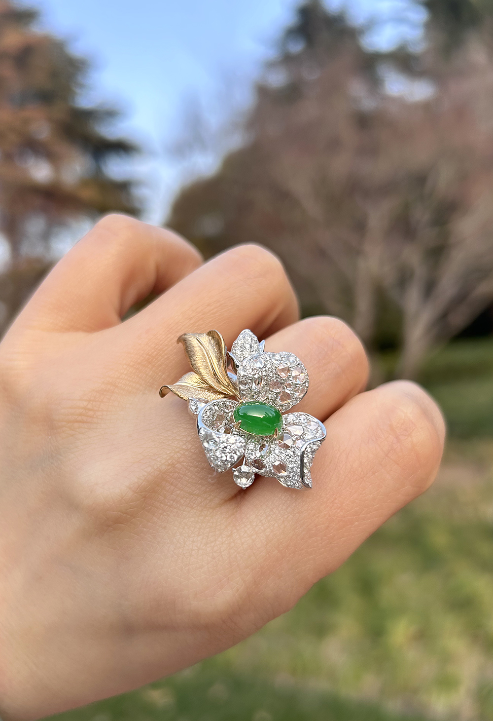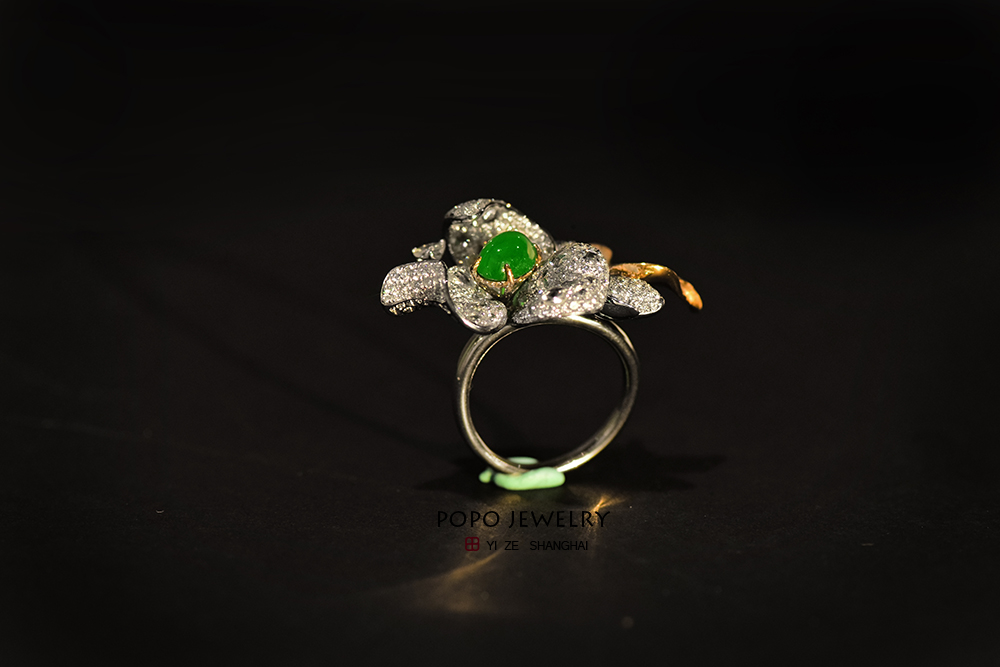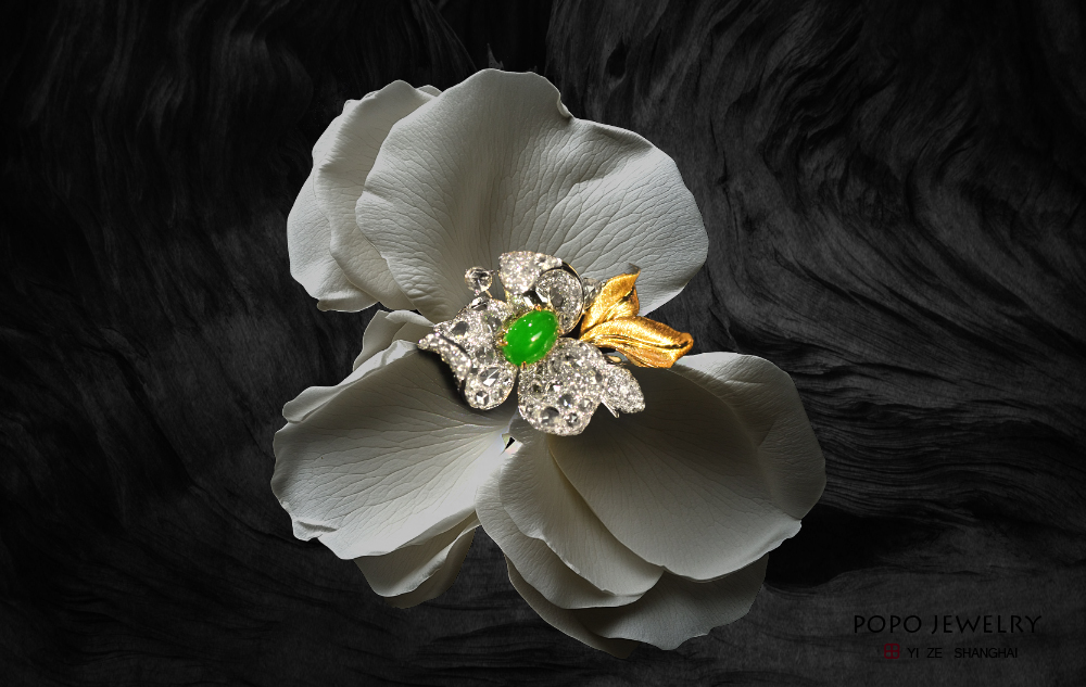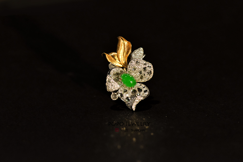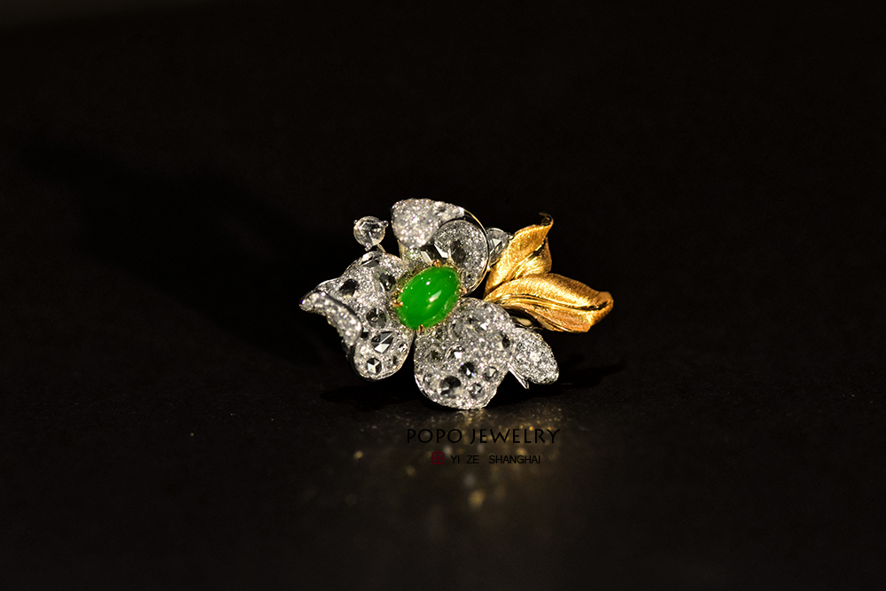 将一颗阳绿翡翠摆放在花朵的C位,
