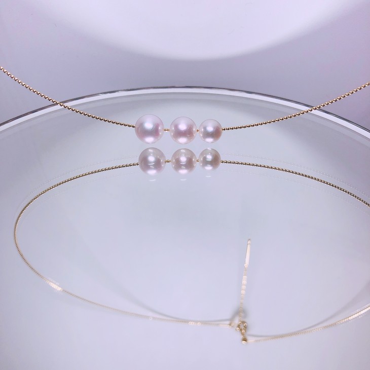 三粒6.5、7.5、8.5mm直径的粉晕Akoya 珍珠穿在18k可调节长度的金项圈上,俏皮甜美,简洁明快,是适合日常配戴的百搭美物。